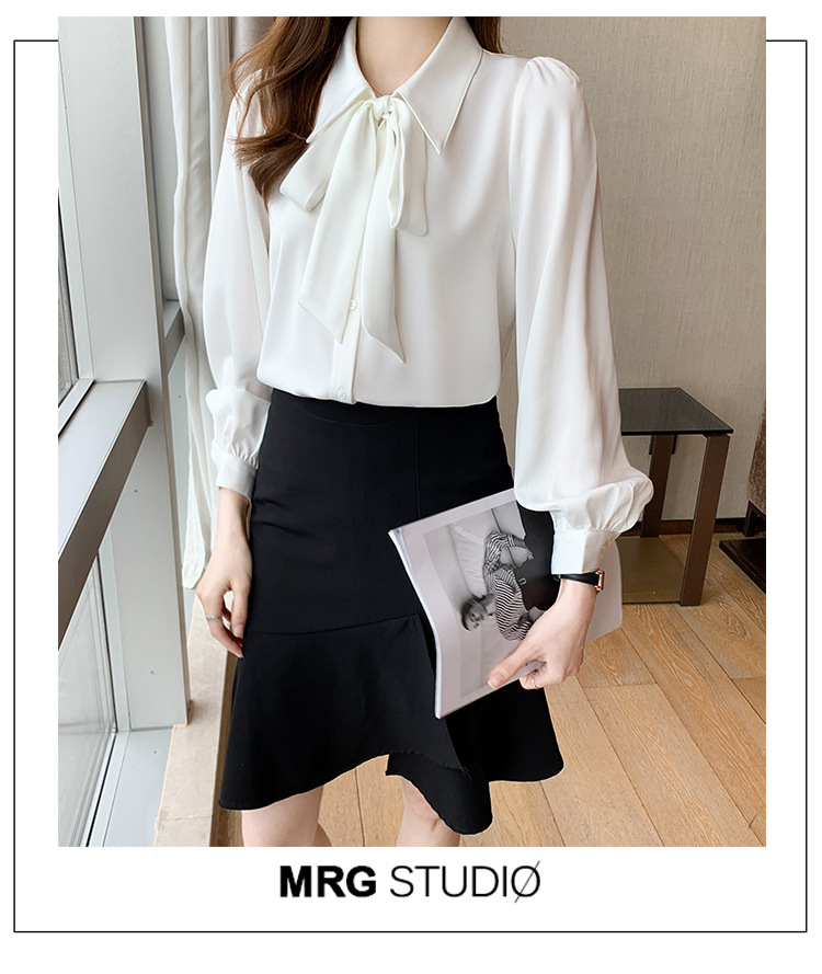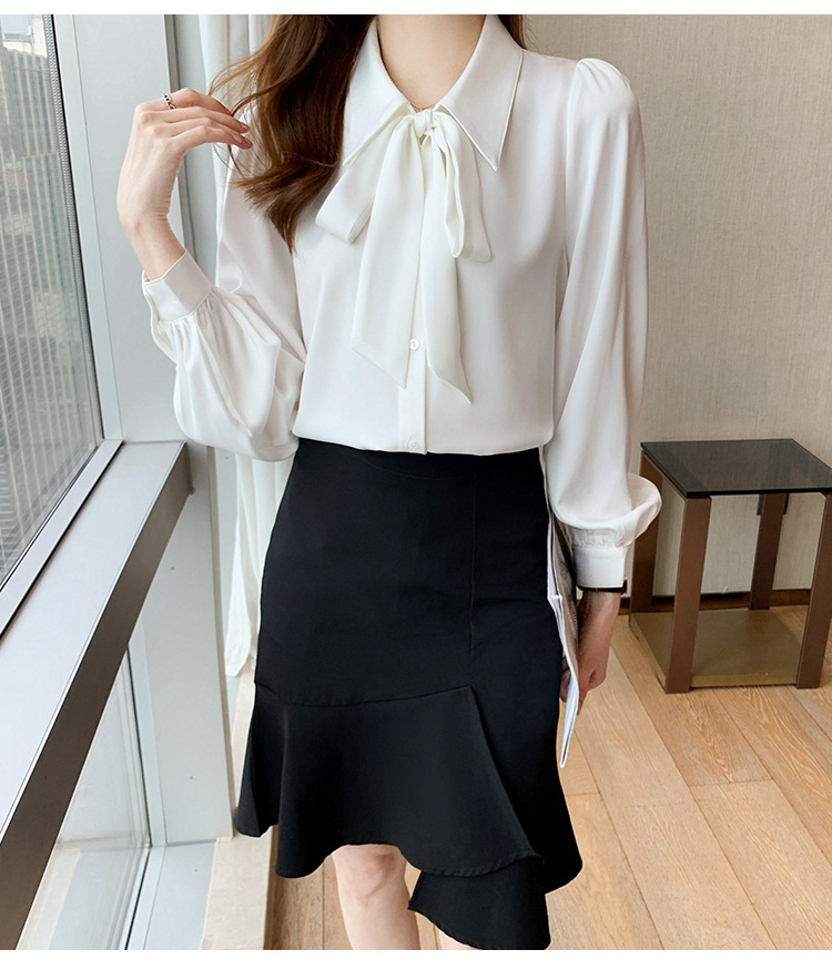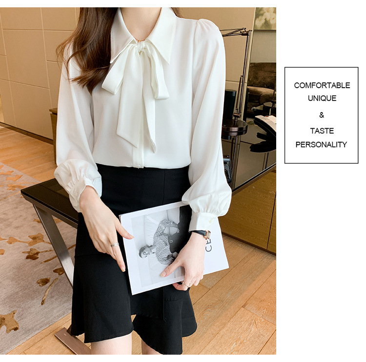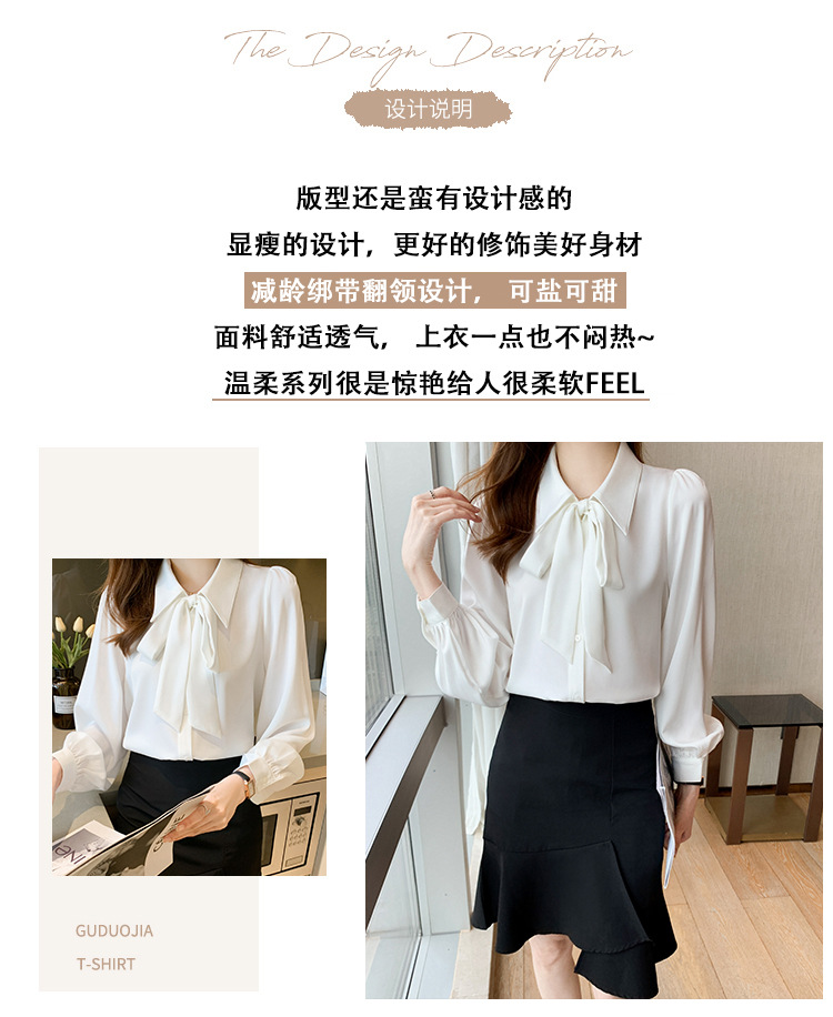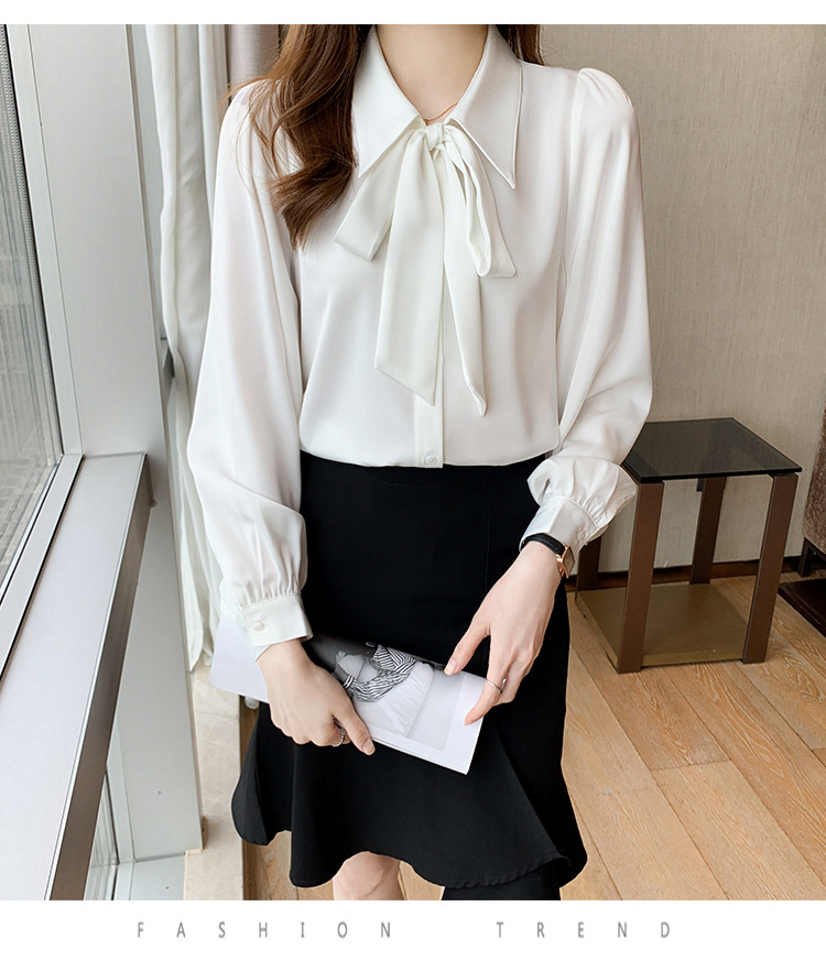 가을 2023 화이트 긴팔 쉬폰 셔츠 여성용 스몰 바디 드레이핑 한국 스타일 리본 탑 젠틀 스타일 셔츠