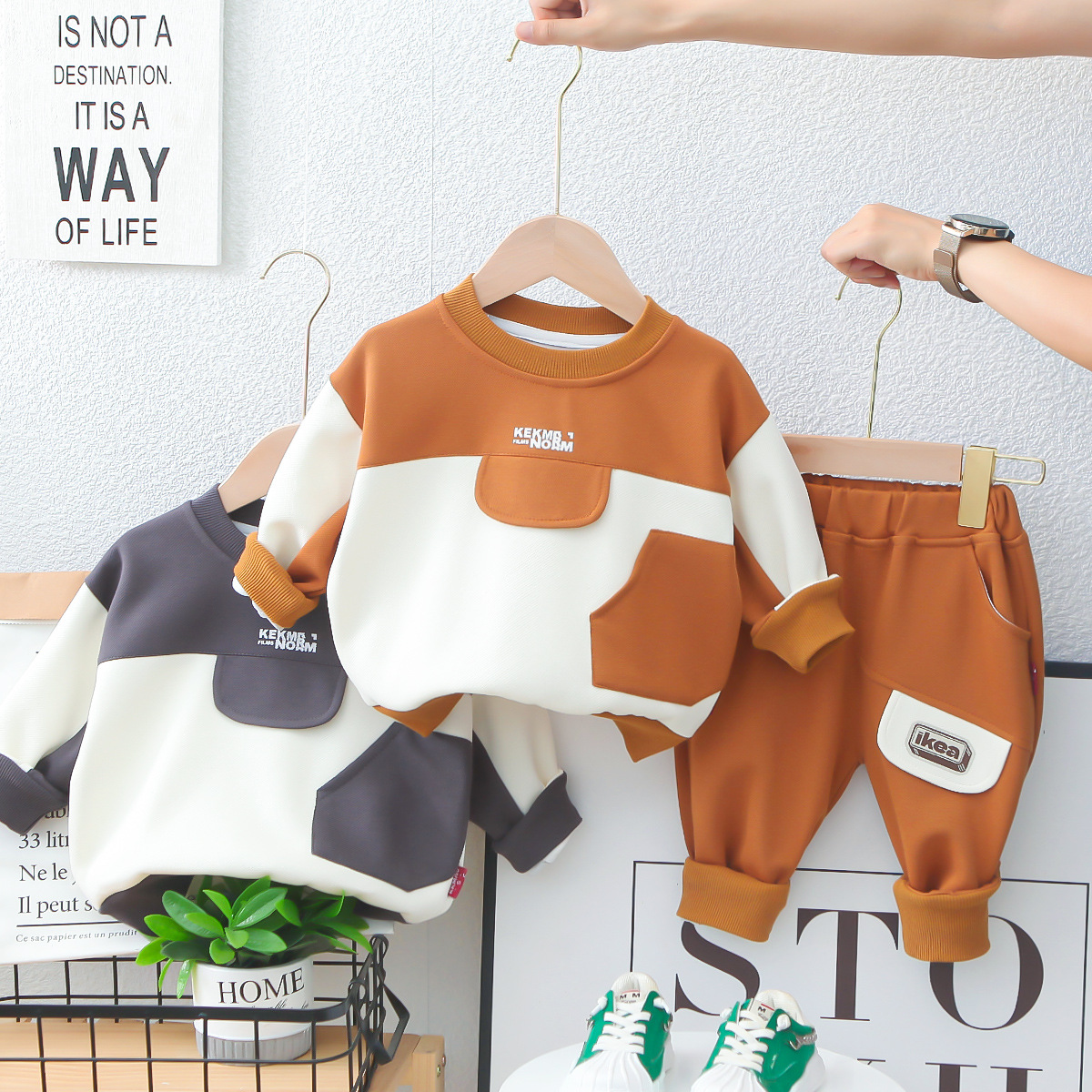 가을 새로운 잘 생긴 소년 패치 워크 컬러 스웨터 한국 잘 생긴 아동복 가을 아기 투피스 세트 배치