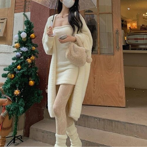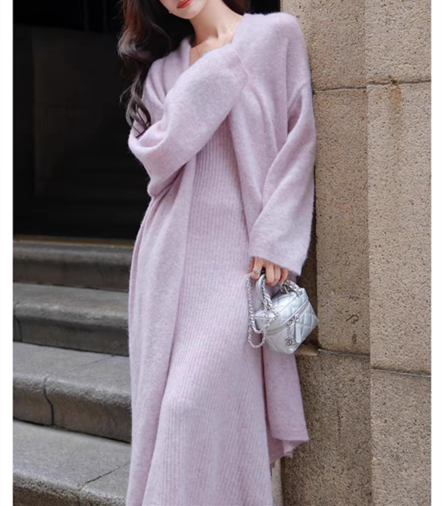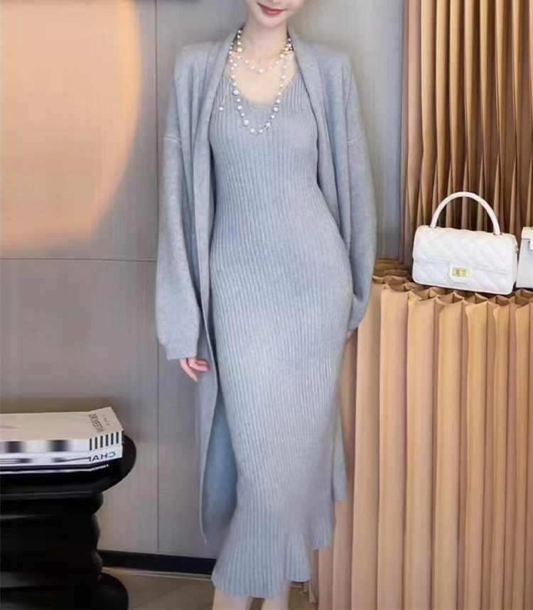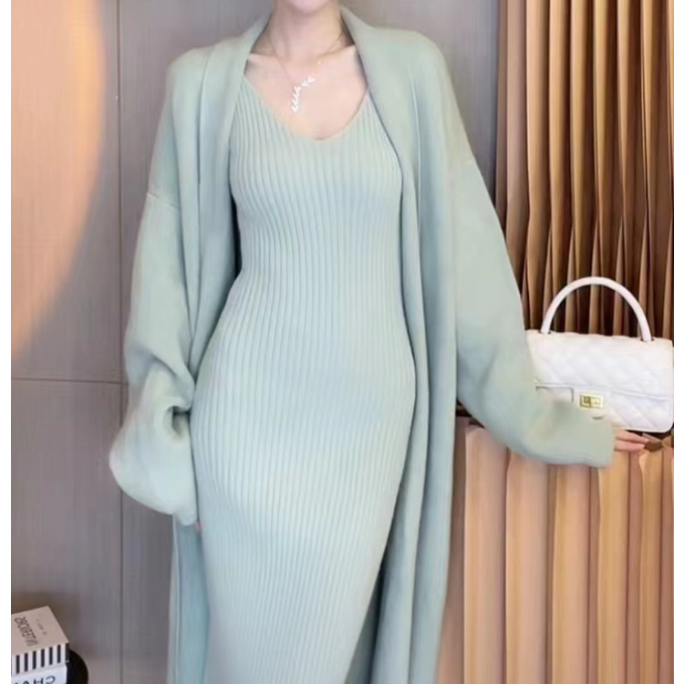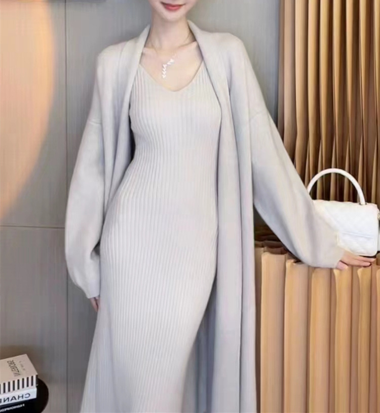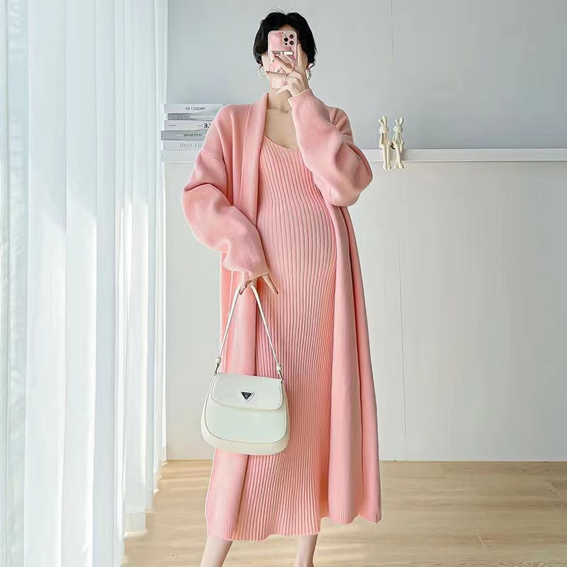 이른 가을 게으른 스타일 긴 카디건 투피스 세트 여자의 유행 느슨한 긴 우아한 니트 원피스 임신 한 여자의 의류스토어 가기