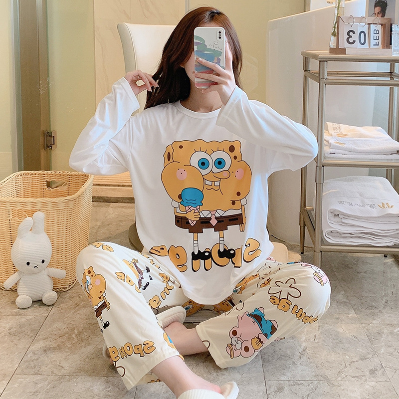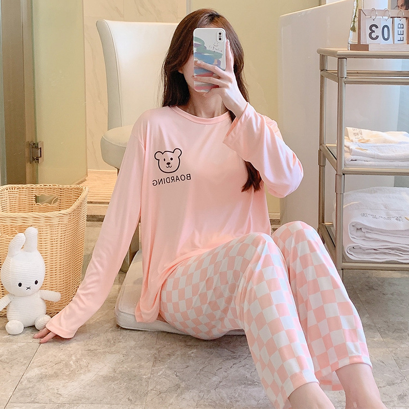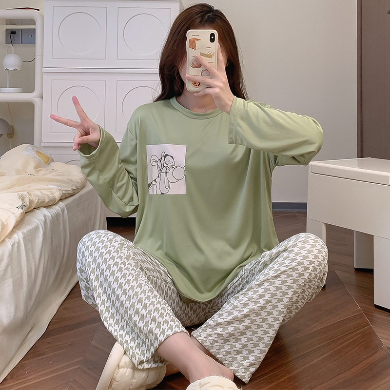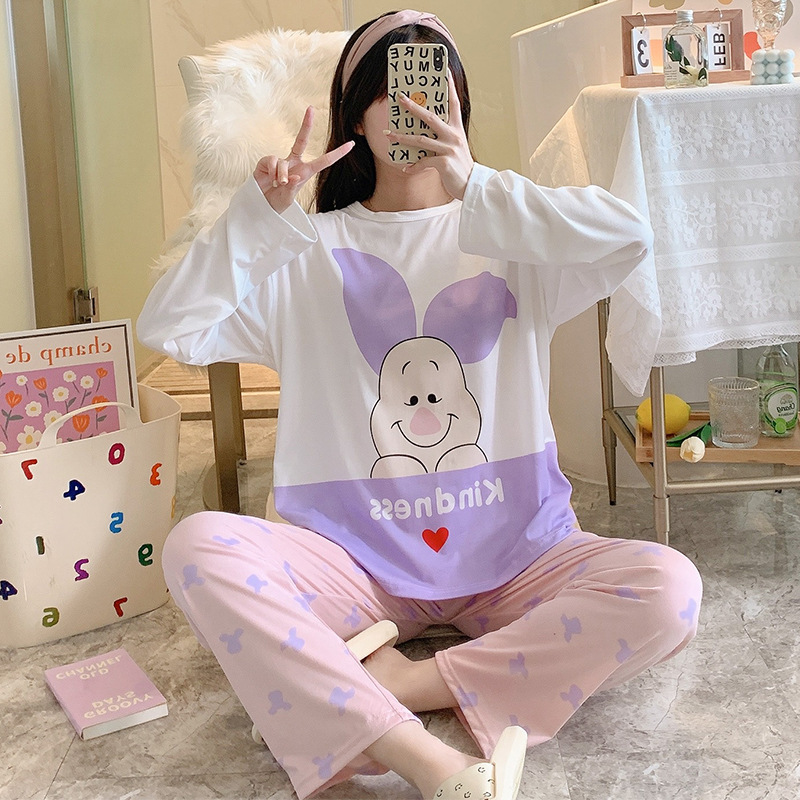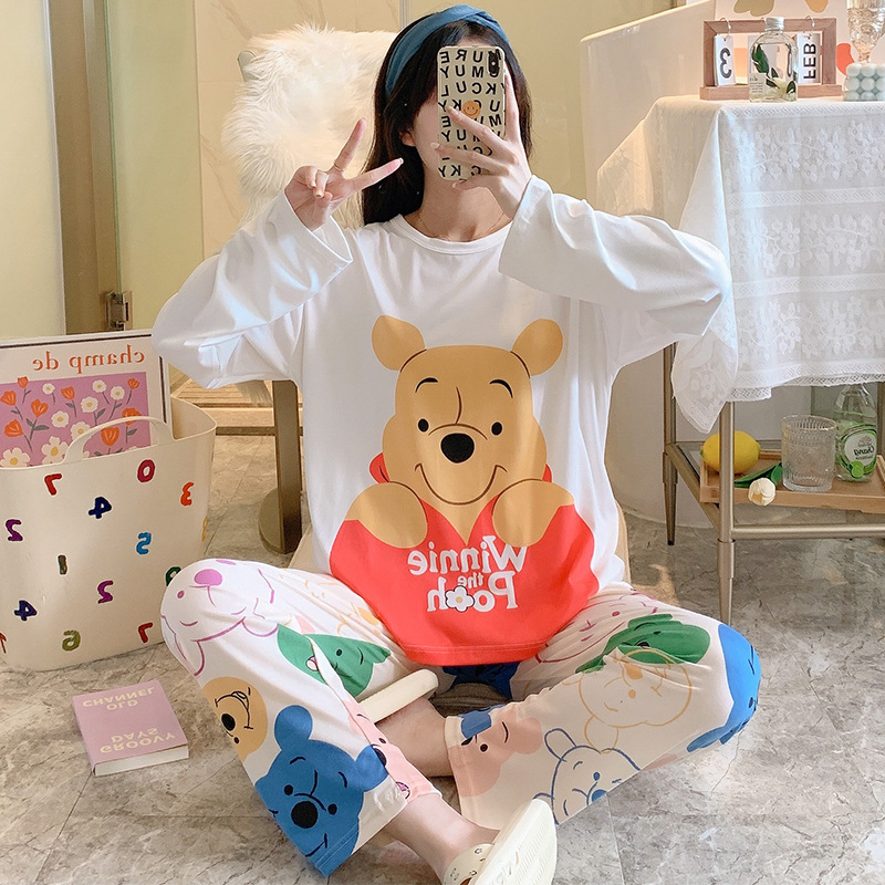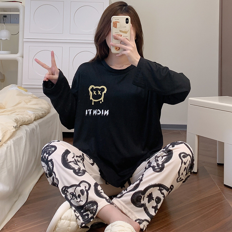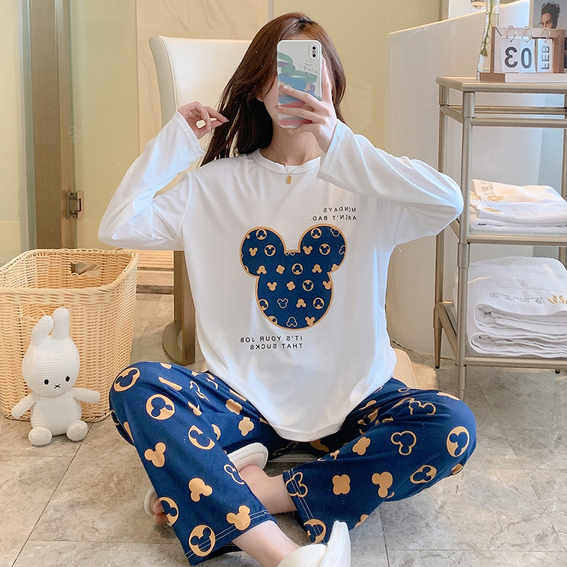 잠옷 여자의 가을 긴팔 바지 투피스 세트 한국식 귀여운 만화 캐주얼 느슨한 아웃웨어 세트