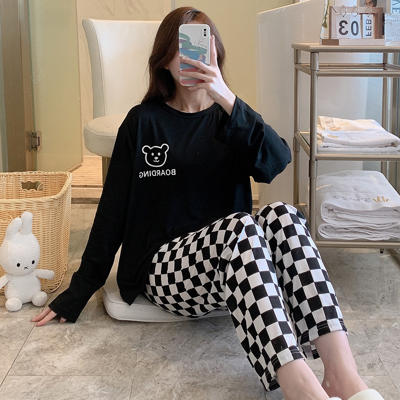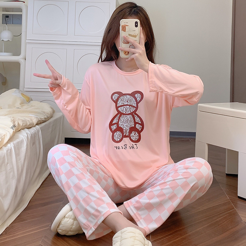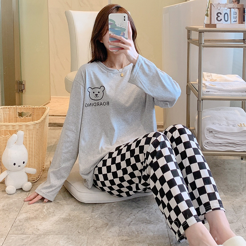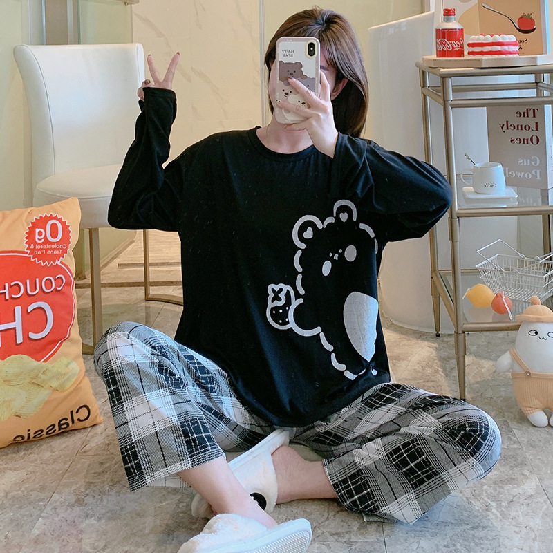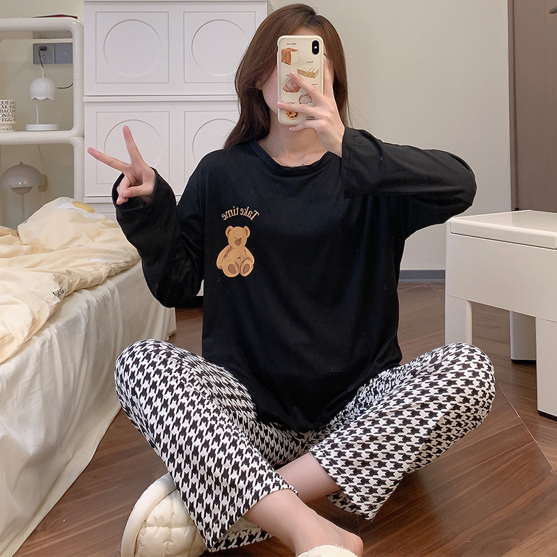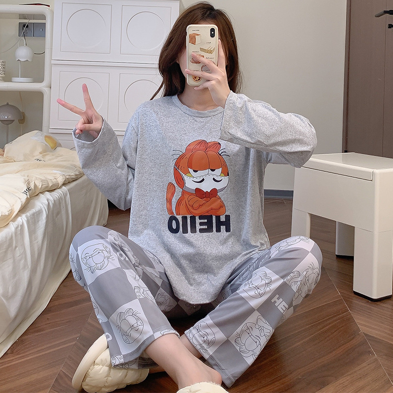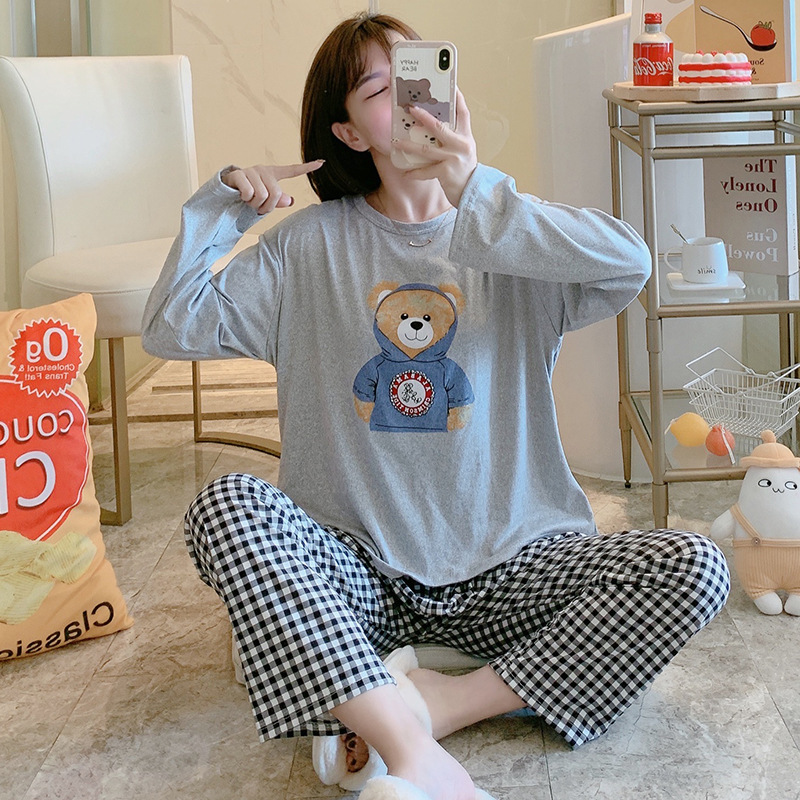 잠옷 여자의 가을 긴팔 바지 투피스 세트 한국식 귀여운 만화 캐주얼 느슨한 아웃웨어 세트스토어 가기