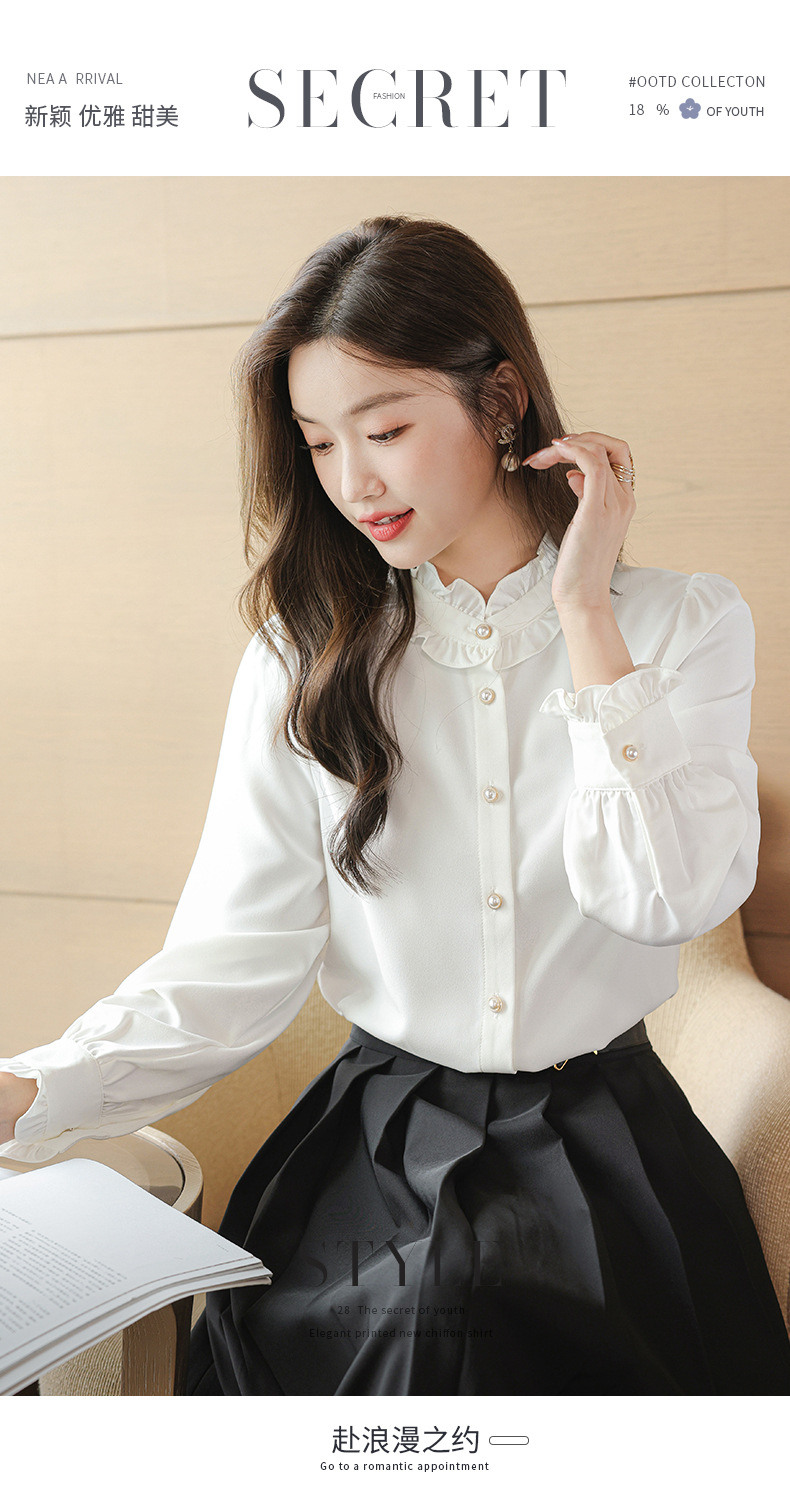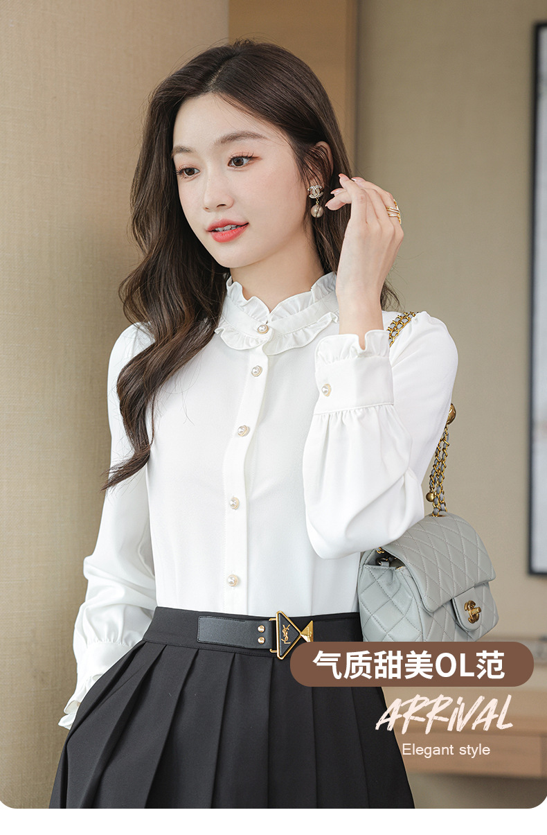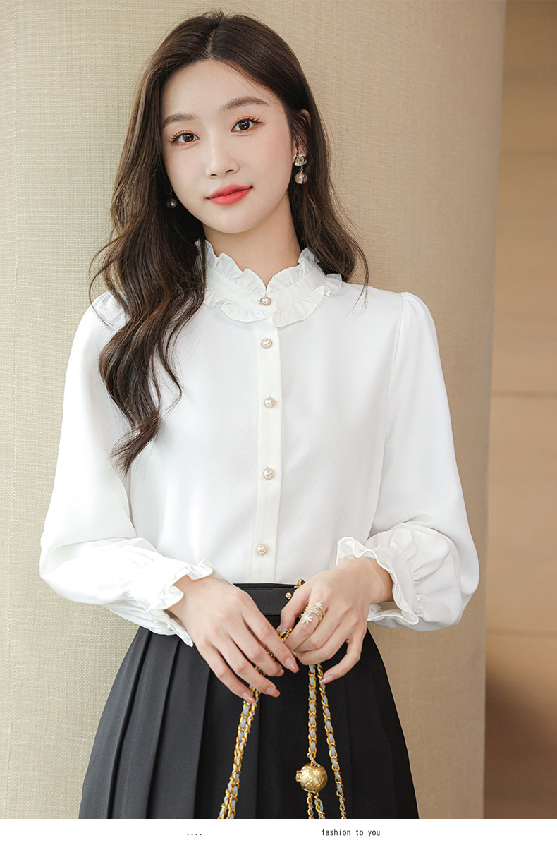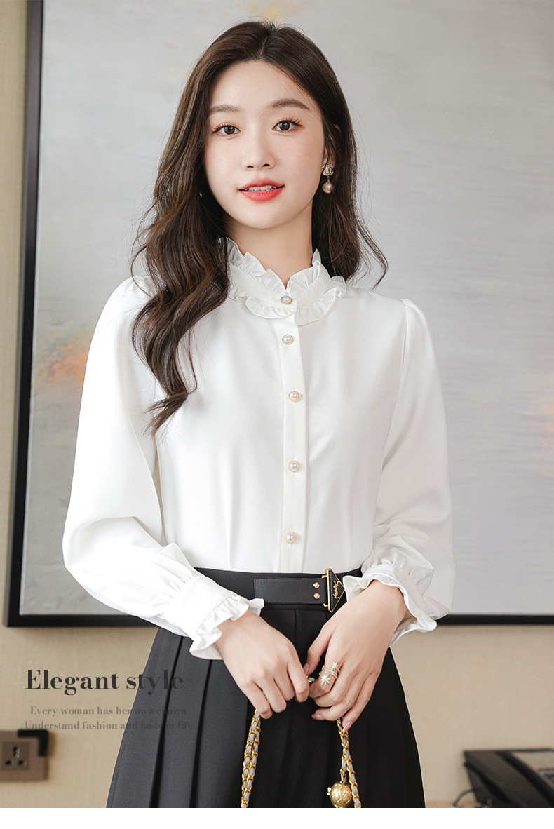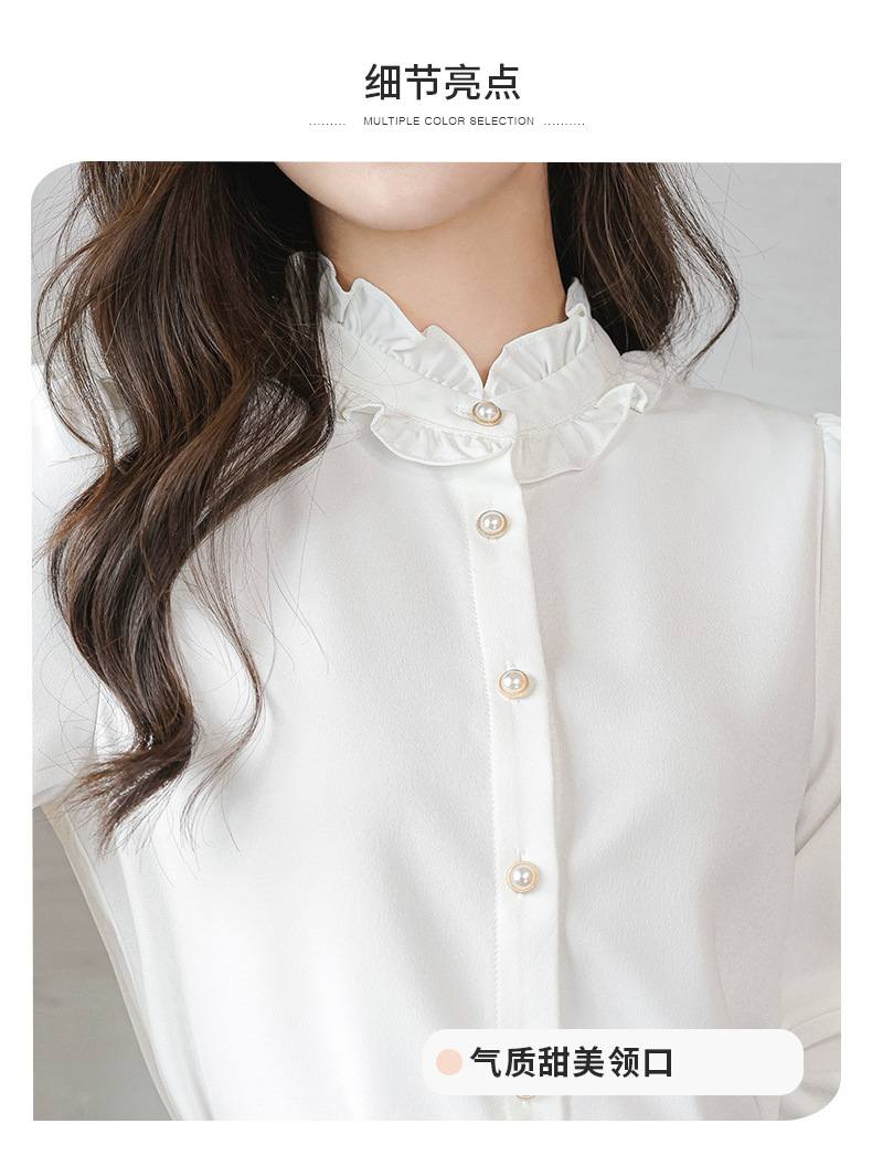 69286-신상 가을 의류 미색 곰팡이 스탠드 칼라 쉬폰 셔츠 여성 패션 탑 보텀 셔츠 통근
