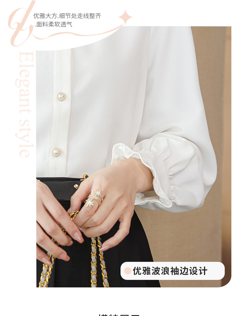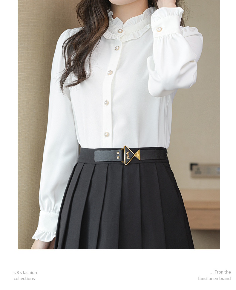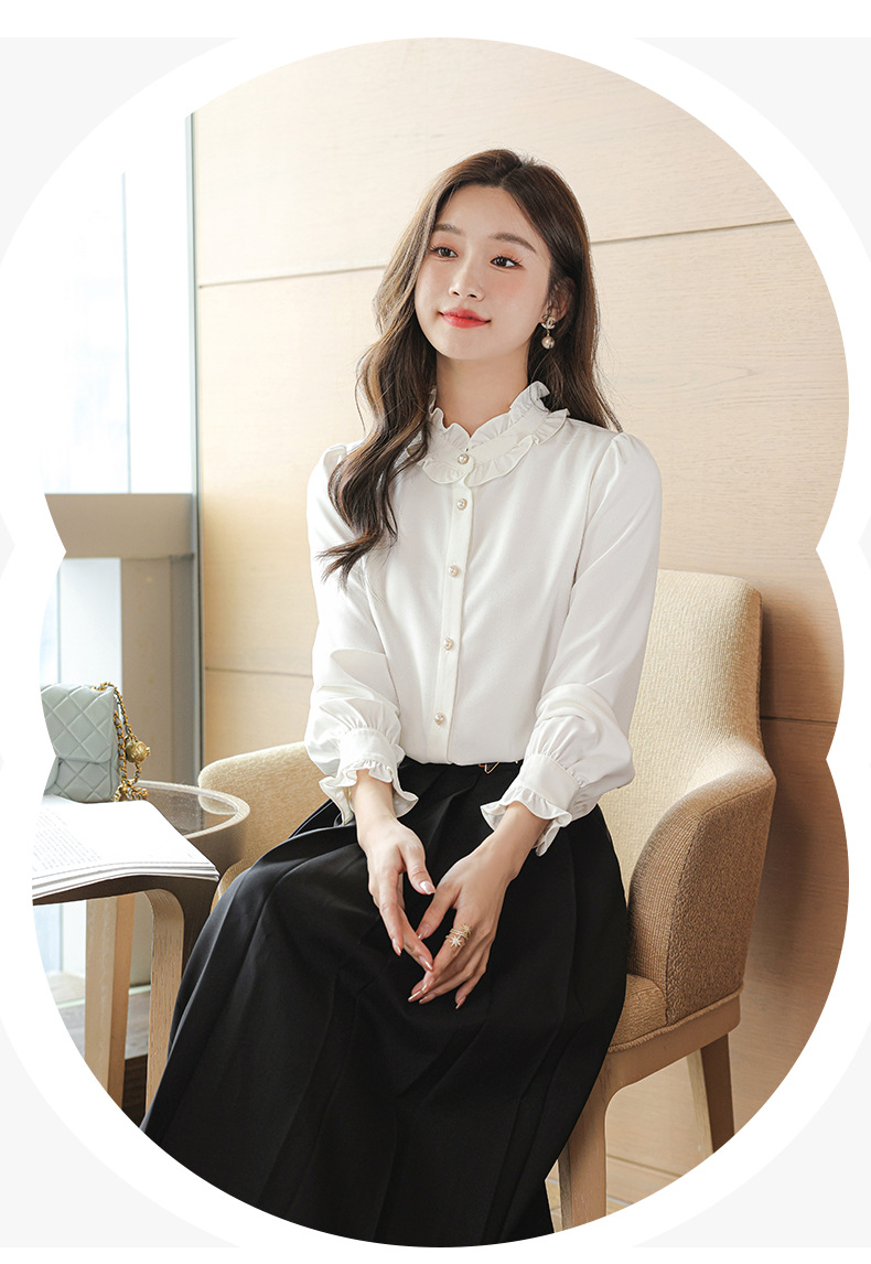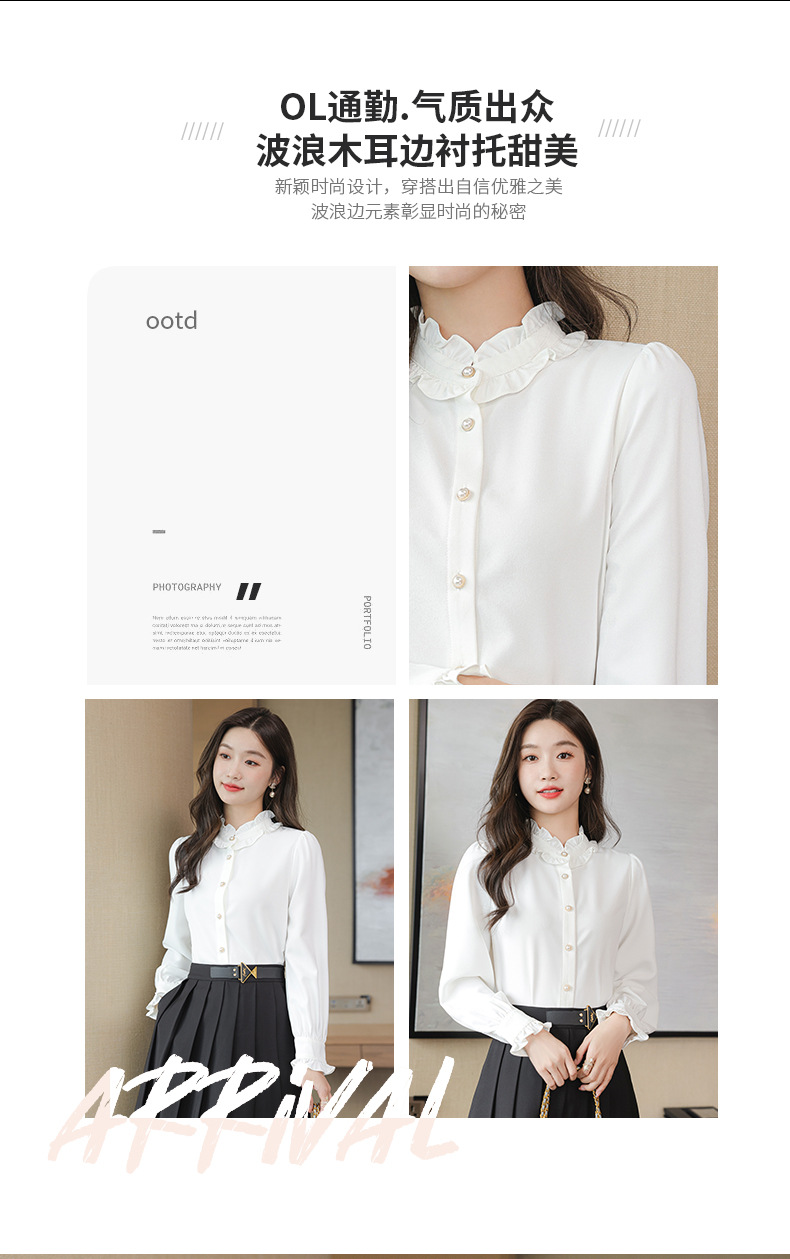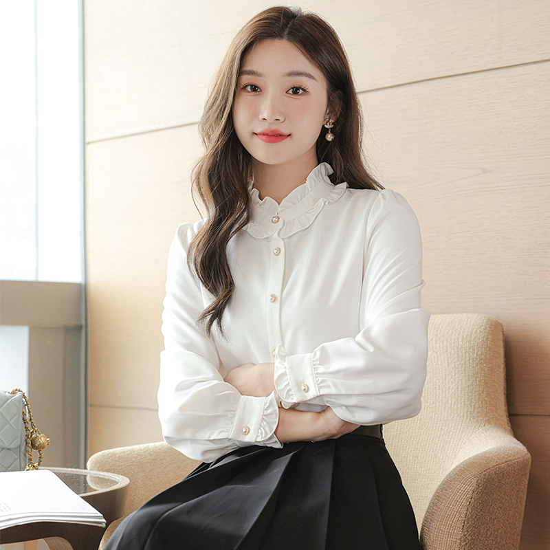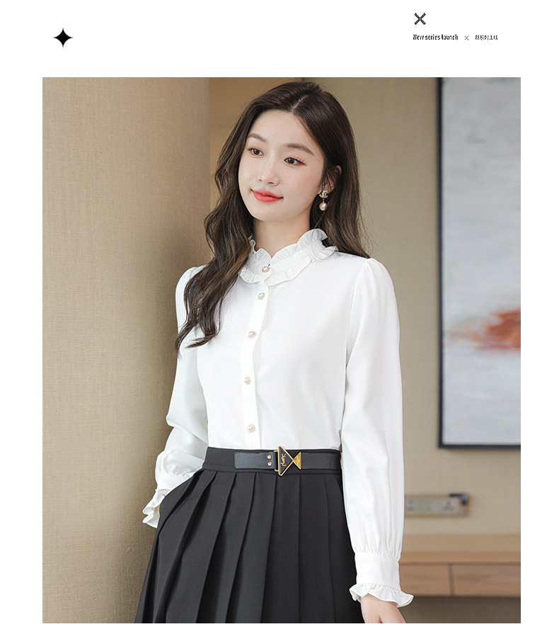 69286-신상 가을 의류 미색 곰팡이 스탠드 칼라 쉬폰 셔츠 여성 패션 탑 보텀 셔츠 통근