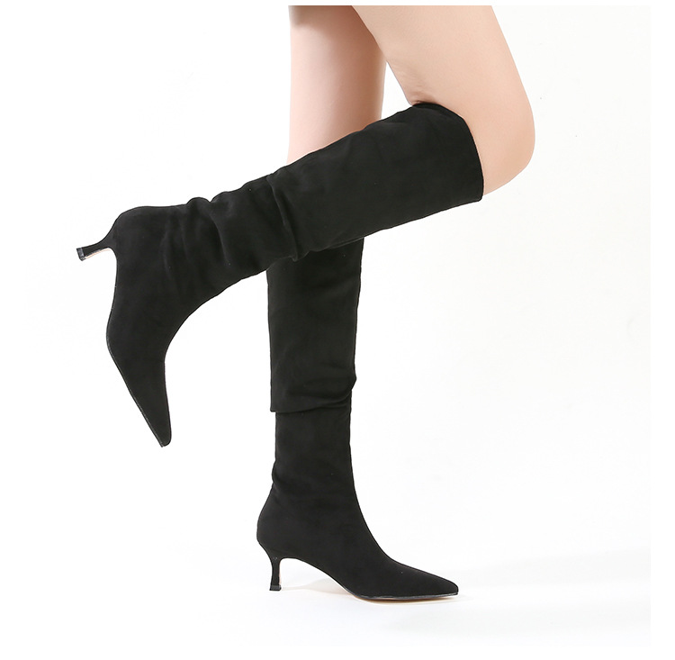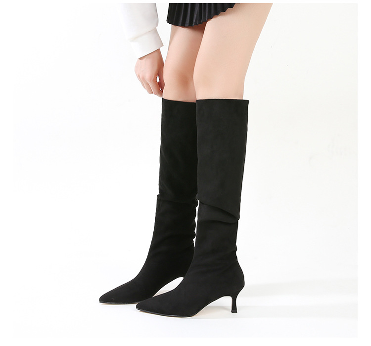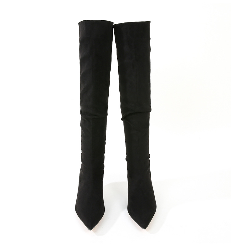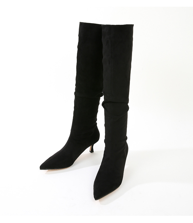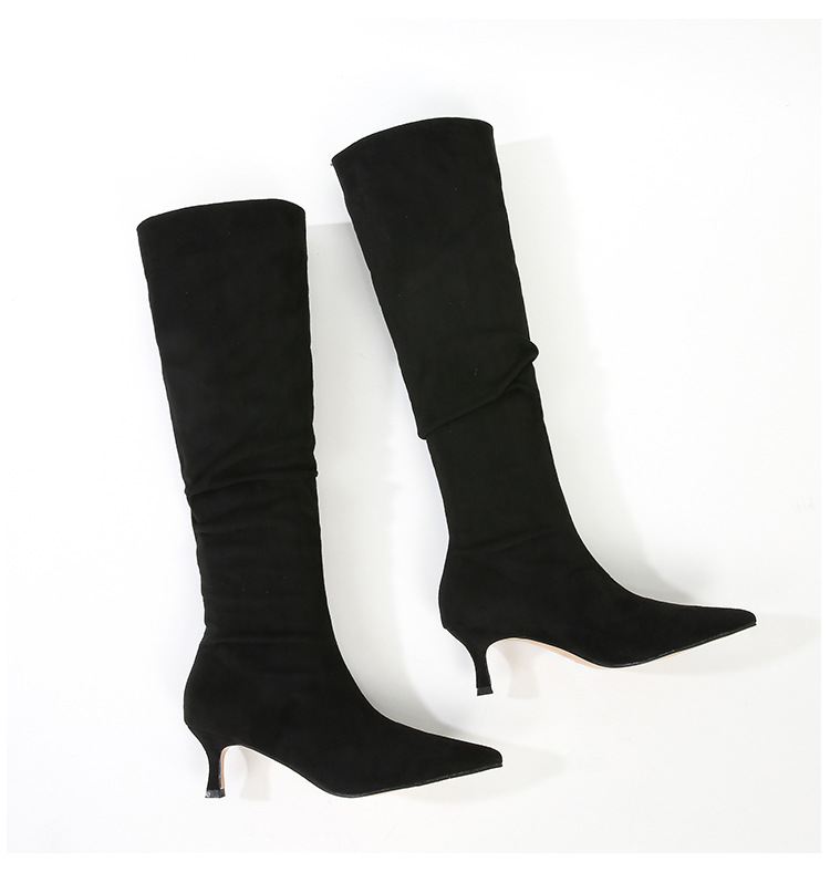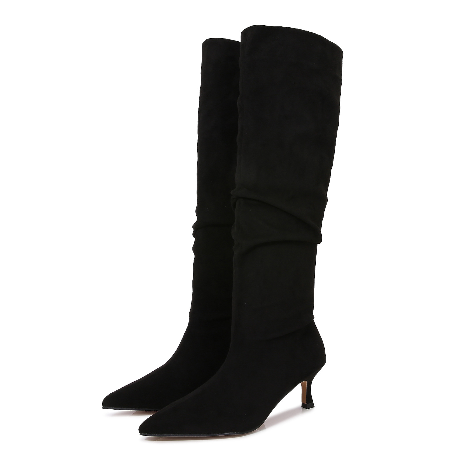 빈티지 포인트 플리츠 하이 배럴 부츠 여성용 2023 가을 고급 힐 스웨이드 더미 부츠 하이힐이지만 무릎 롱 부츠
