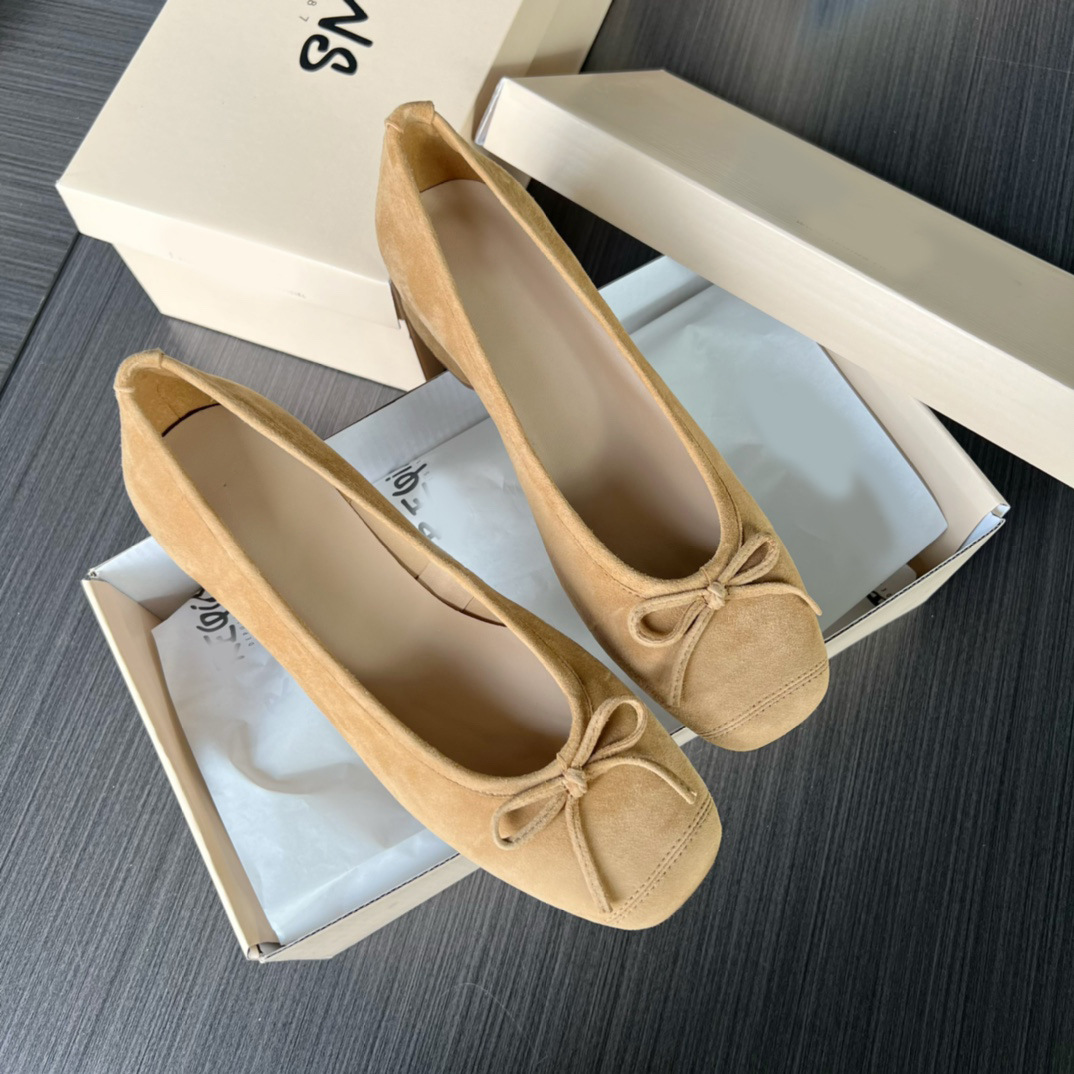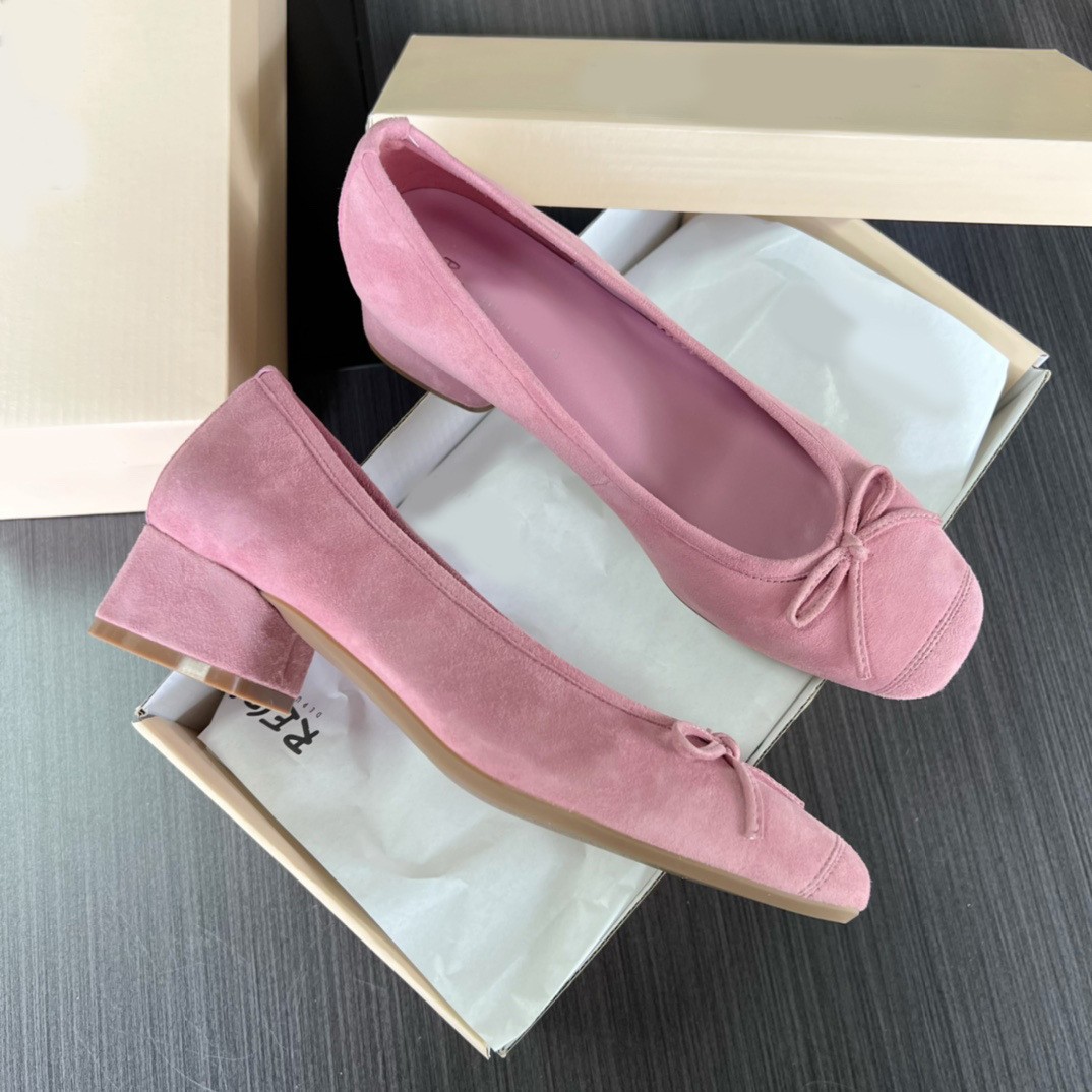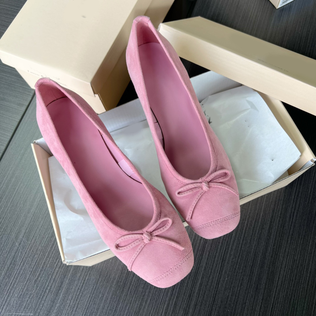 발레 슈즈 프렌치 레트로 스퀘어 토 보우 미드 힐 가죽 싱글 레이어 얕은 입 슬립온 향기로운 스타일 부드러운 가죽 두꺼운 굽