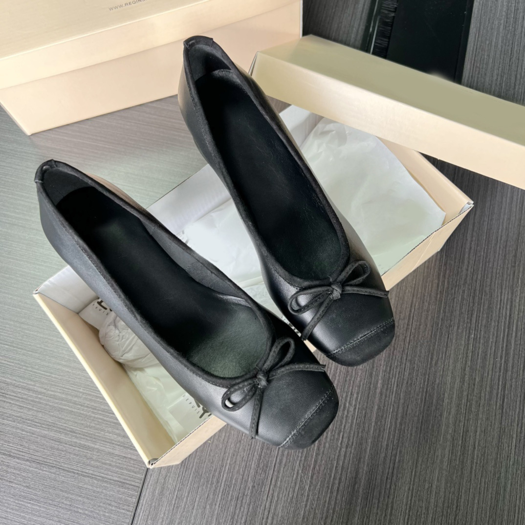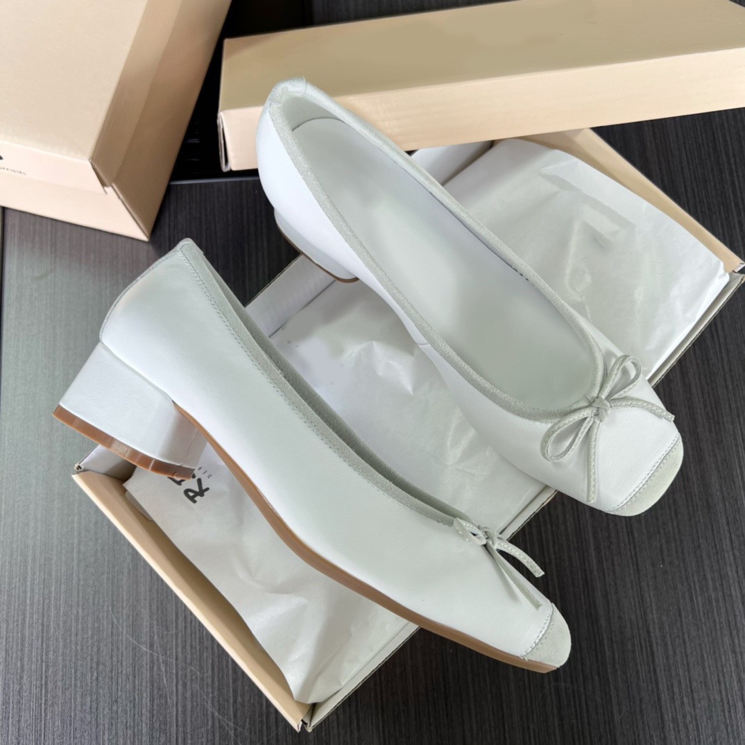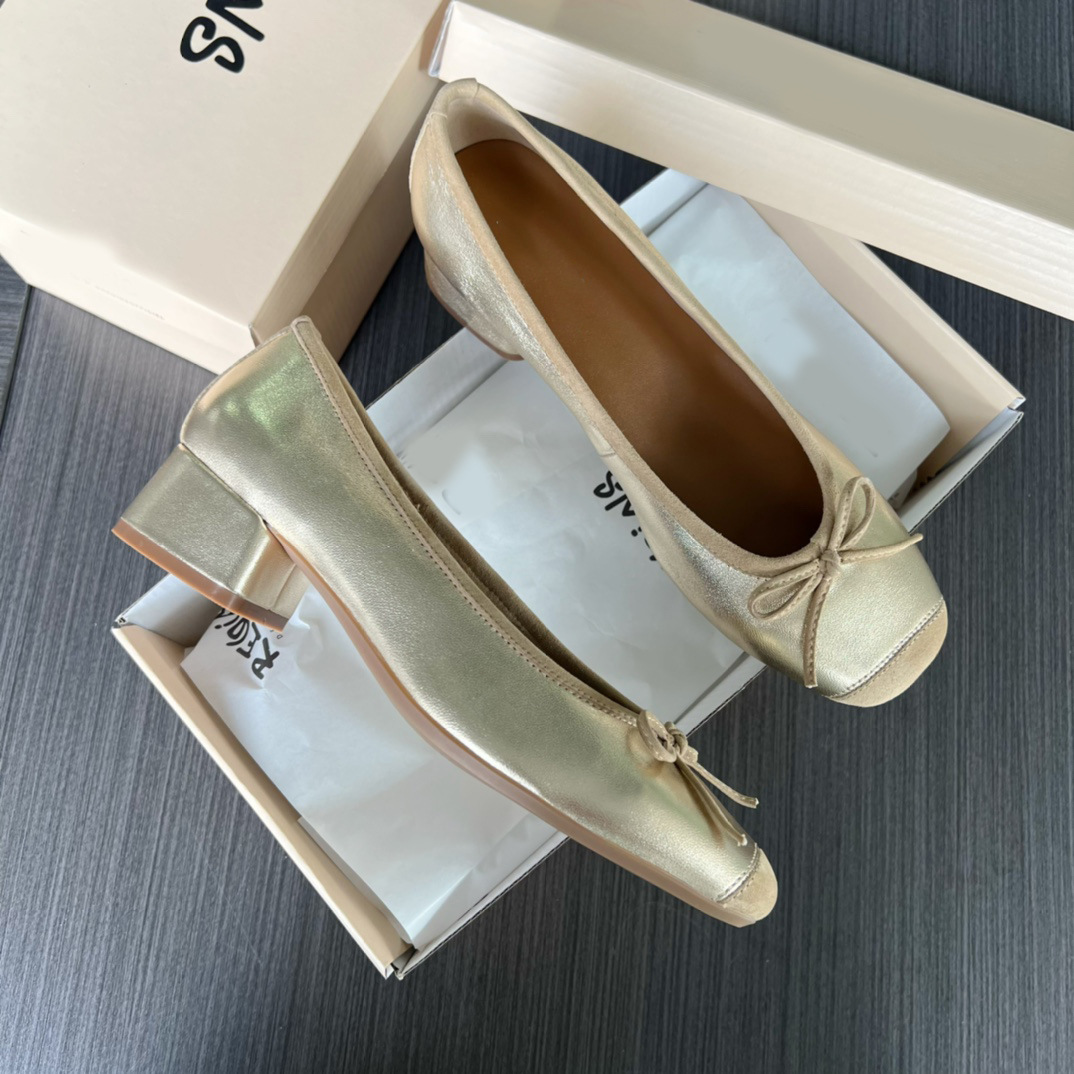 발레 슈즈 프렌치 레트로 스퀘어 토 보우 미드 힐 가죽 싱글 레이어 얕은 입 슬립온 향기로운 스타일 부드러운 가죽 두꺼운 굽