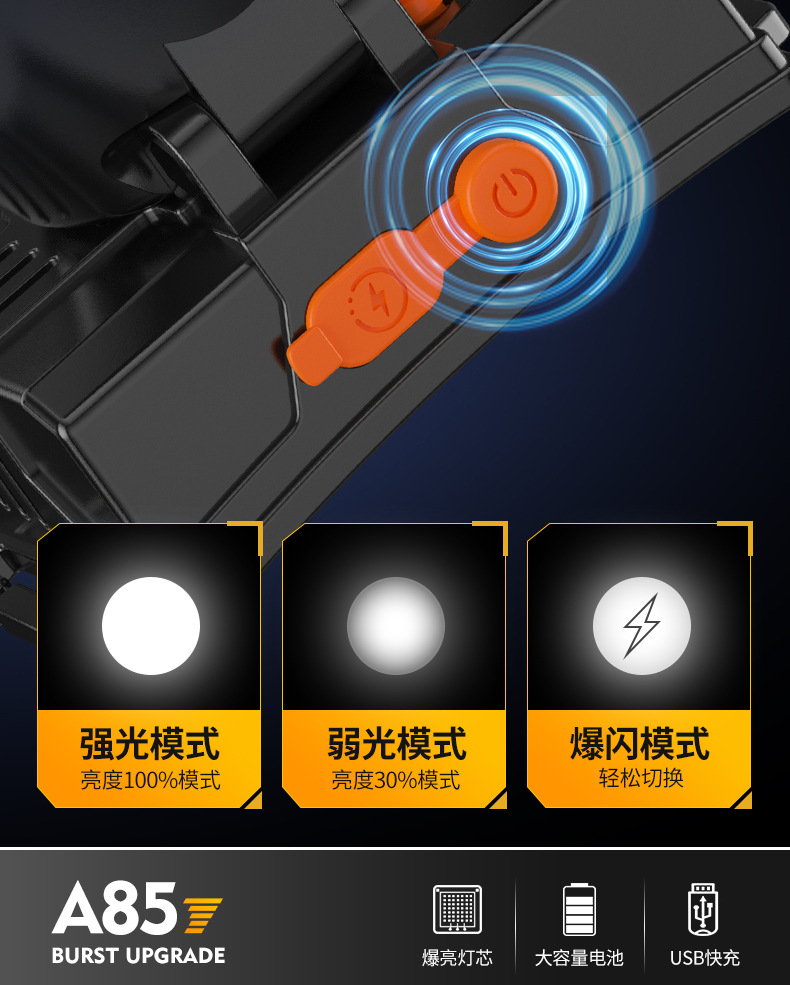 • A85 화이트 라이트: 이중 리튬 + USB 충전 라인