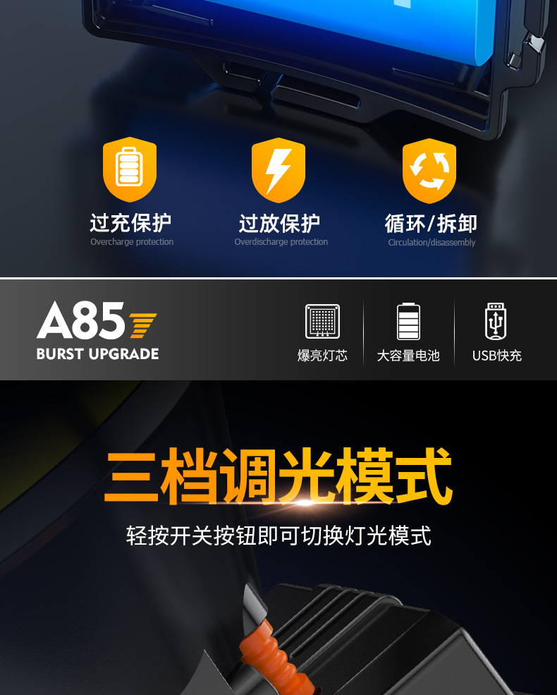 • A85 옐로우 라이트: 단일 리튬 + USB 충전 라인