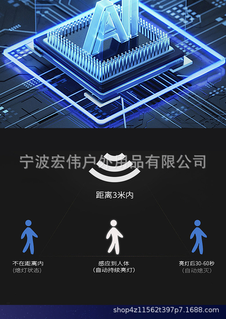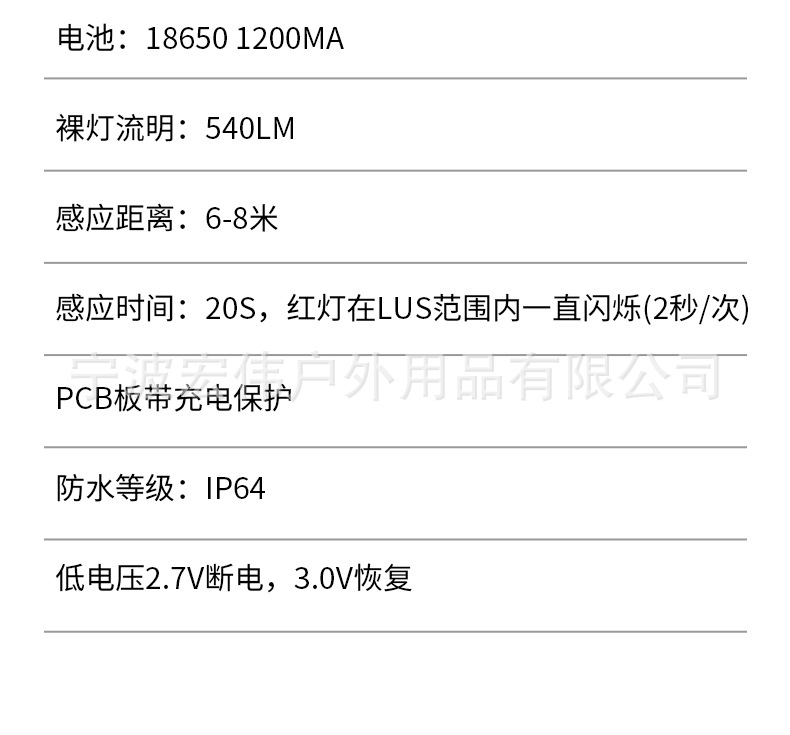 感应时间:亮20秒灭,红灯在LUS范围内一直闪烁(2秒/次)PCB 板带充电保护