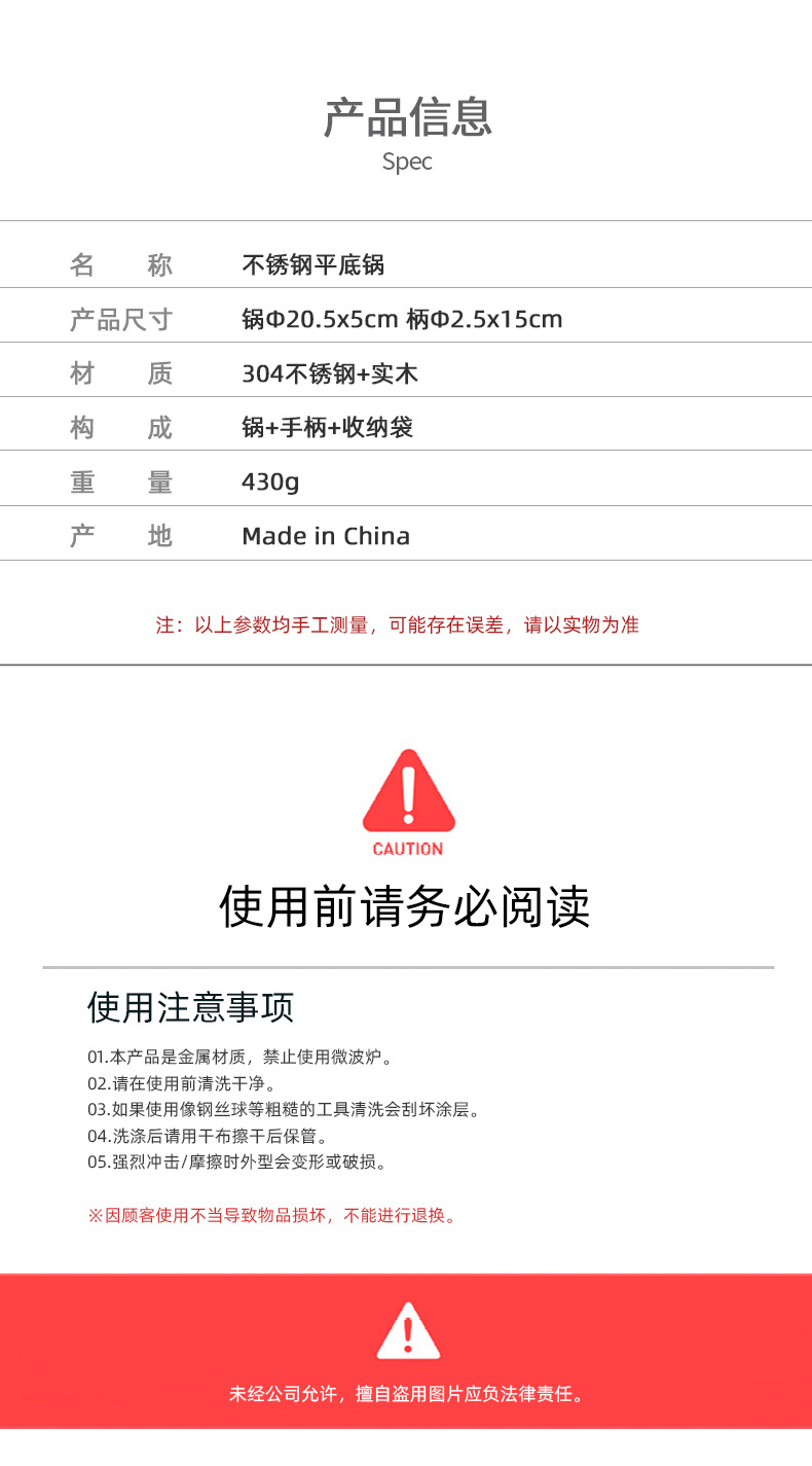 尺 寸:锅Φ20.5x5cm 柄Φ2.5x15cm