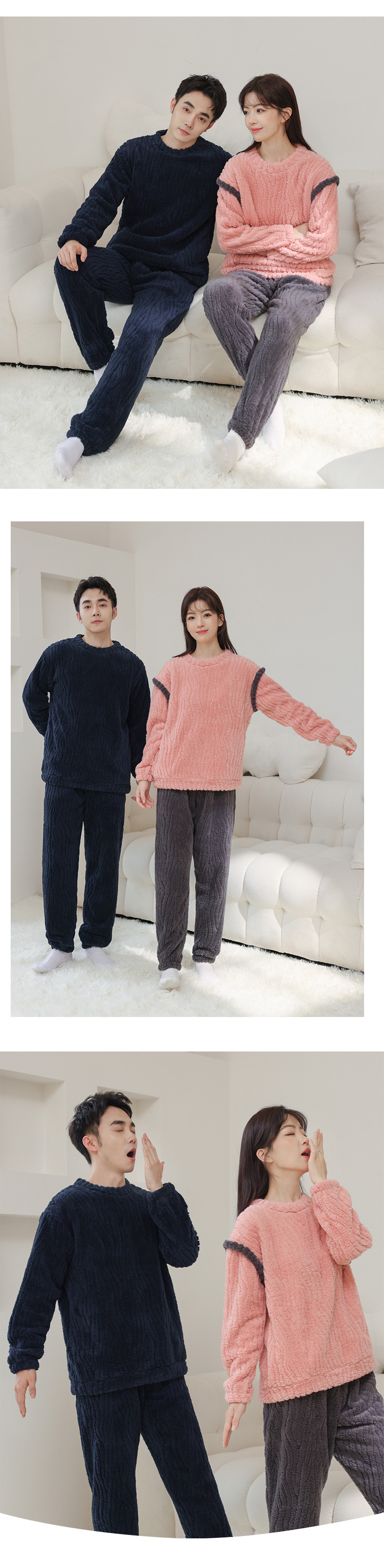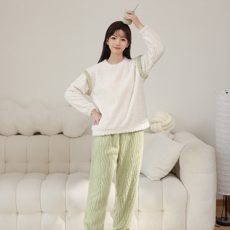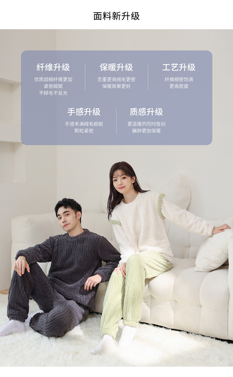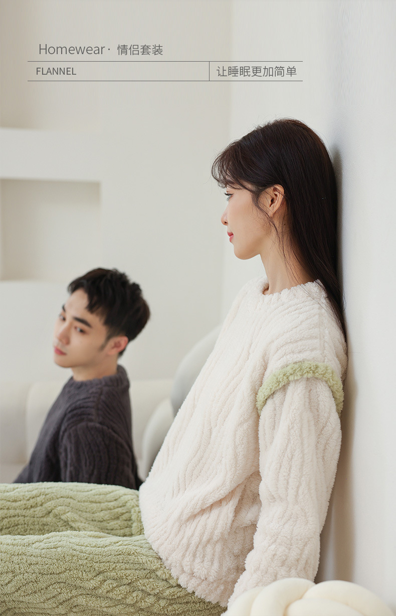 가을과 겨울 커플 잠옷 풀오버 산호 양털 자카드 심플 솔리드 컬러 남성용 라운드 넥 여성용 컬러 매칭 따뜻한 가정 옷 세트스토어 가기