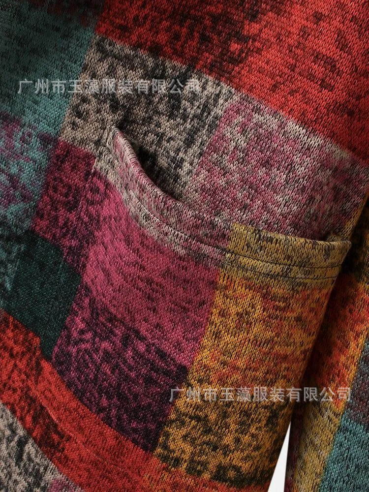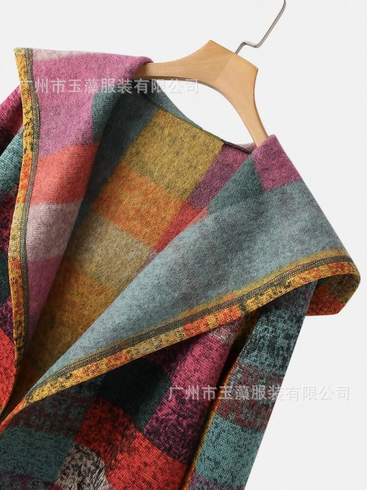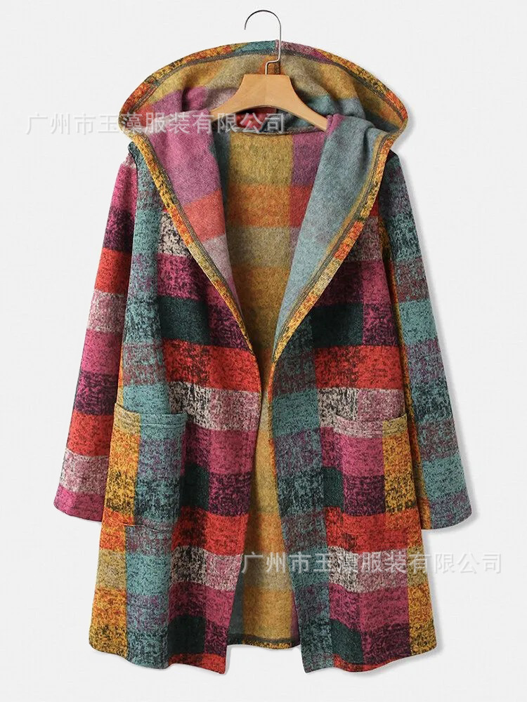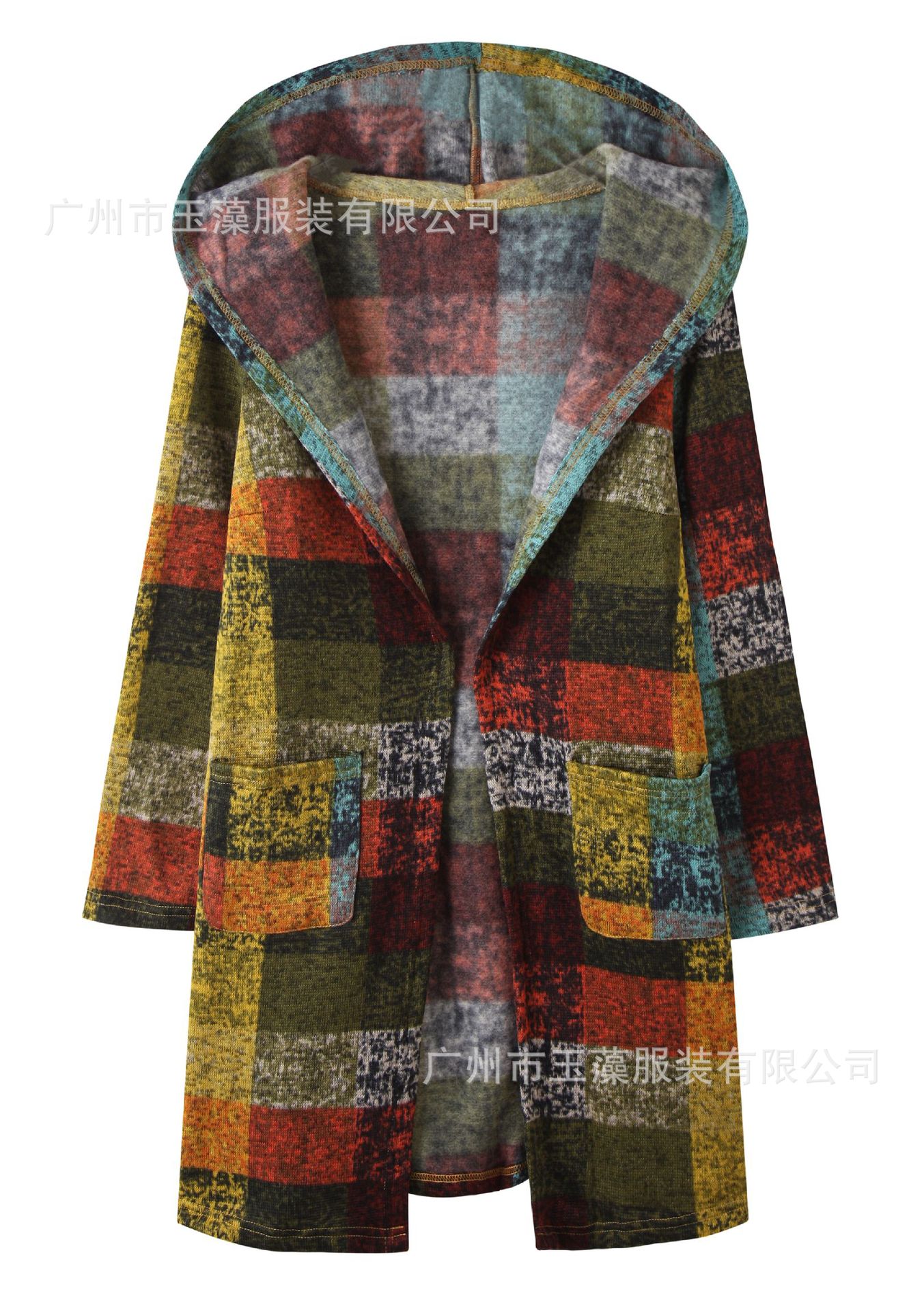여성용 격자 무늬 빈티지 격자 무늬 프린트 후드 스웨터 카디건 양털 재킷