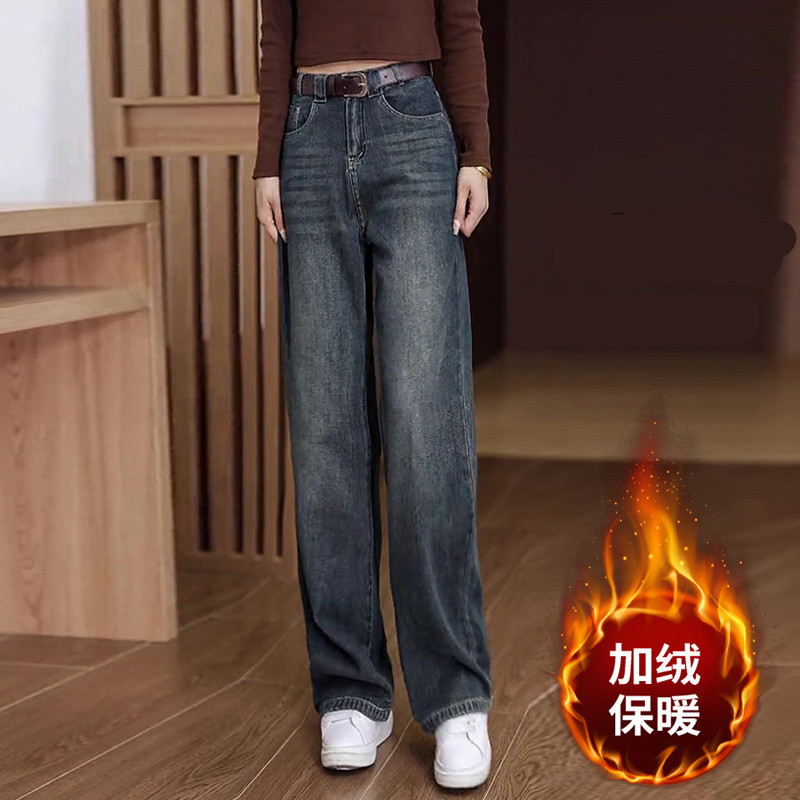 레트로 좁은 청바지 여성을위한 넓은 다리 바지 2025 봄, 가을 패션 높은 허리 느슨한 슬림 플러스 벨벳 캐주얼 스트레이트 바지