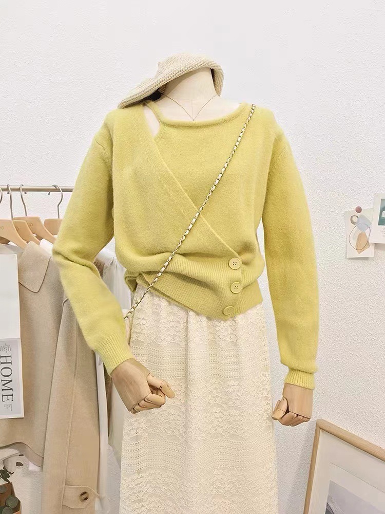 한국식 2023 초가을 프랑스 디자인 센스 페이크 투피스 3 버튼 타이트 웨이스트 니트 스웨터 올 매치 니치 탑스토어 가기