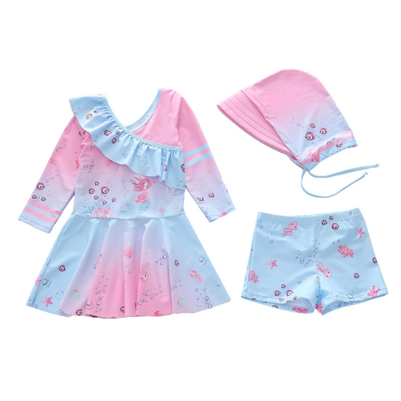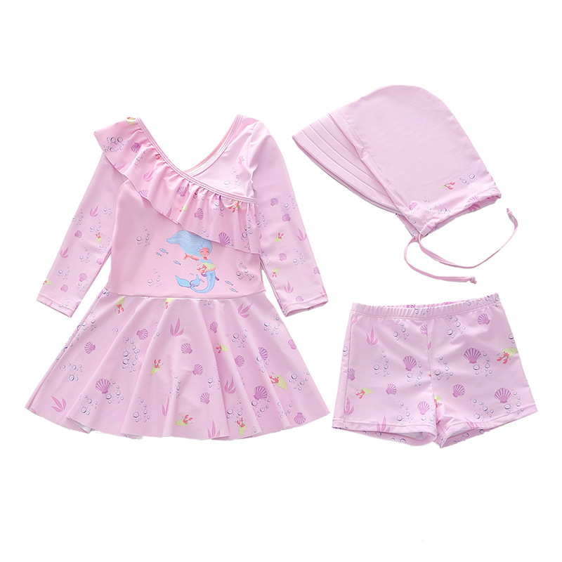 새로운 어린이 수영복 여성용 빅 보이 소녀의 원피스 스커트 수영복 수영 모자가있는 여성용 스플릿 수영복 3-12 세