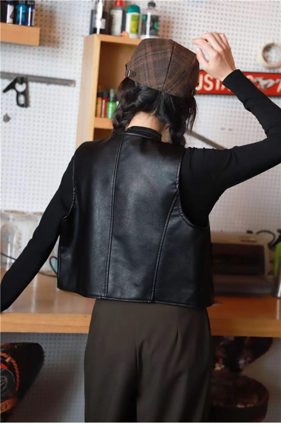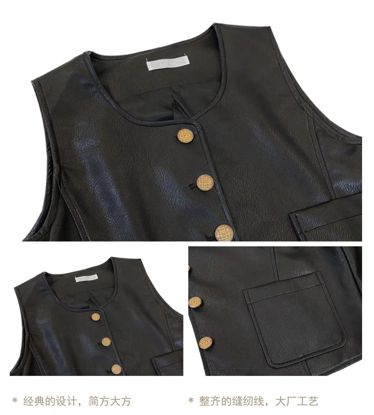 • 블랙 라운드 넥 PU 가죽 조끼