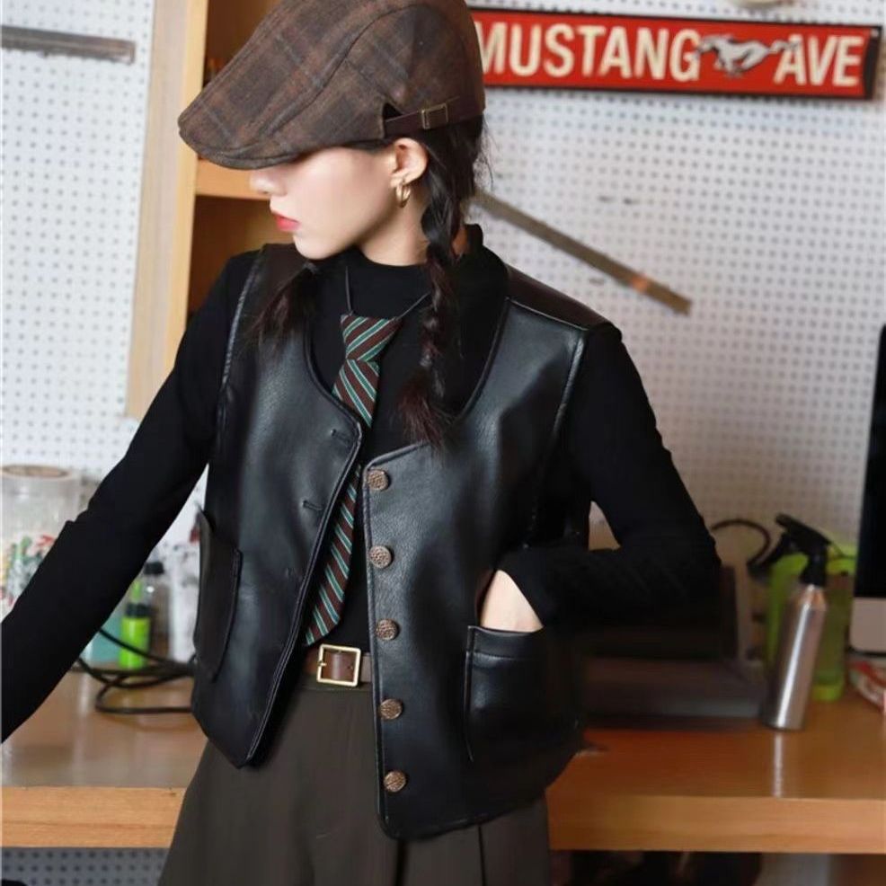 PU 가죽 조끼 여성 문학 복고풍 매트 양복 조끼 크루 넥 모든 매치 민소매 핫 걸 워터 조끼 가을과 겨울 가죽 조끼