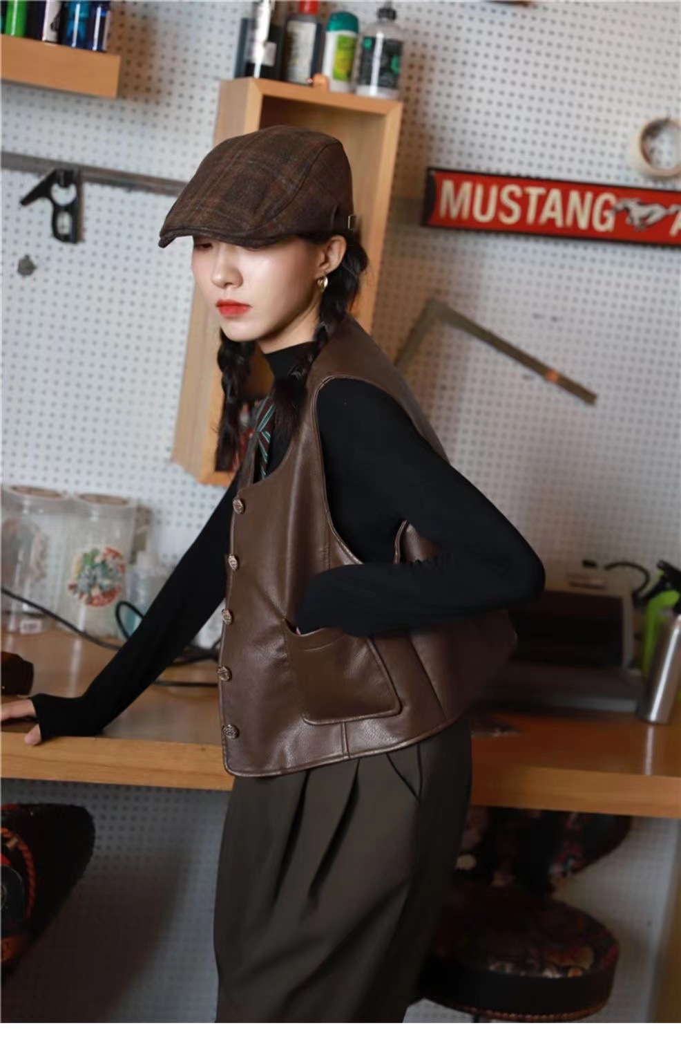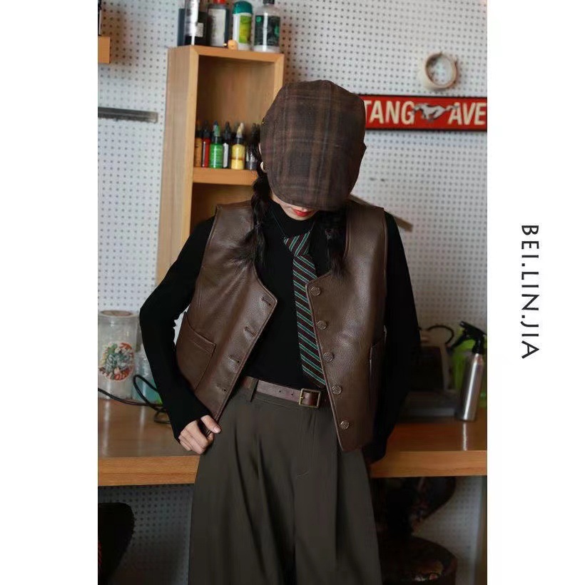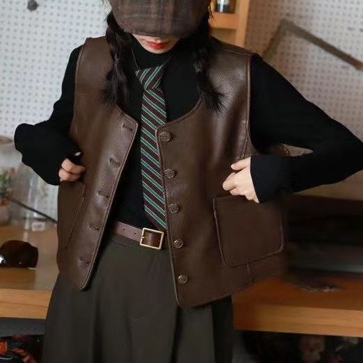 • 다크 브라운 라운드 넥 PU 가죽 조끼