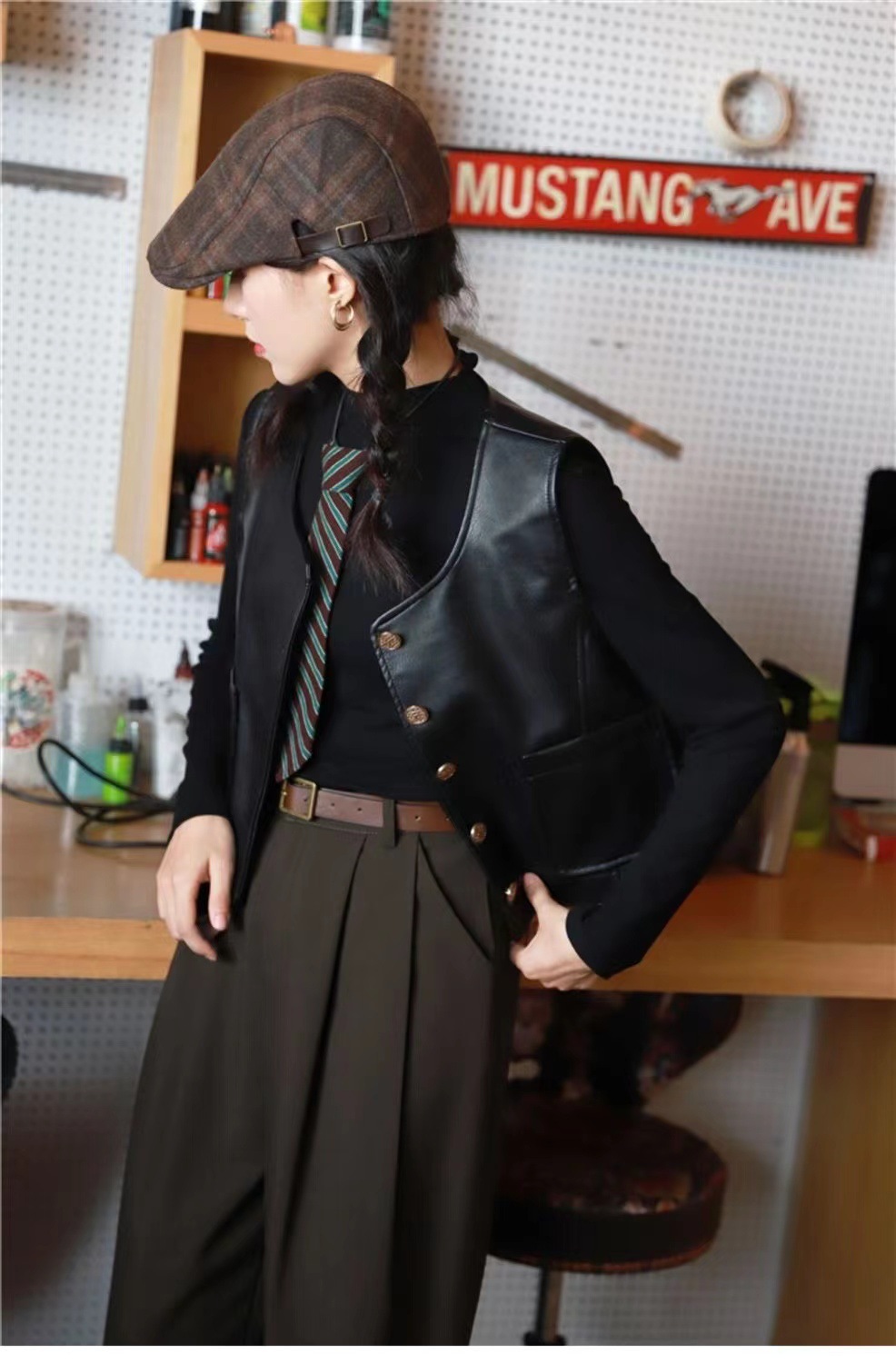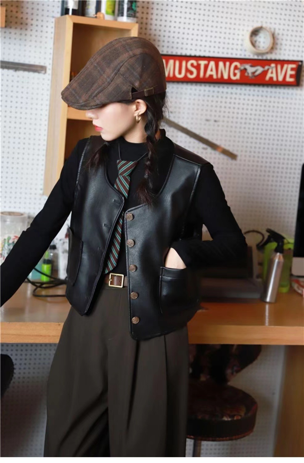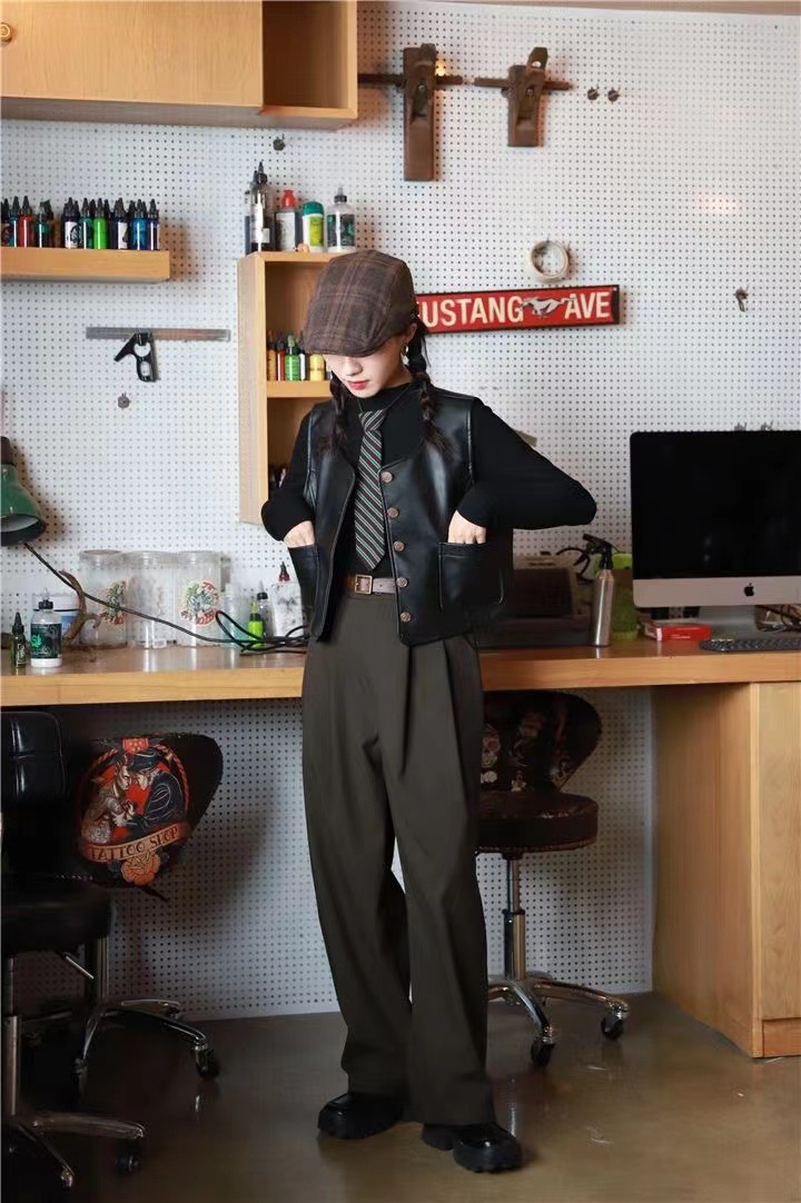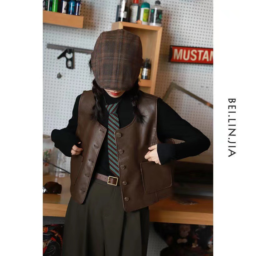 PU 가죽 조끼 여성 문학 복고풍 매트 양복 조끼 크루 넥 모든 매치 민소매 핫 걸 워터 조끼 가을과 겨울 가죽 조끼스토어 가기