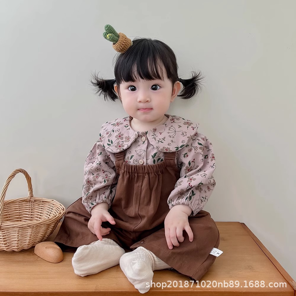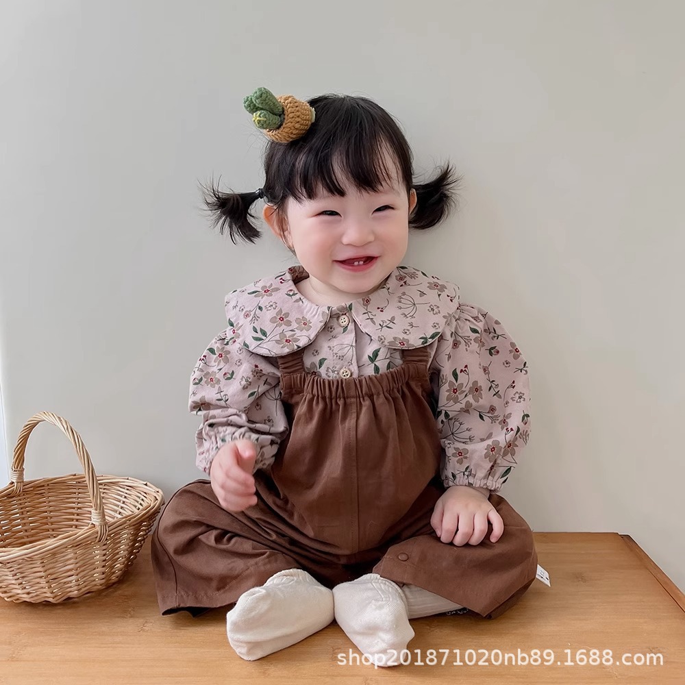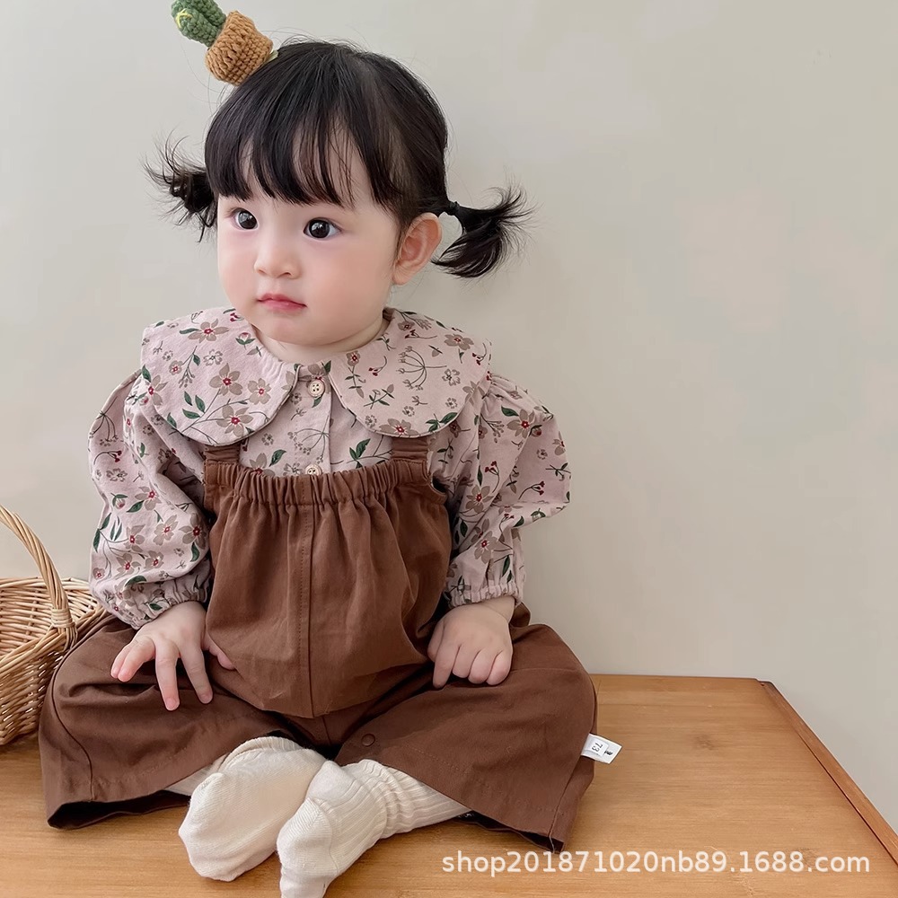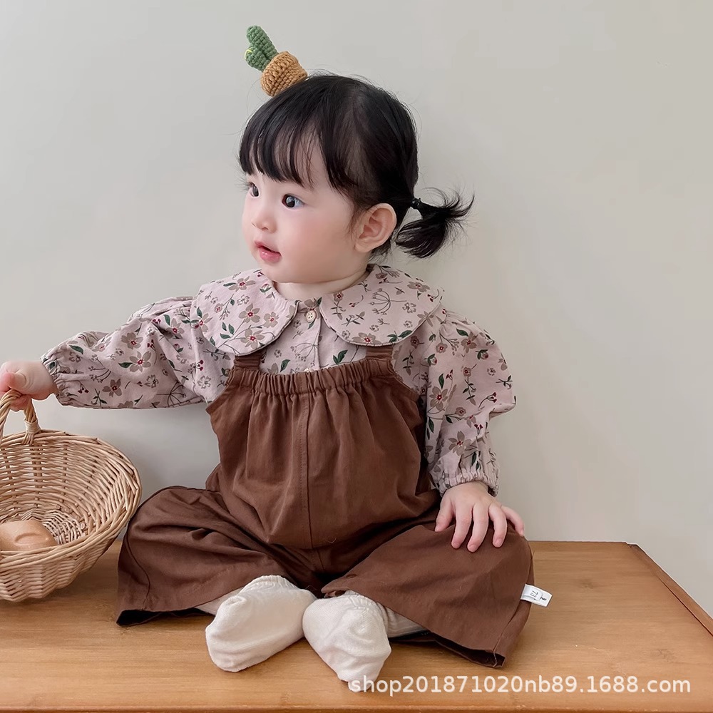 한국 스타일 아기 옷 가을 새로운 도착 세트 소녀 아기 귀여운 꽃 탑 스트랩 아기 등산 옷스토어 가기
