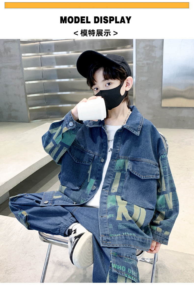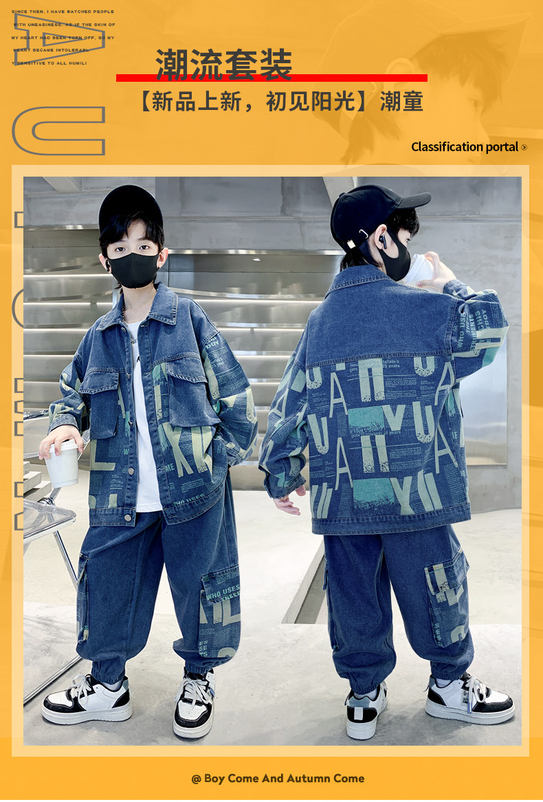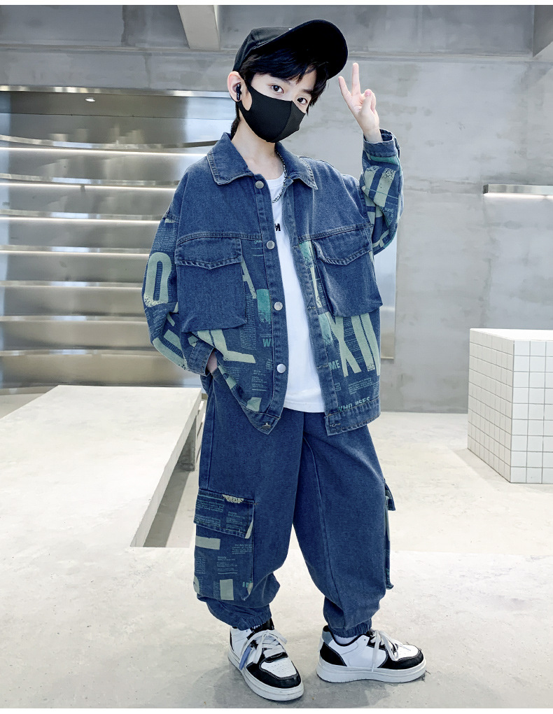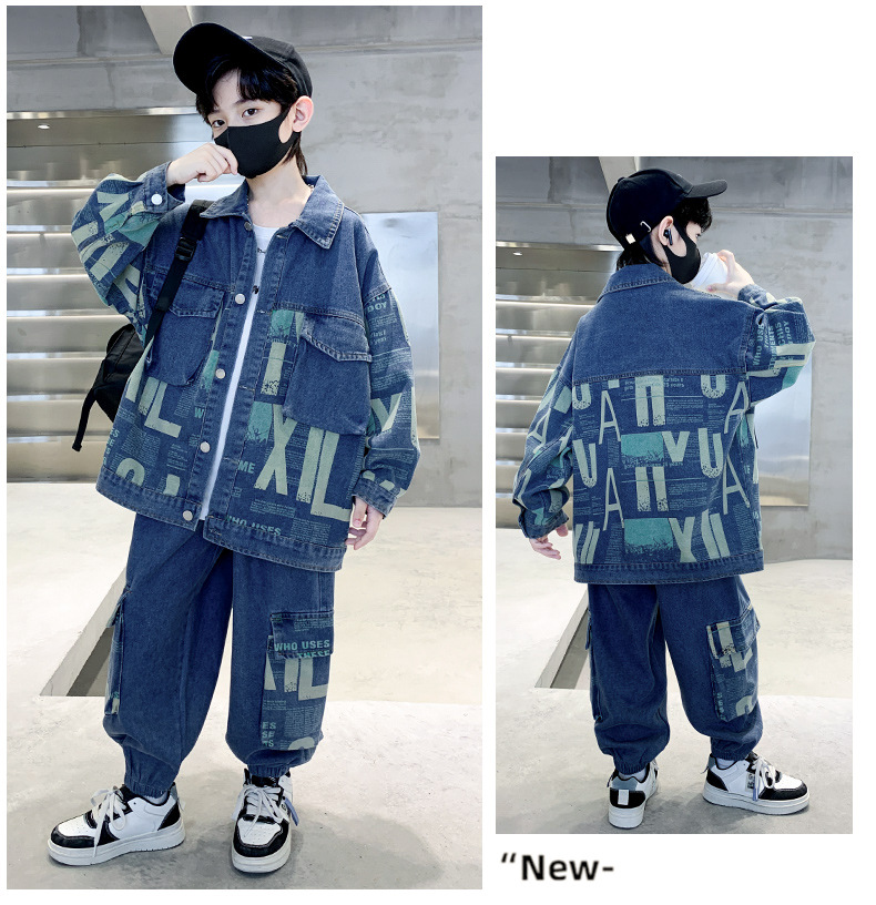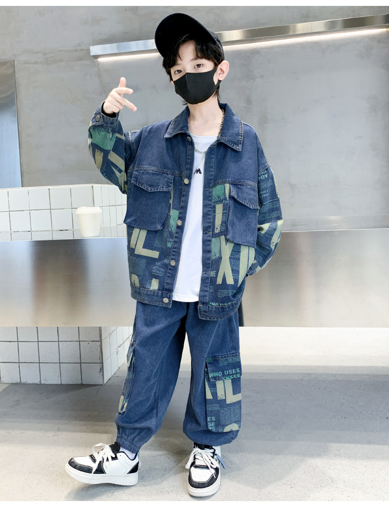 소년 가을 세트 2023 새로운 잘 생긴 큰 아이들의 봄과 가을 데님 코트 유행 어린이 바지 튀김 거리스토어 가기