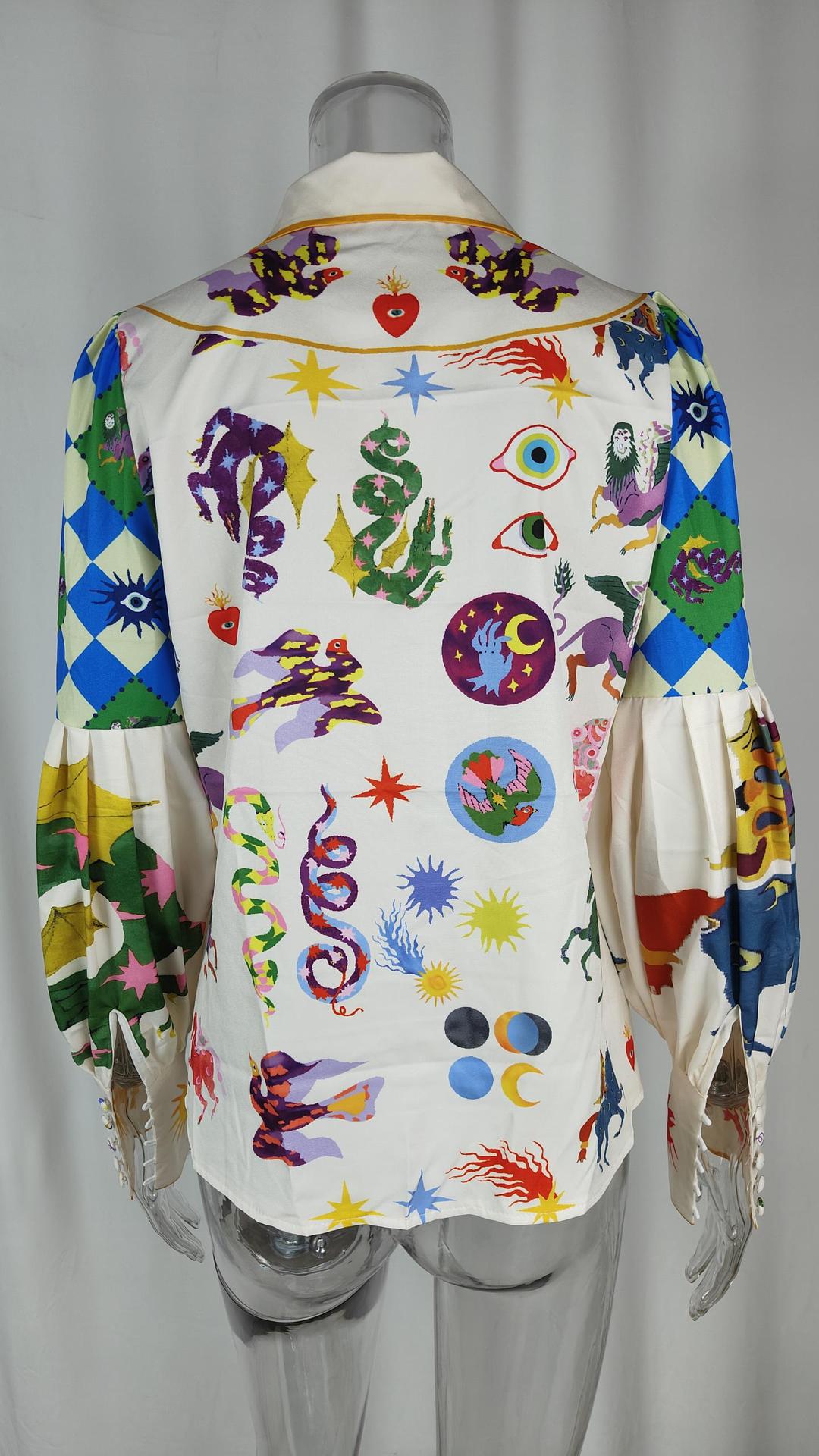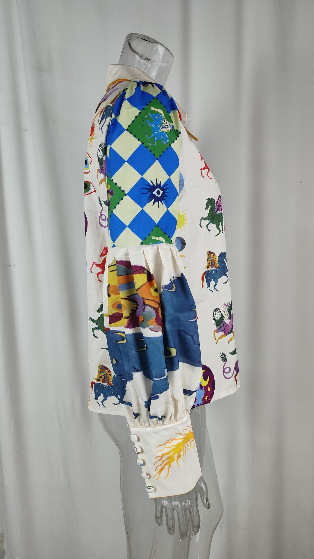 가을 2023 유럽과 미국 여성 의류 아마존 새로운 우아한 통근 인쇄 옷깃 여성용 싱글 브레스트 랜턴 슬리브 셔츠