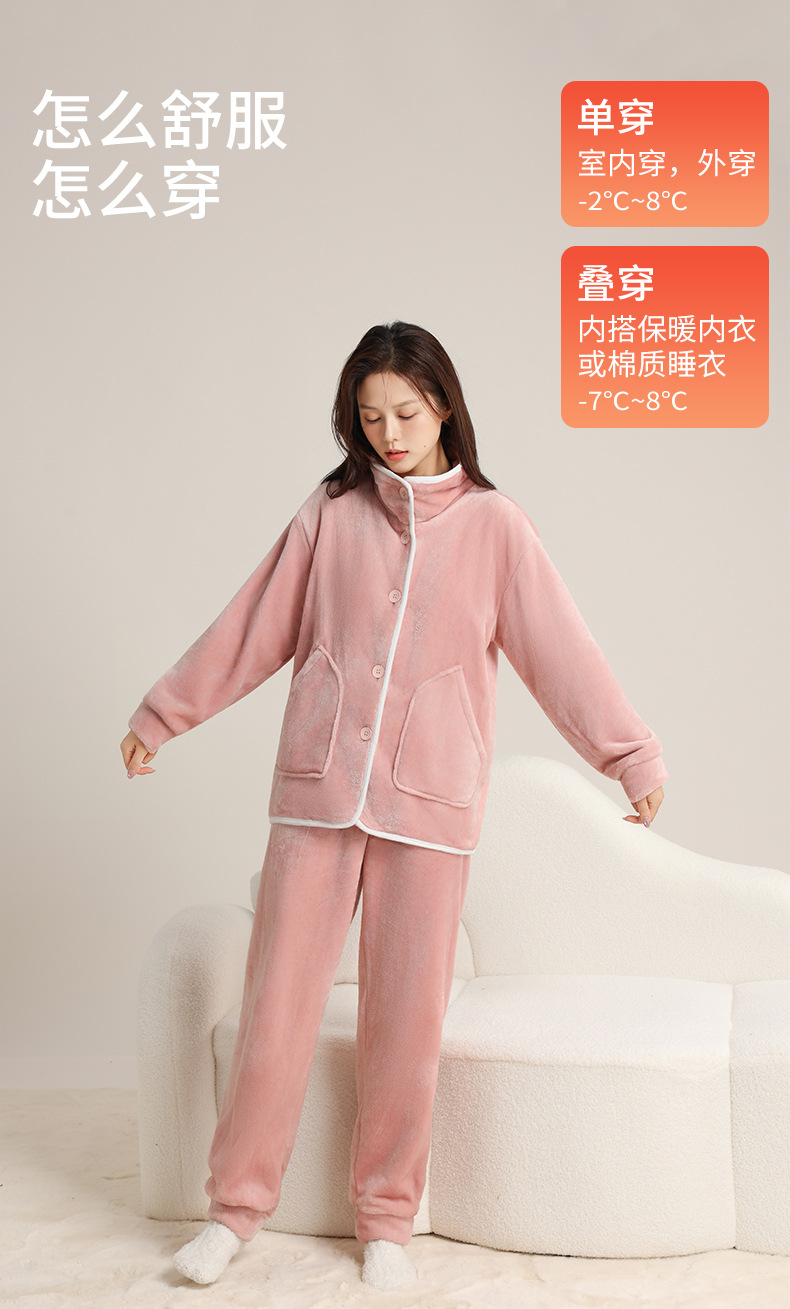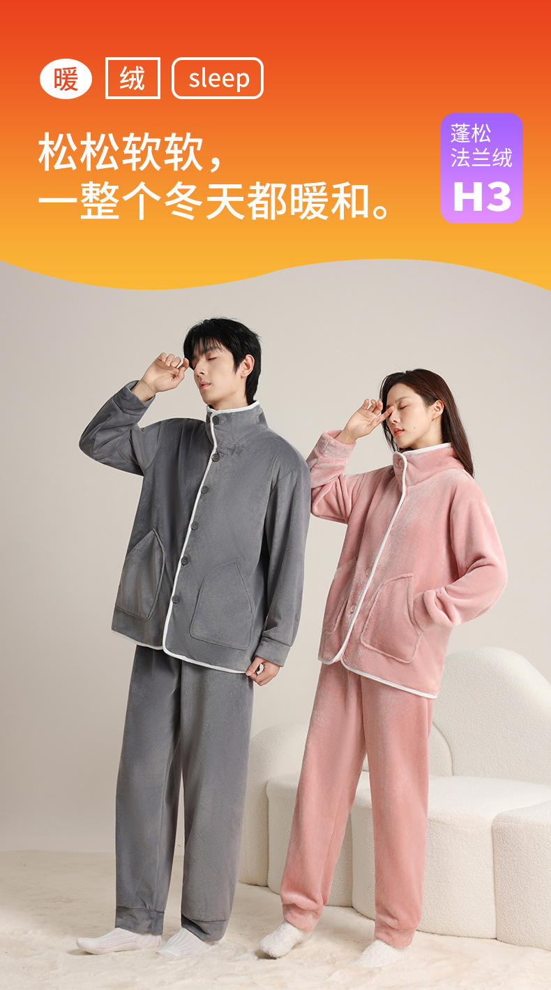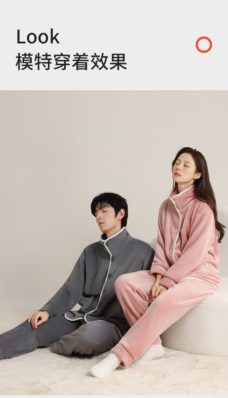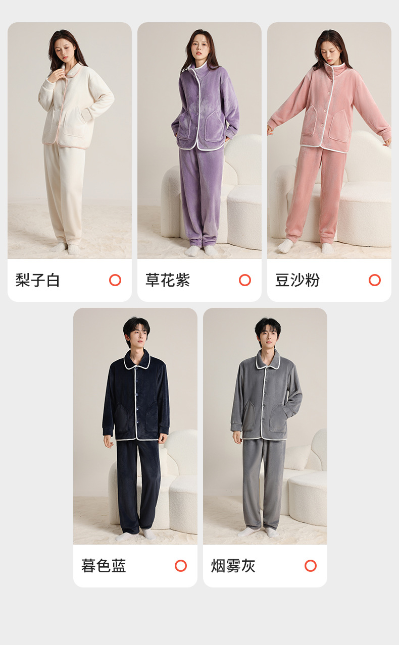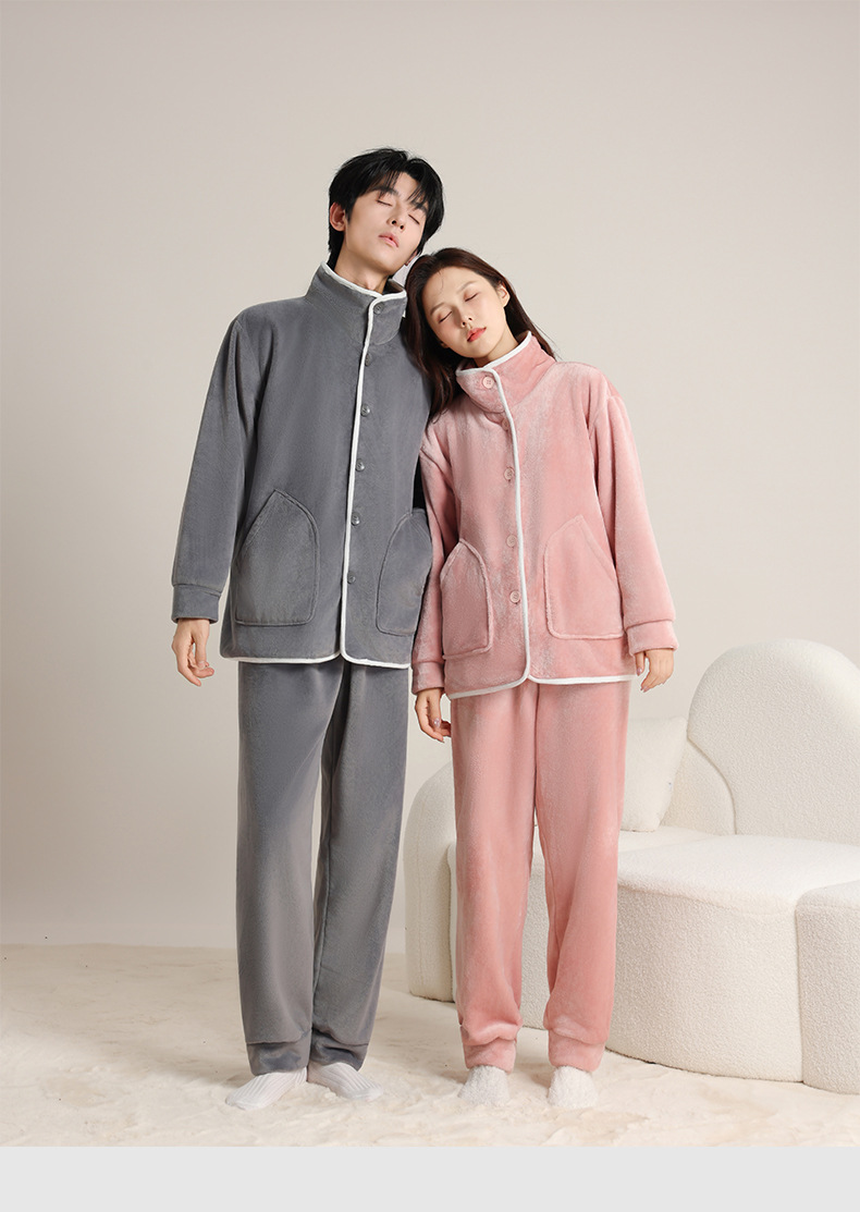 가을 겨울 남녀 플란넬 따뜻한 홈웨어, 스탠드 칼라 또는 라펠 칼라 선택 가능, 커플용 심플 두꺼운 잠옷 투피스 세트스토어 가기