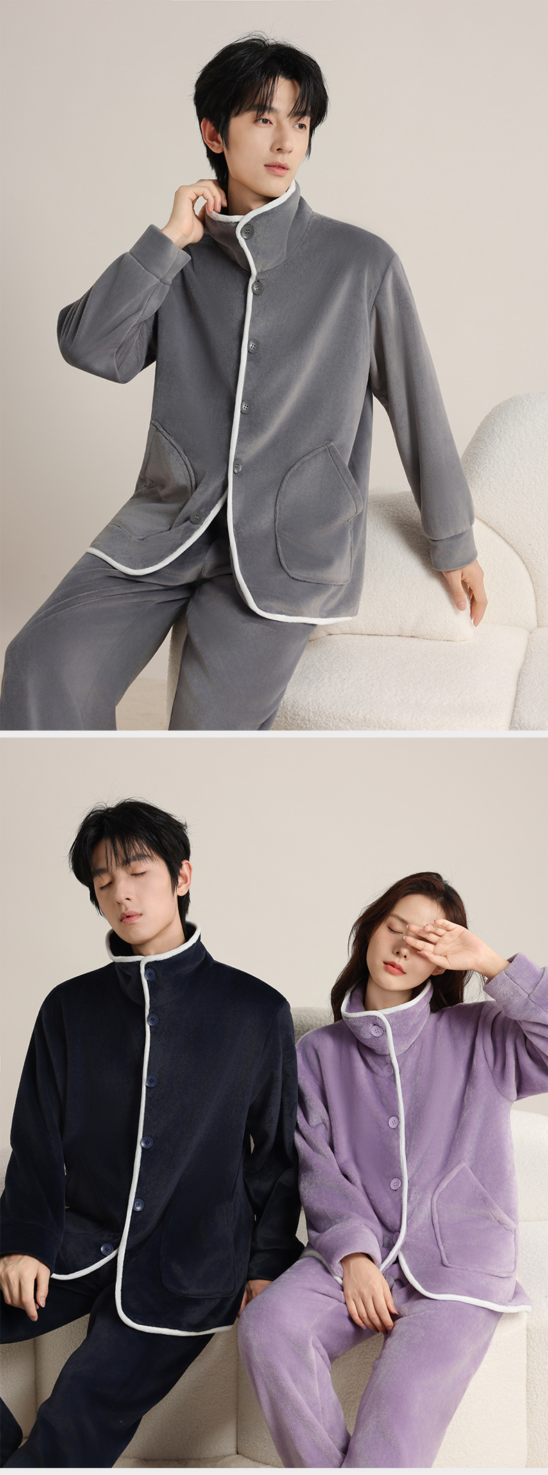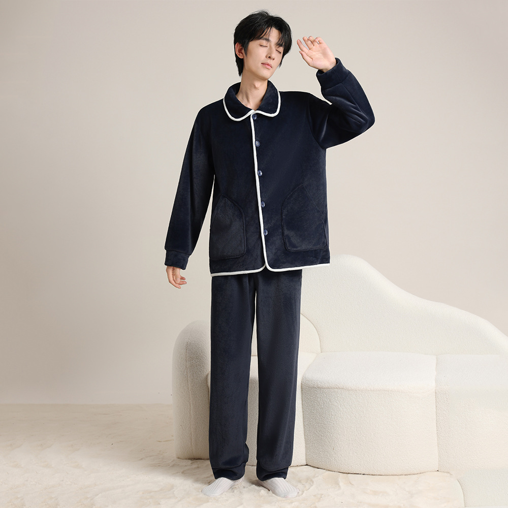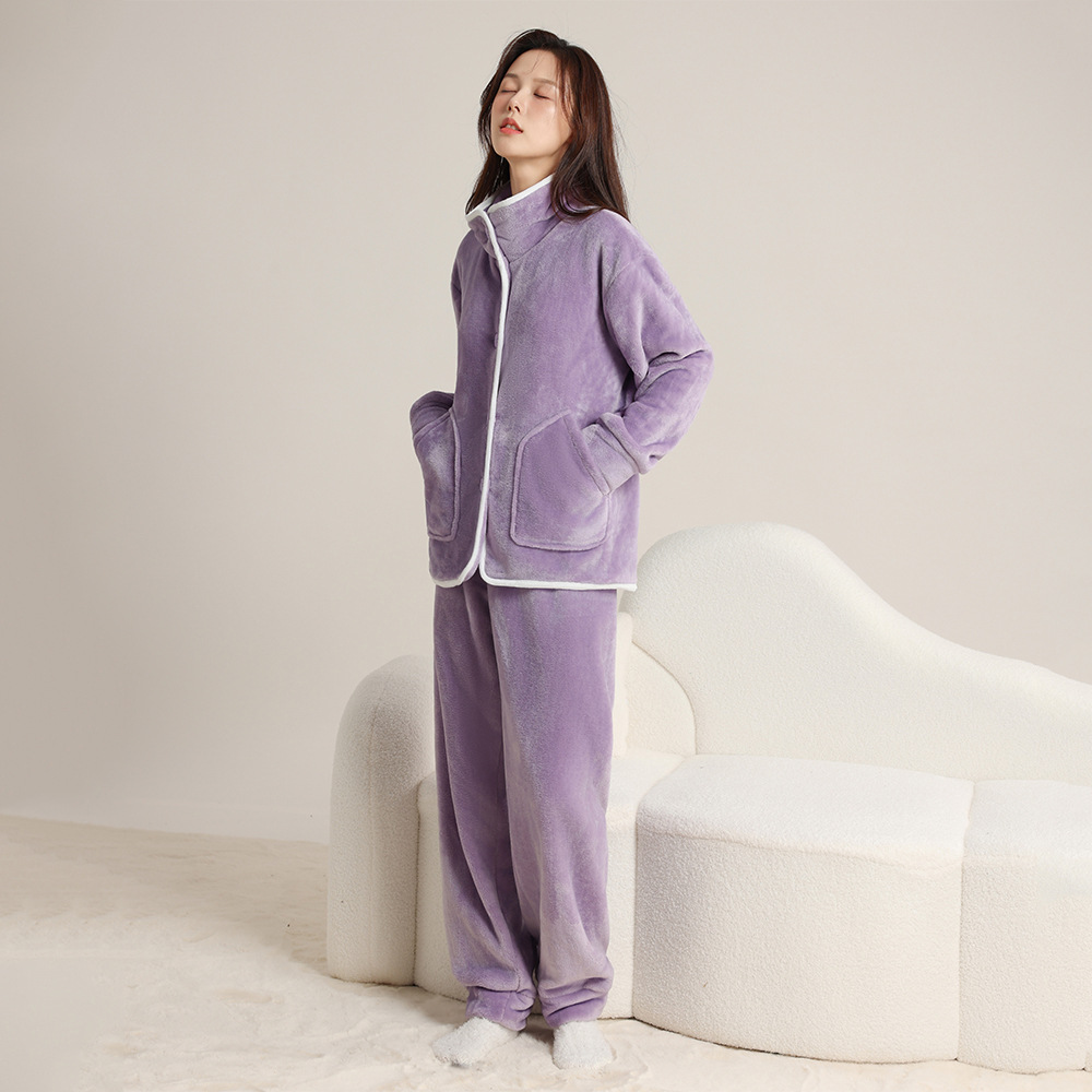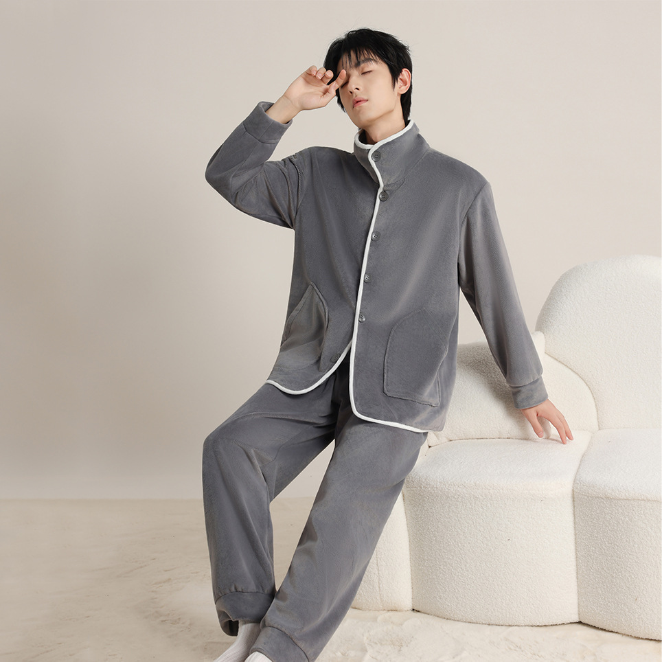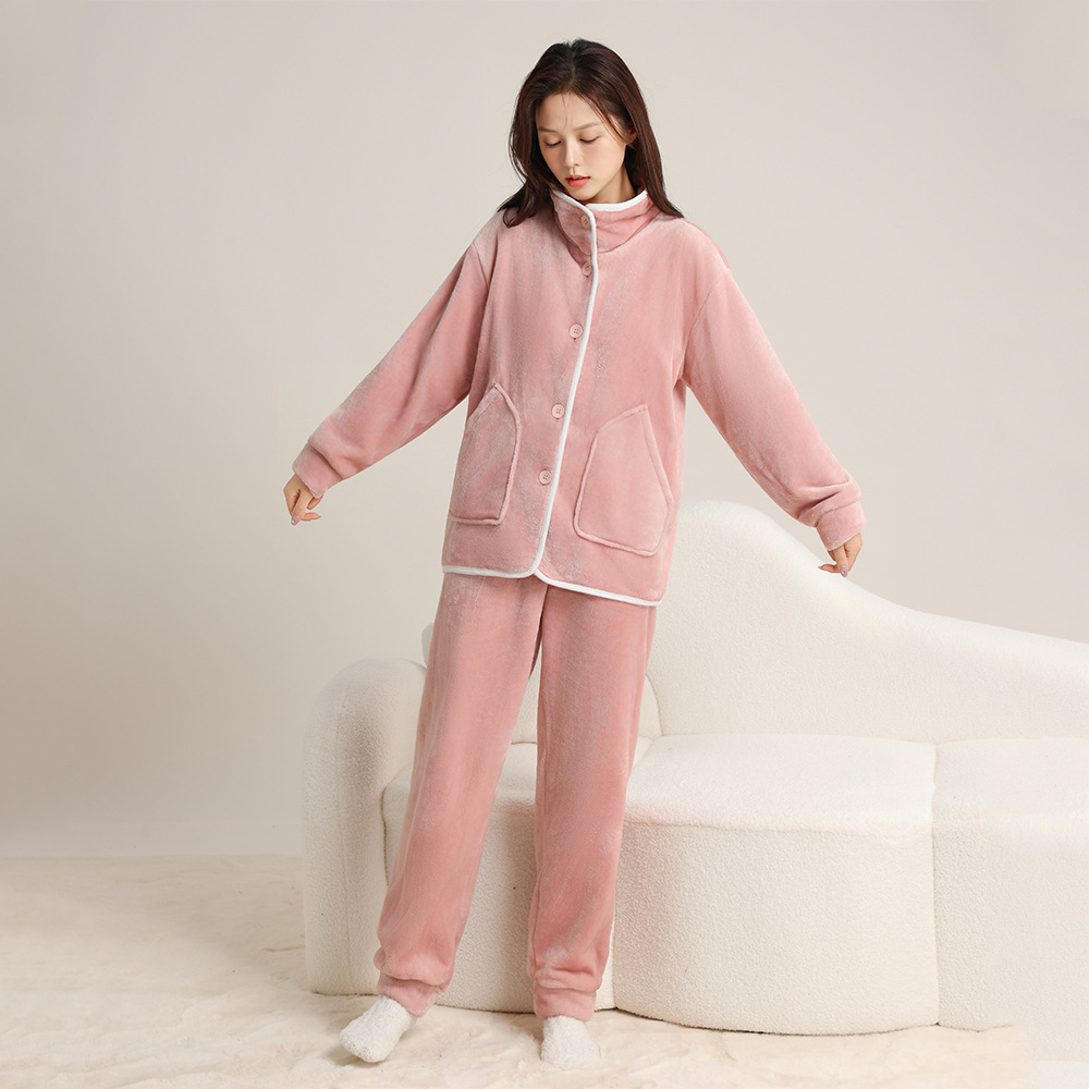 가을 겨울 남녀 플란넬 따뜻한 홈웨어, 스탠드 칼라 또는 라펠 칼라 선택 가능, 커플용 심플 두꺼운 잠옷 투피스 세트스토어 가기
