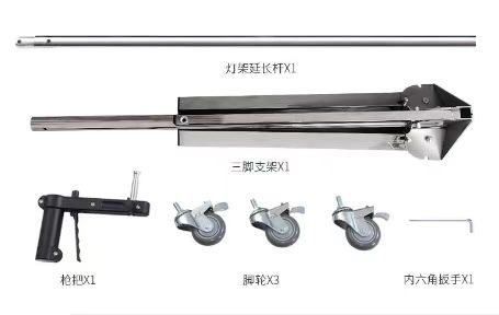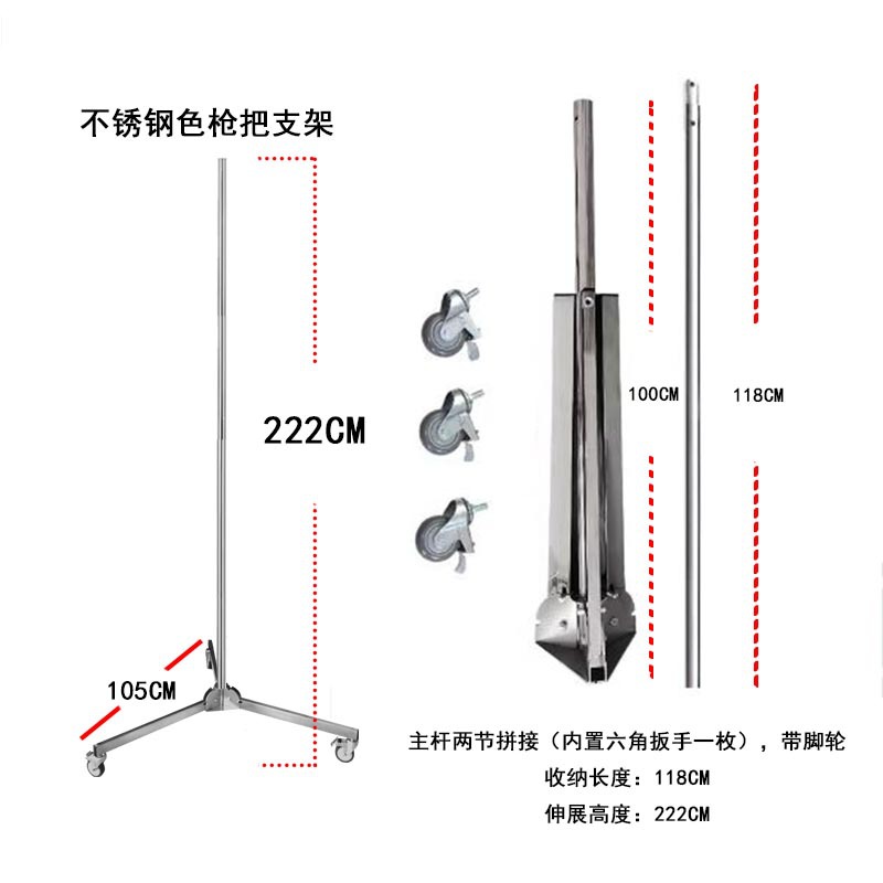枪把灯架分两个款式,黑色地灯架为一款(主杆四节拼接),不锈钢色地灯架为另一款(主杆两节拼接)。