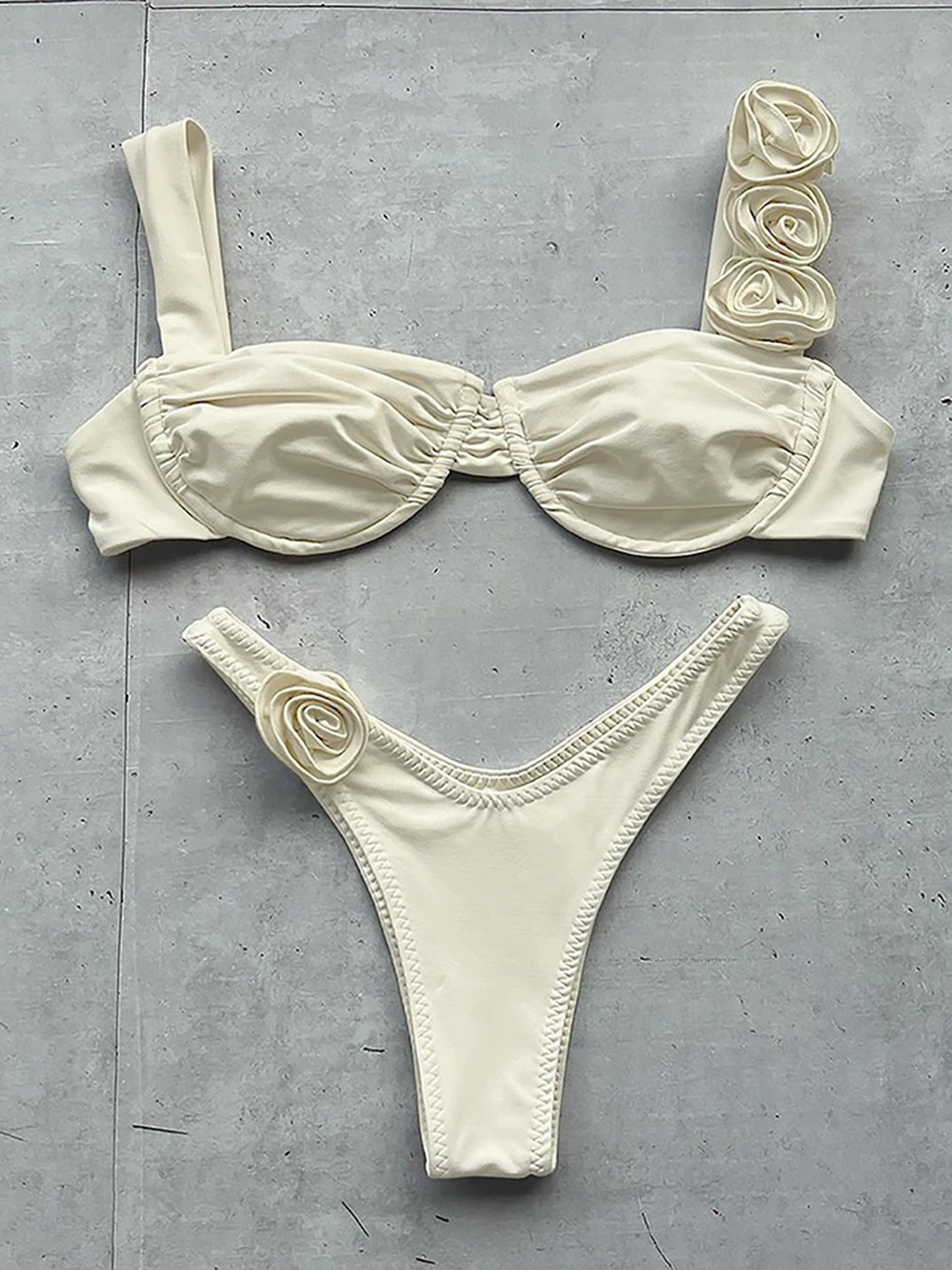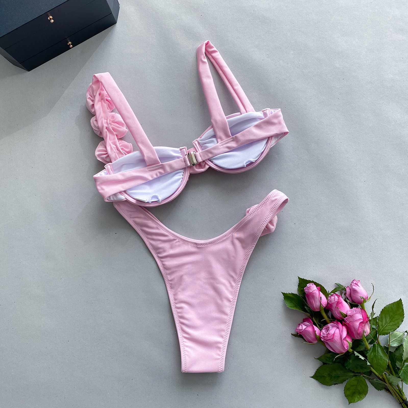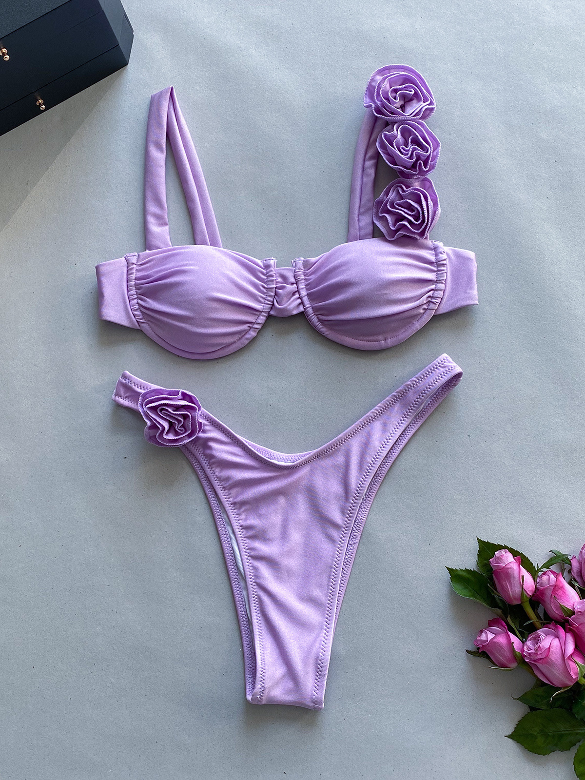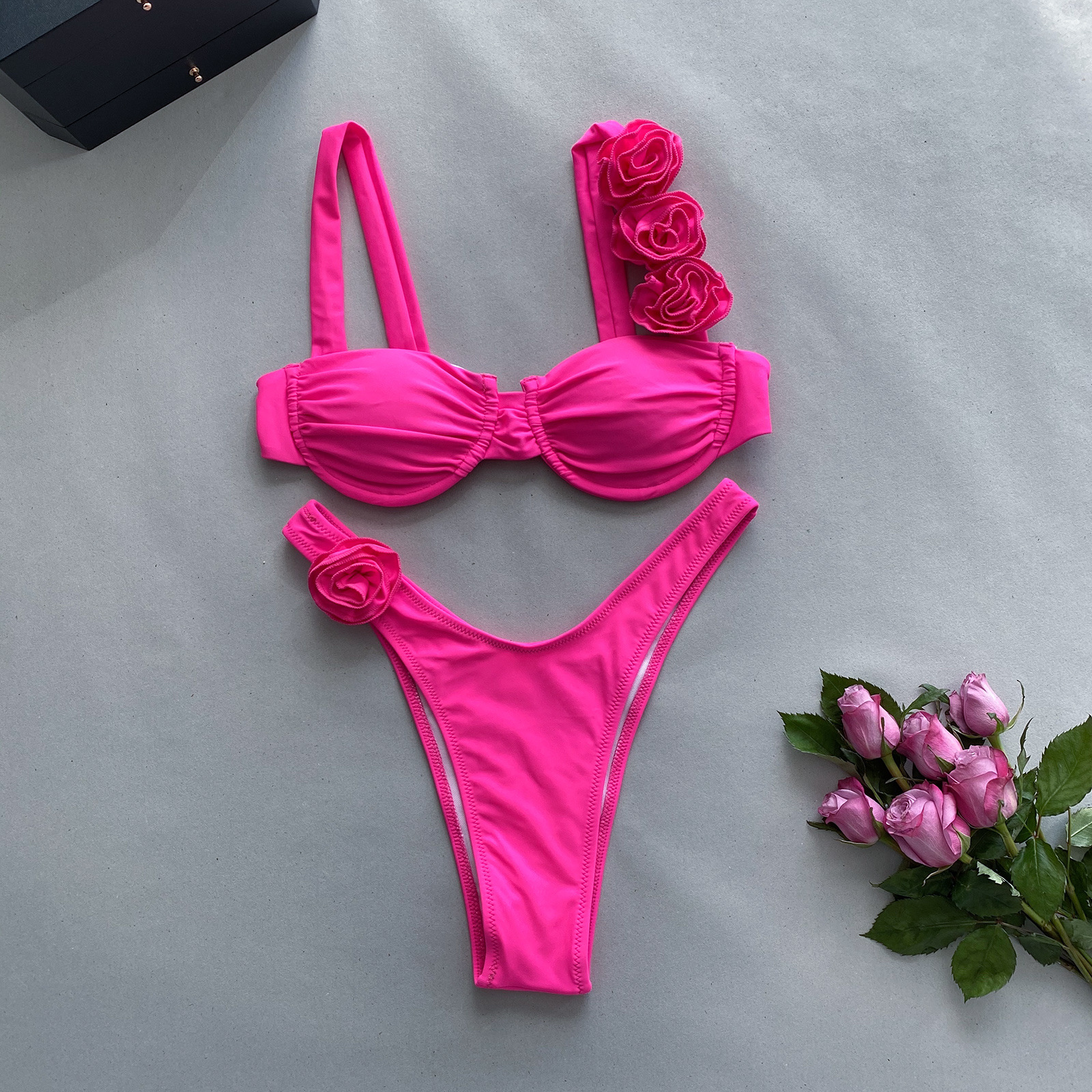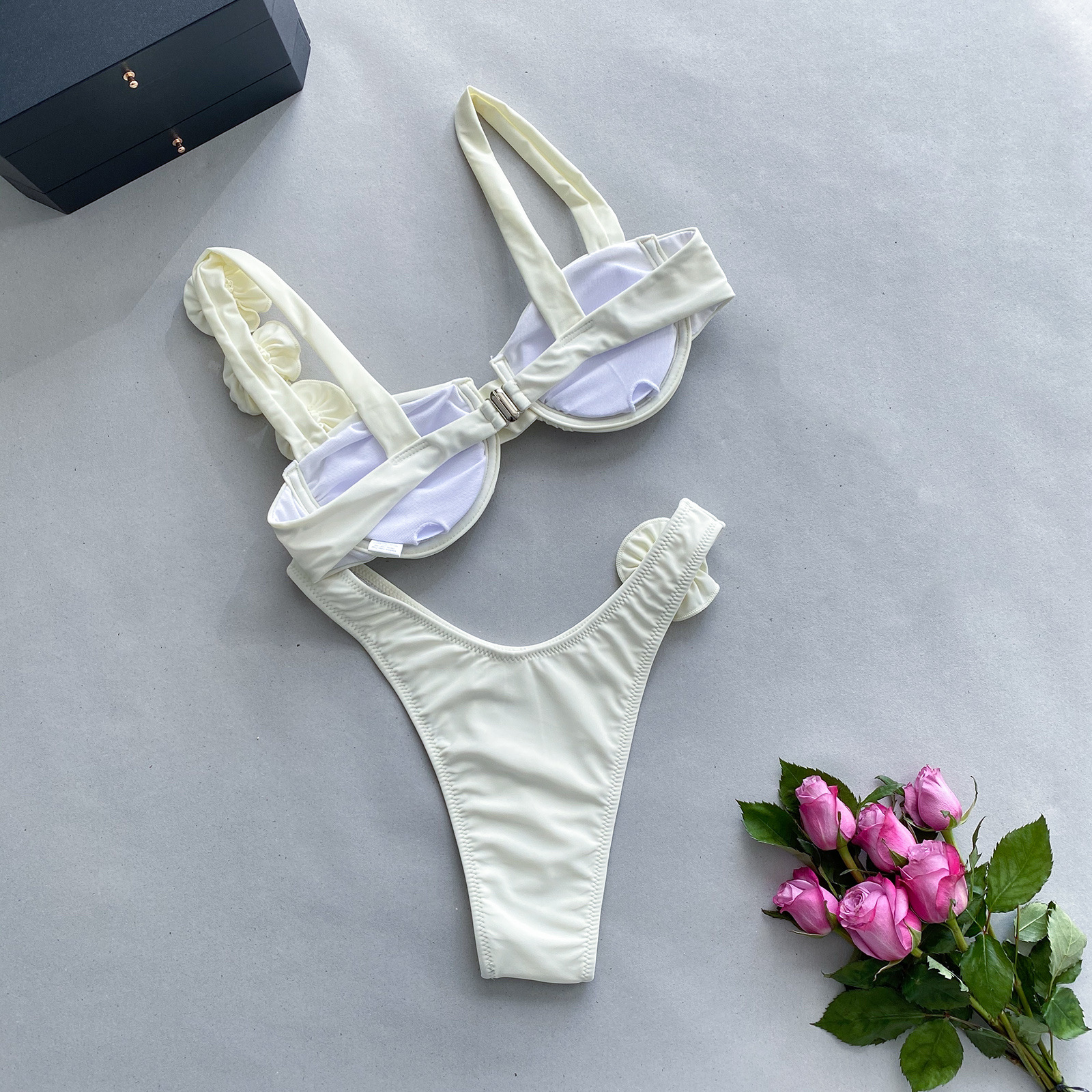 2023 새로운 비키니 유럽과 미국 비키니 단색 크로스 보더 스틸 브래킷 스테레오 플라워 스플릿 여성용 수영복스토어 가기