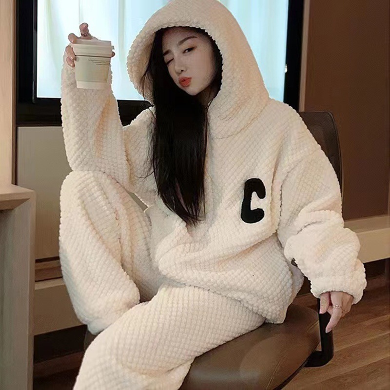 가을 겨울 두꺼운 우롱 복숭아 잠옷 세트는 작은 향기로운 카디건 가정 의류 여성용 따뜻한 플란넬 잠옷 외부에 착용 가능스토어 가기