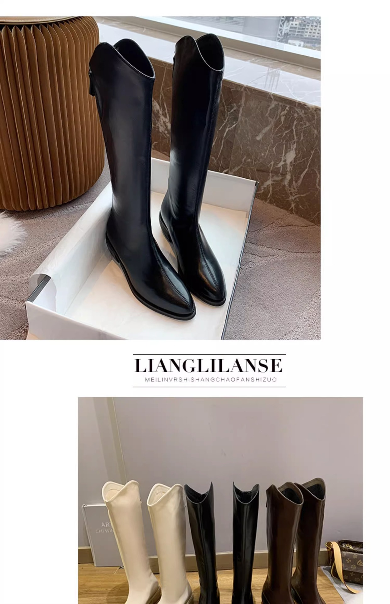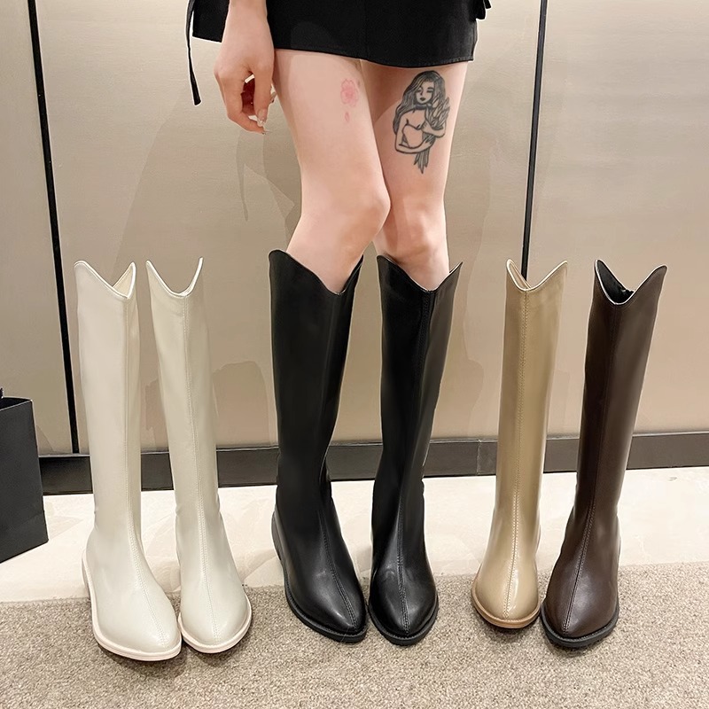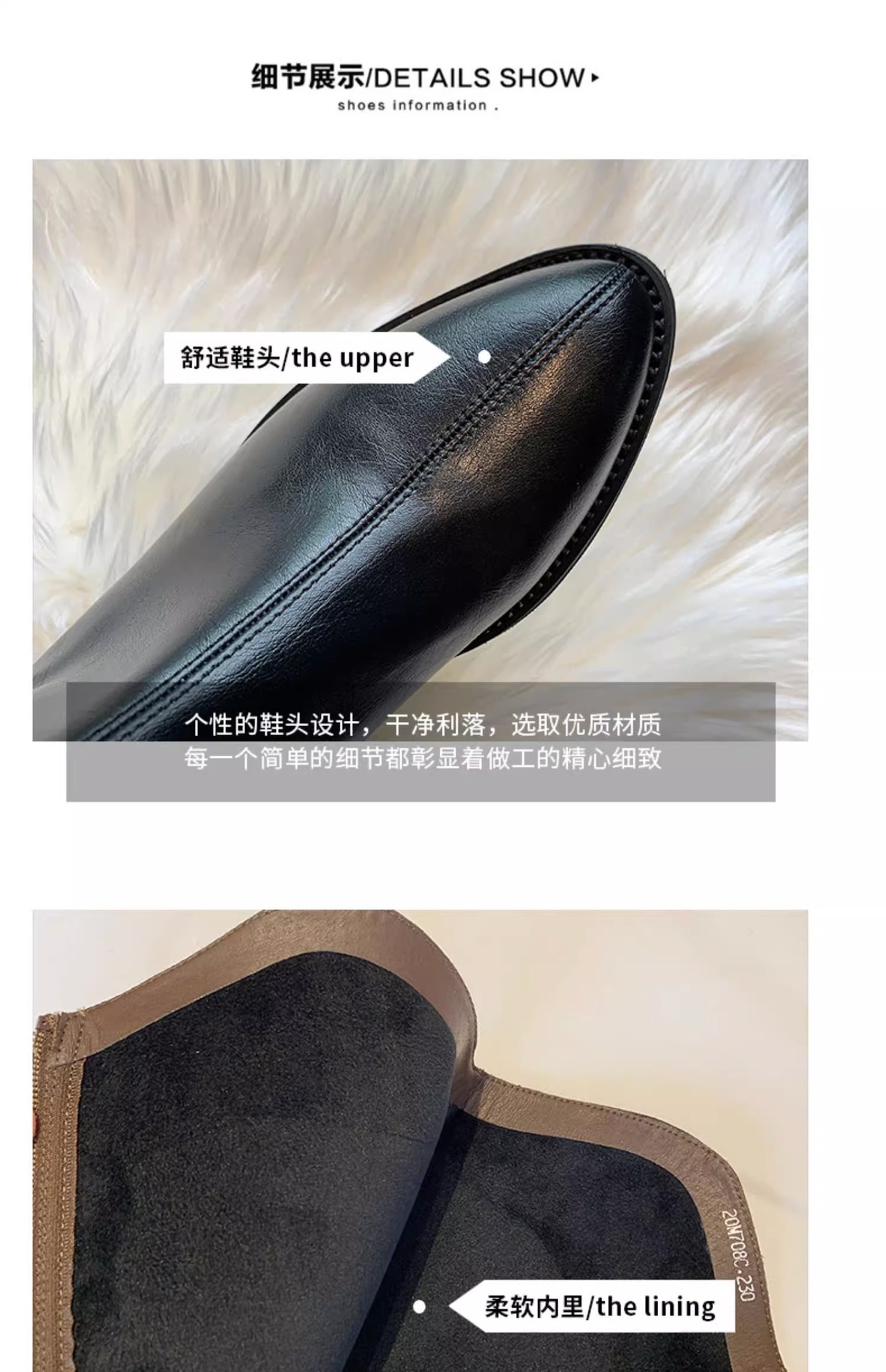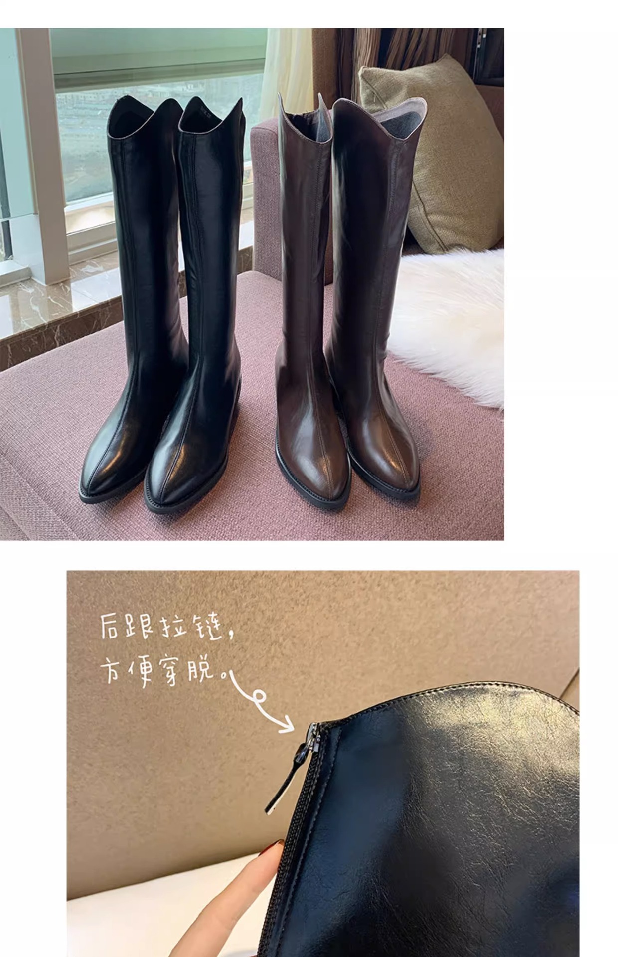 정품 가죽 부츠 V 입 밀크 티 컬러 브라운 봄, 가을 두꺼운 굽 부츠 여성 겨울 새로운 스타일 작은 하이 부츠스토어 가기
