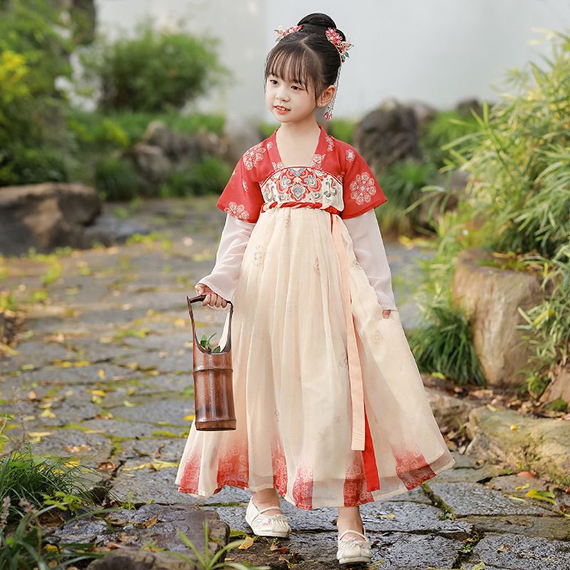 여아 한푸 봄과 가을 신상품 여아 둔황 슈퍼 요정 스커트 우아한 고대 비용 크기 아기 고대 스타일 공주 축제 탱 세트