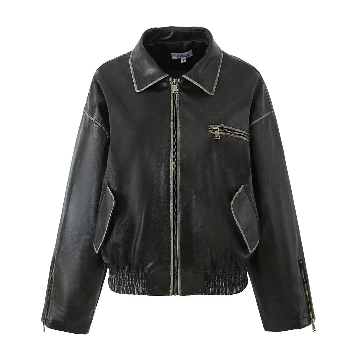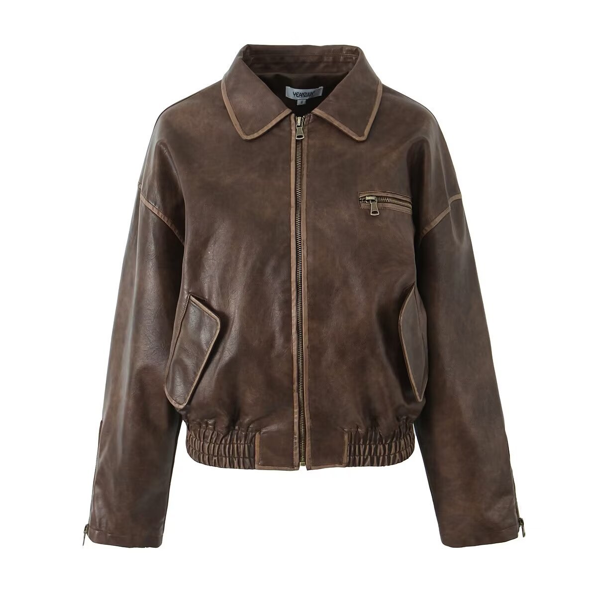 빈티지 색상 씻어 오래 된 가죽 코트 여자의 2023 가을 새로운 멋진 뜨거운 소녀 느슨한 옷깃 오토바이 재킷스토어 가기