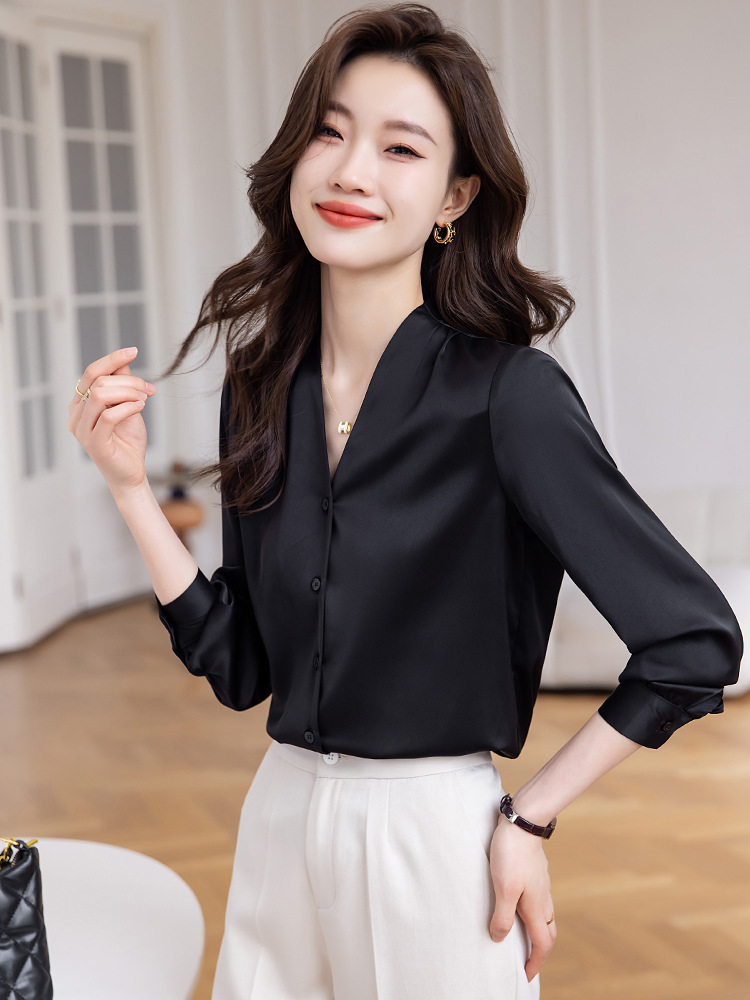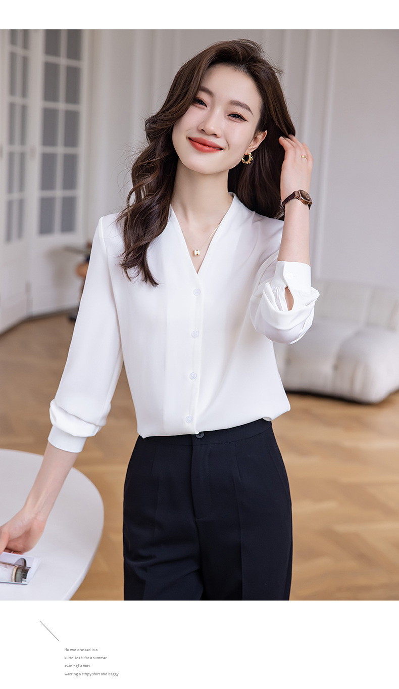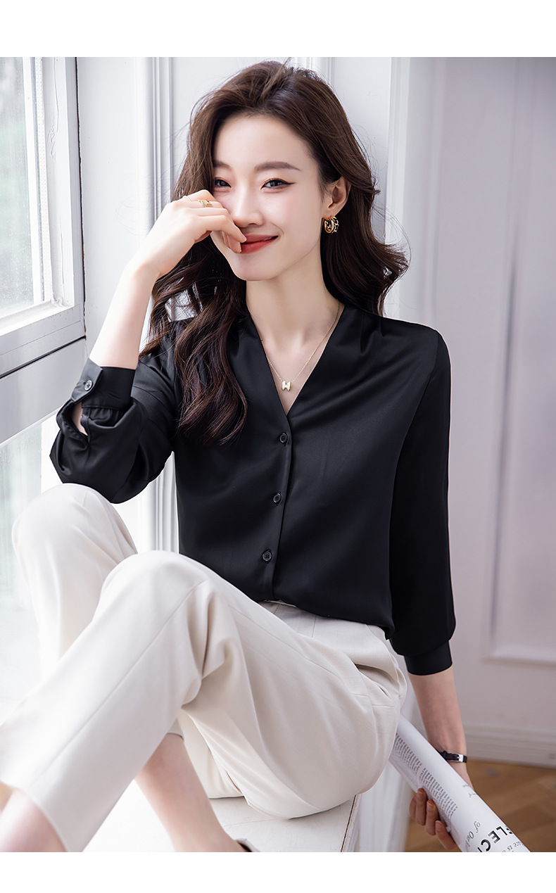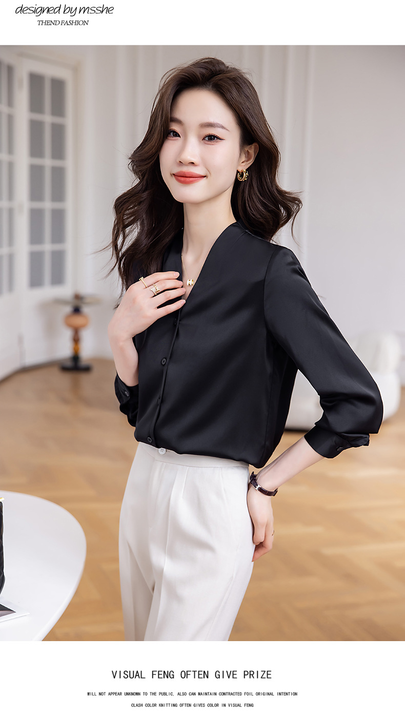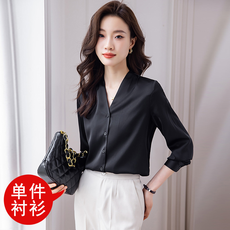 블랙 긴 소매 셔츠 여성의 패션 웨스턴 스타일 2023 가을 V-넥 쉬폰 셔츠 고급 전문 기질 탑 0