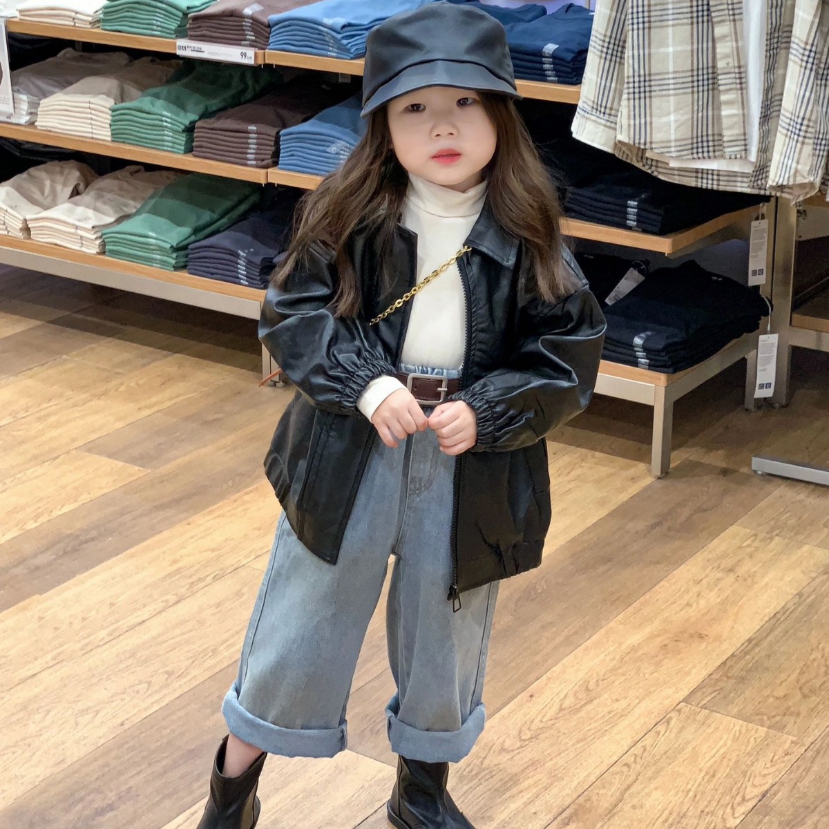 한국 스타일 아동복 2024 가을 신상 여아 패션 가죽 자켓, 터틀넥 밑단 셔츠, 스트레이트 레그 청바지 정장스토어 가기