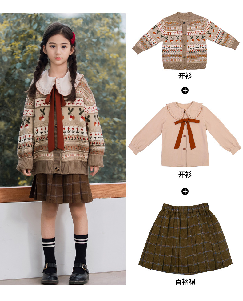 女童套装裙2024春秋装新款童装开衫毛衣外套儿童衬衫百褶裙三件套