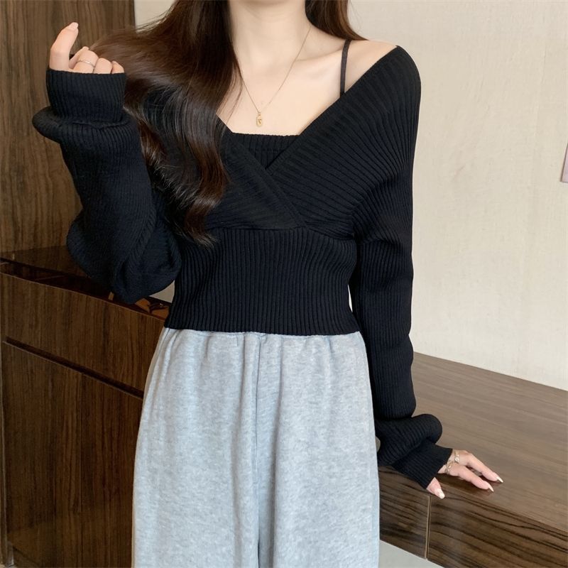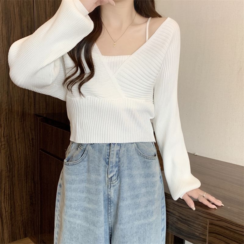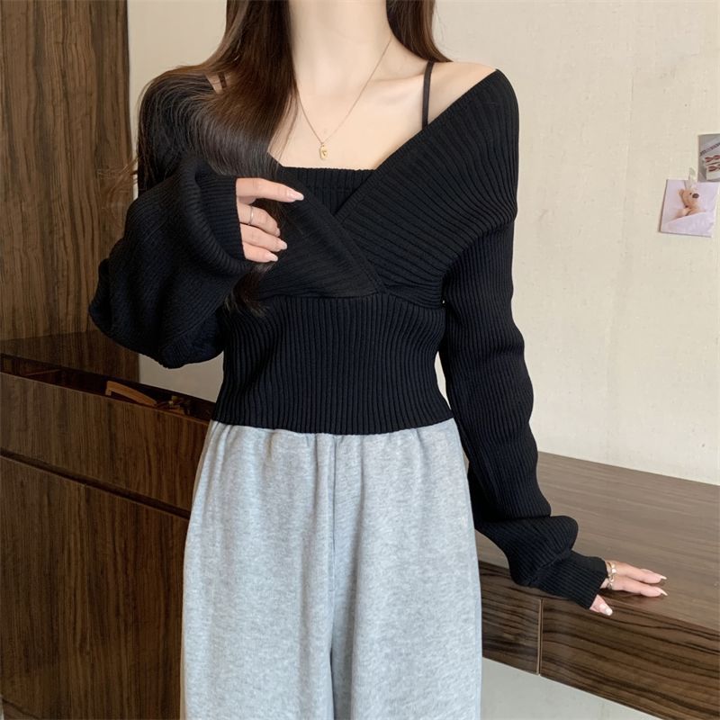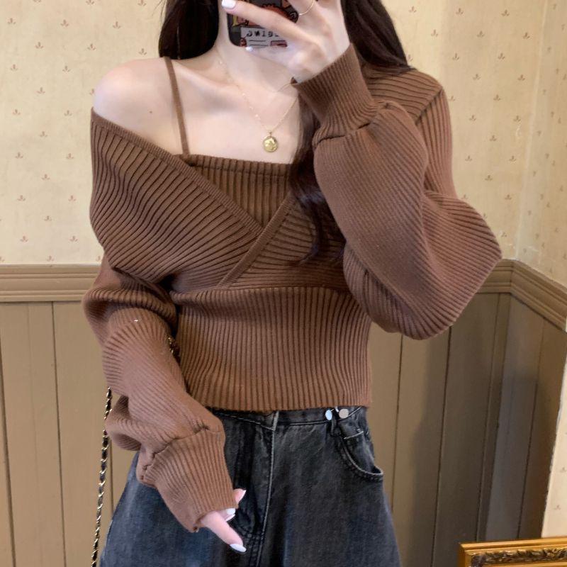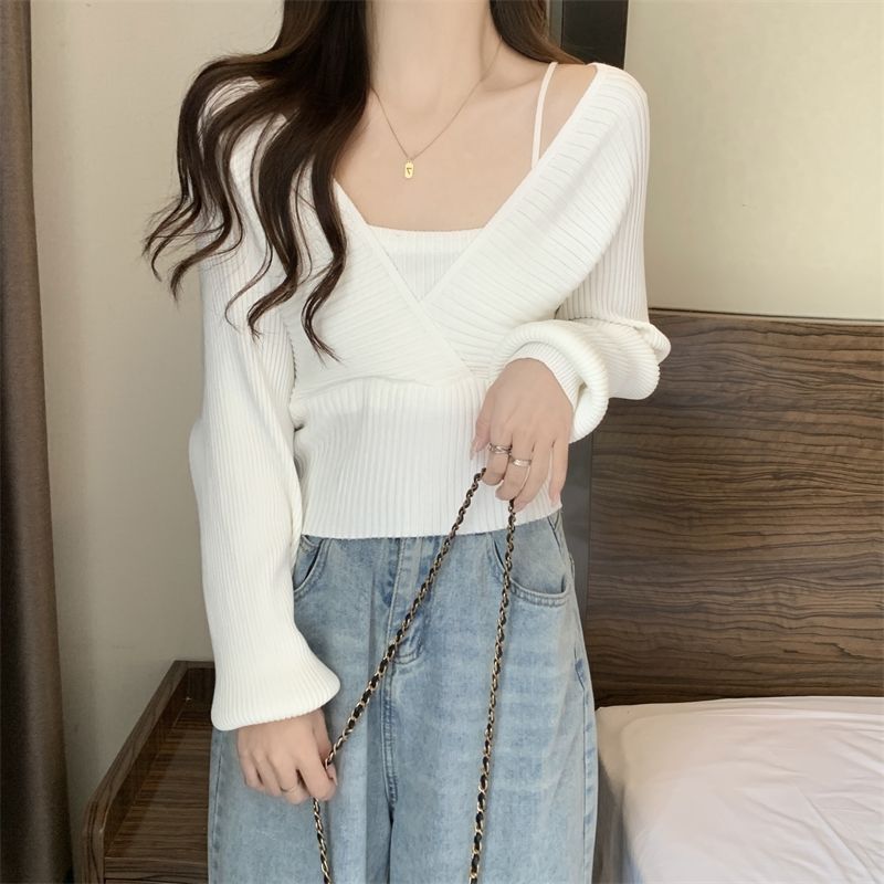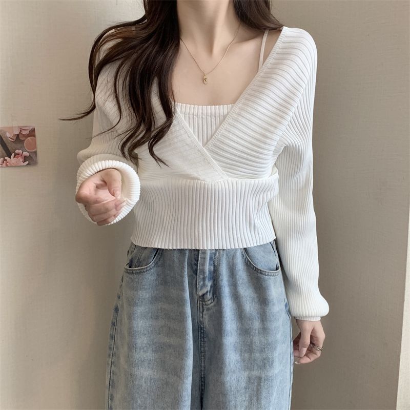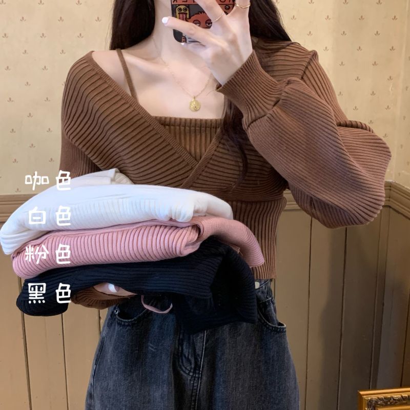 2025년 가을 여성을 위한 가짜 투피스 시크 스웨터 새로운 디자인 이너 레이어드 셔츠 하이엔드 탑 스웨터스토어 가기