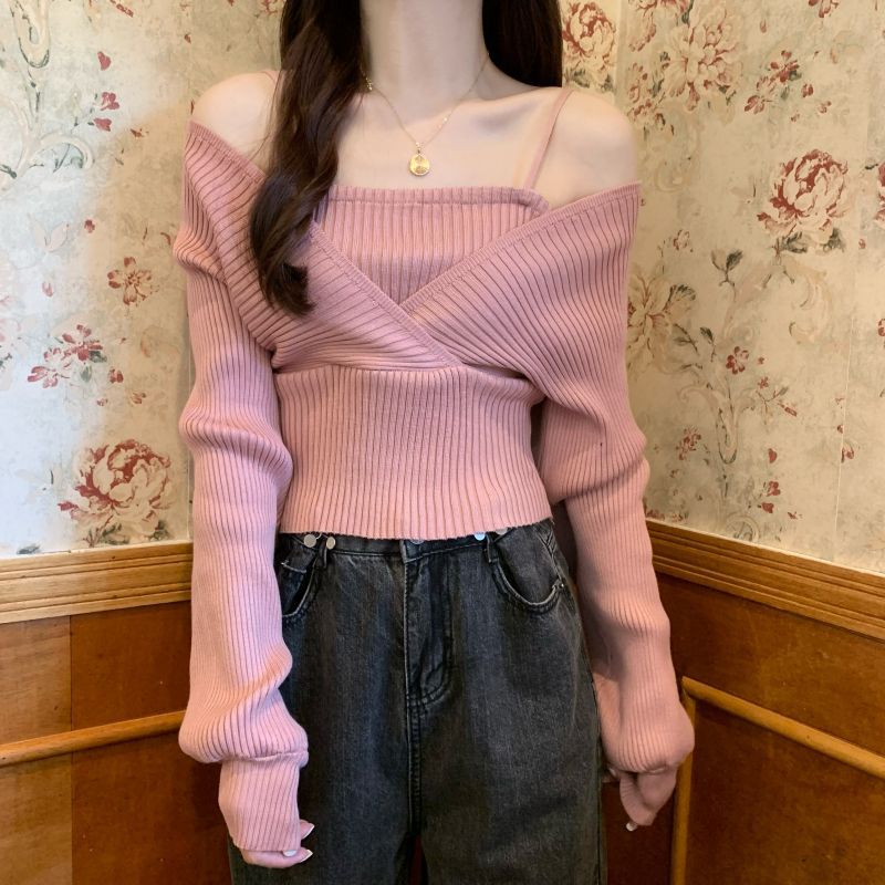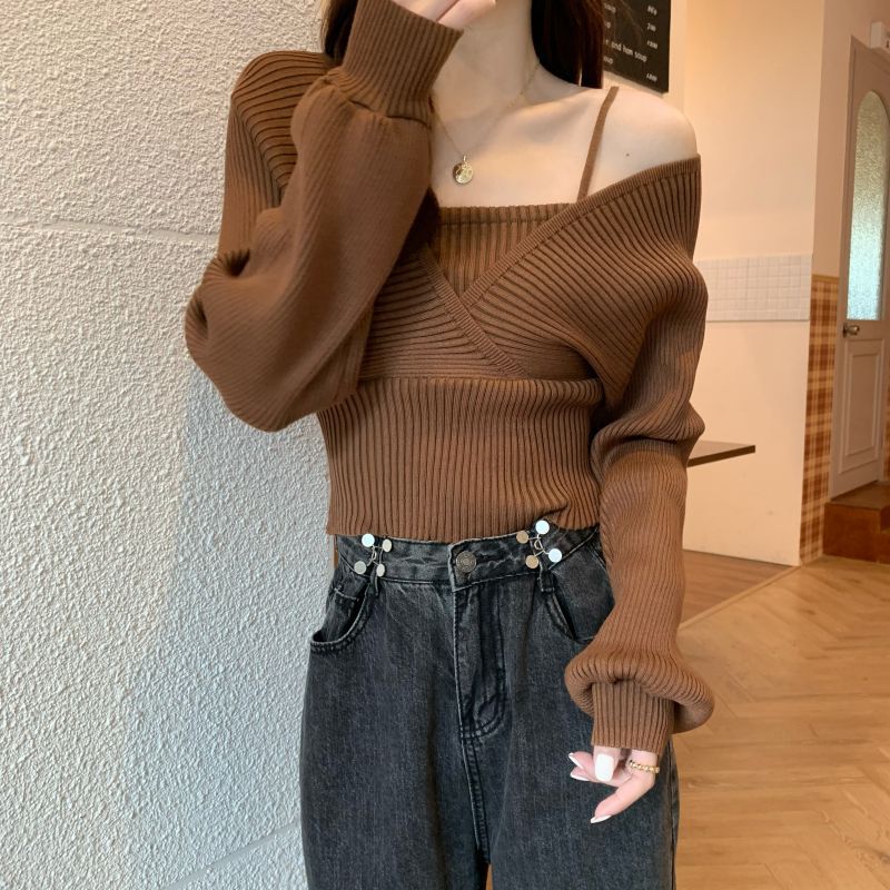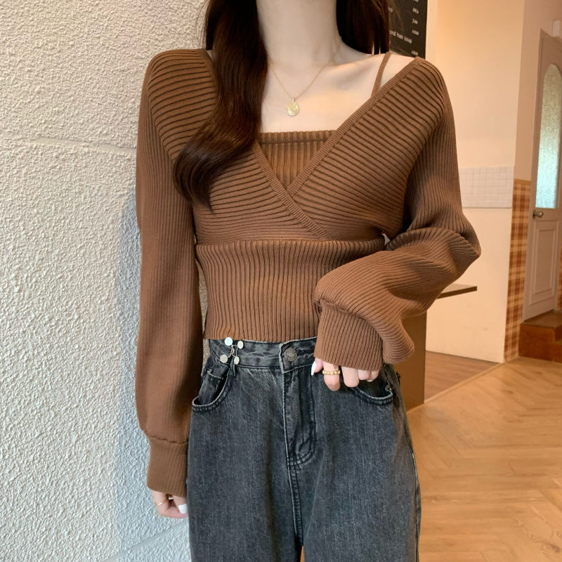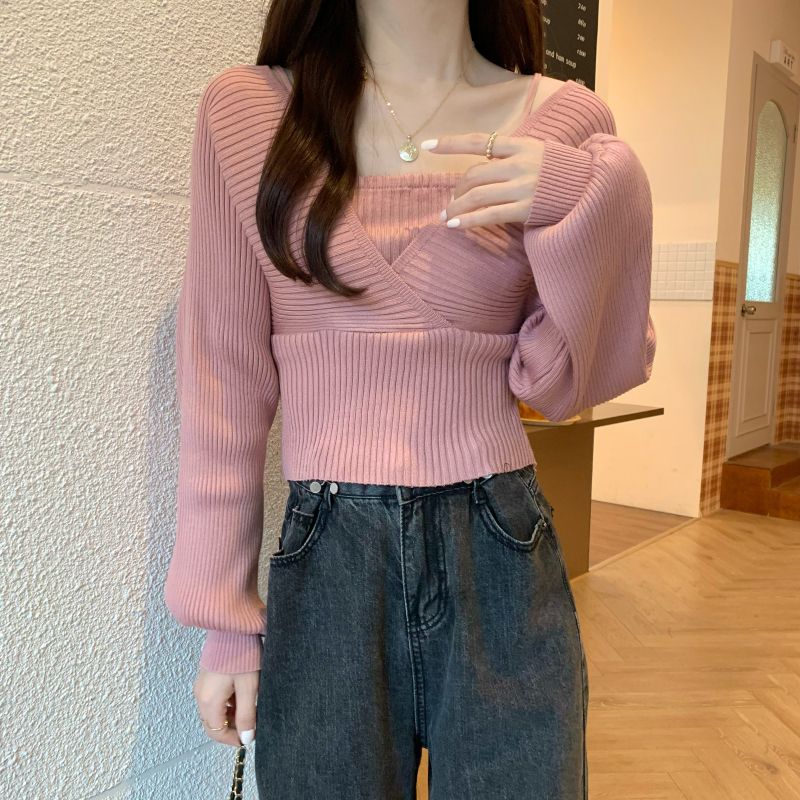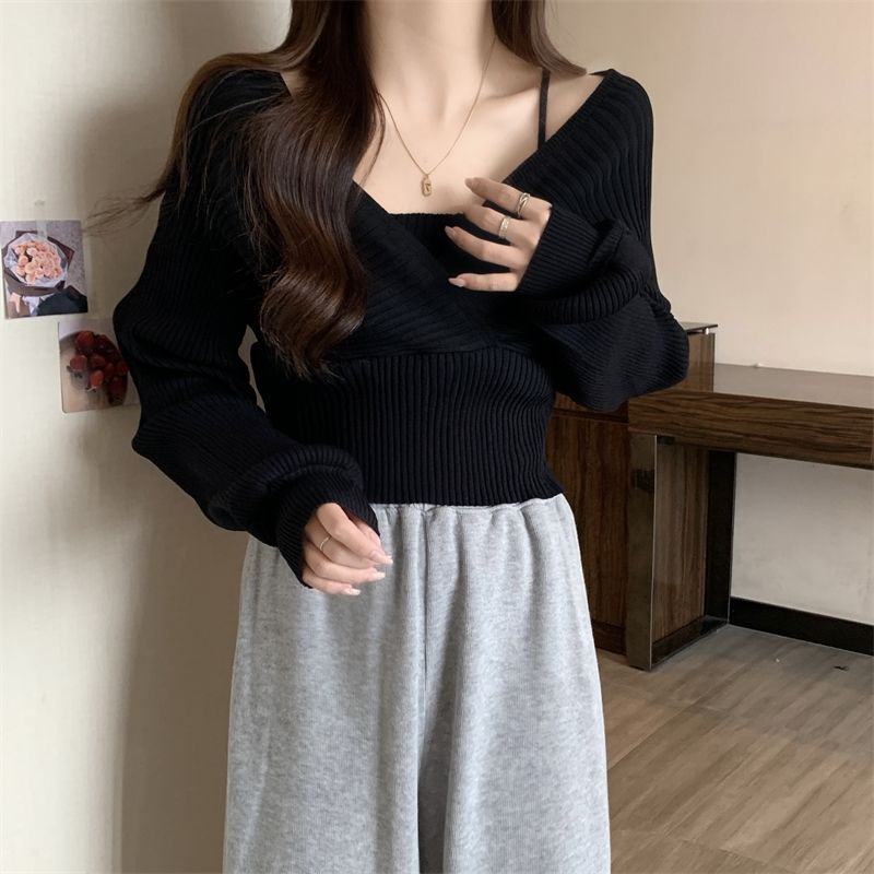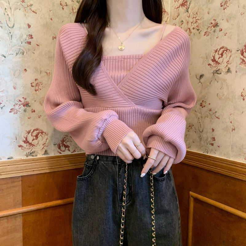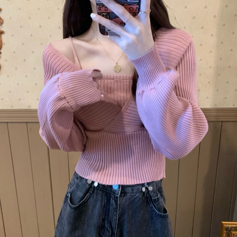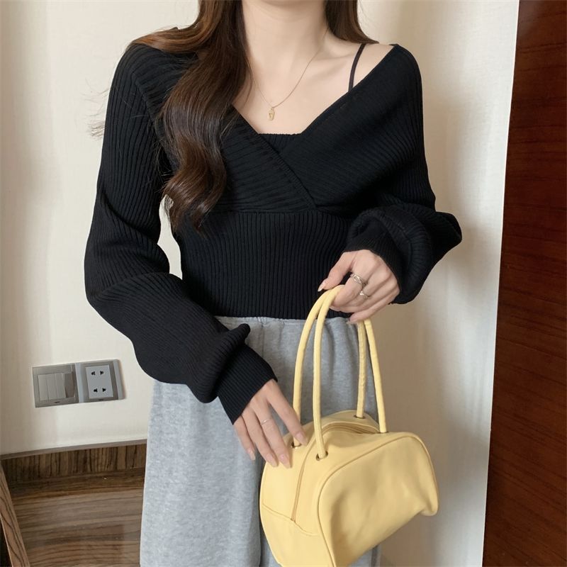 2025년 가을 여성을 위한 가짜 투피스 시크 스웨터 새로운 디자인 이너 레이어드 셔츠 하이엔드 탑 스웨터스토어 가기