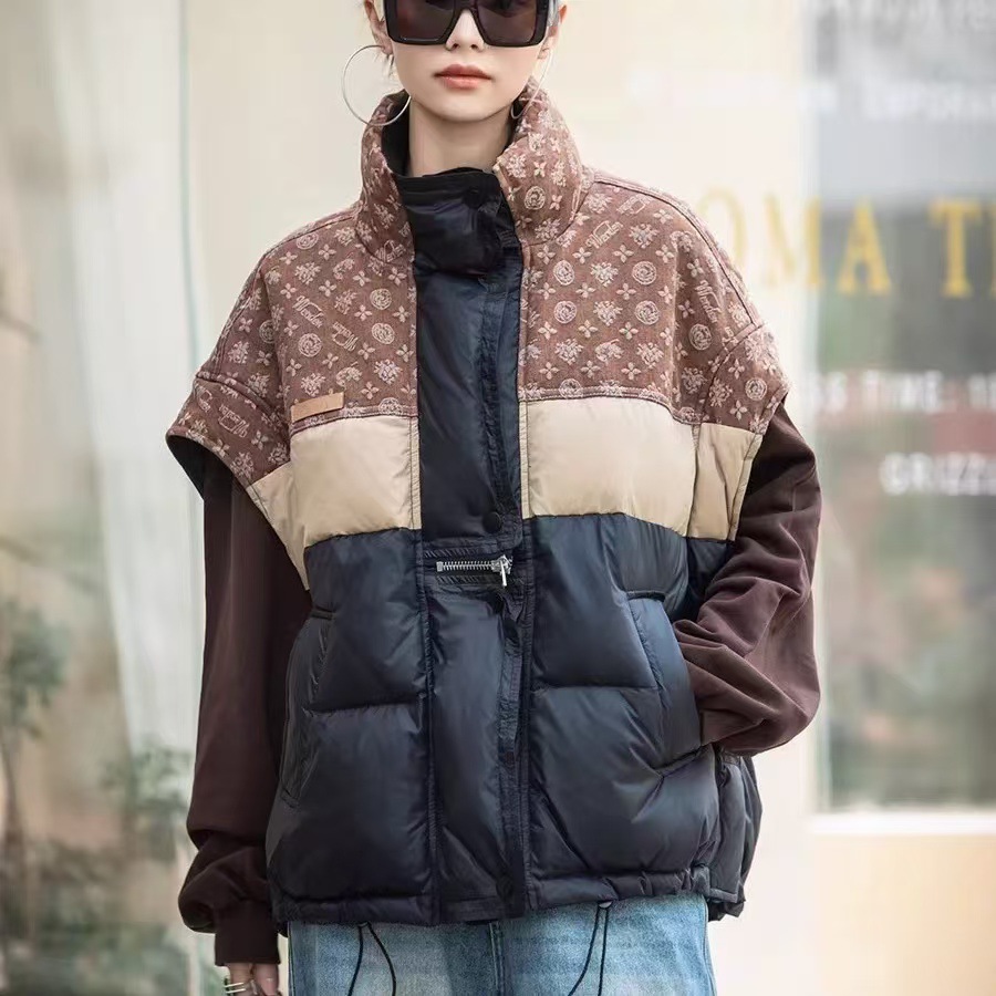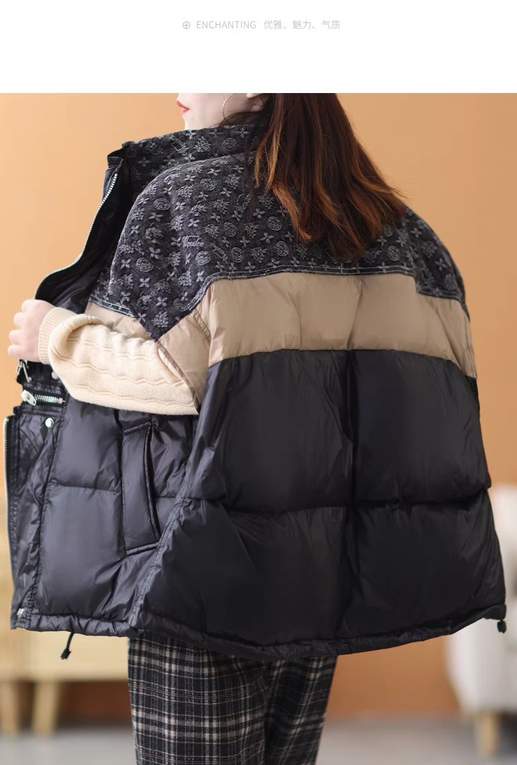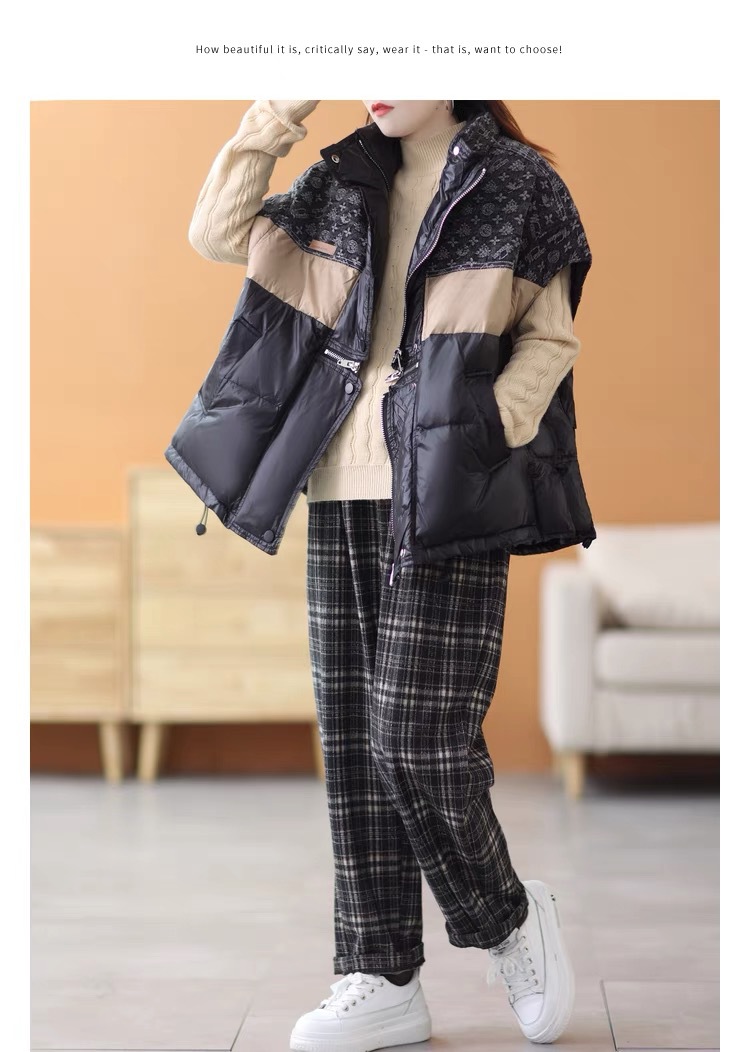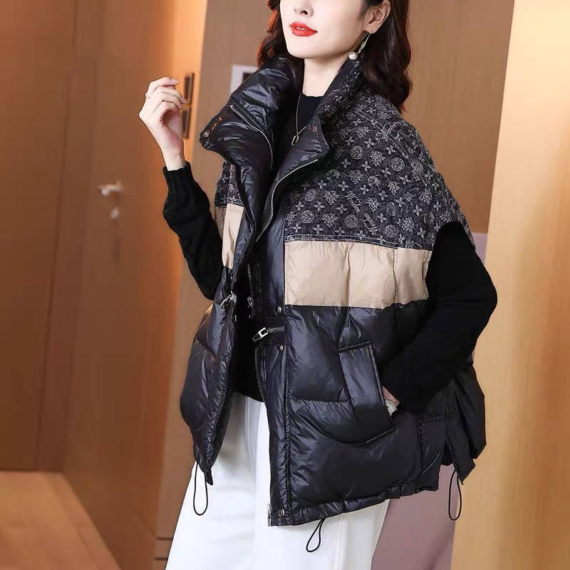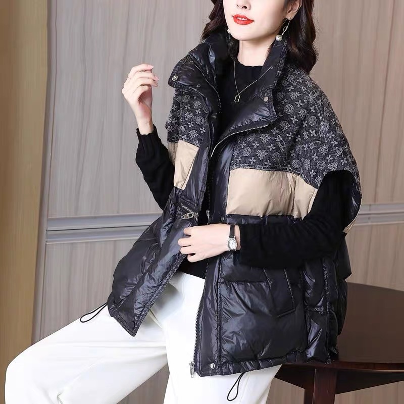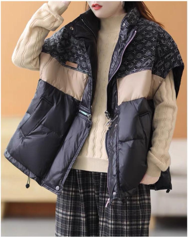 2025 가을 겨울 신상 배색 스탠드 칼라 한국 스타일 패션 루즈핏 다운 조끼 다용도 여성용 화이트 덕다운 재킷스토어 가기
