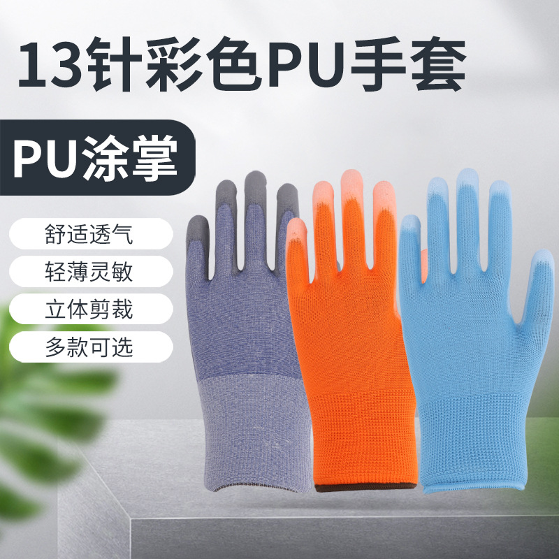 재고 13 핀 컬러 PU 팜 코팅 장갑 남성과 여성을 위한 팜 디핑 먼지 없는 정전기 방지 PU 장갑 전자 공장스토어 가기