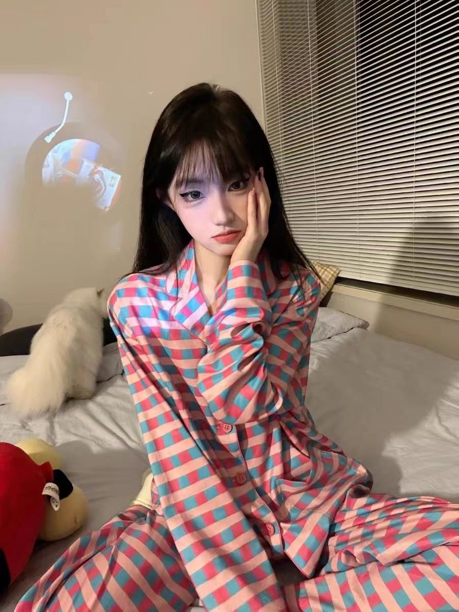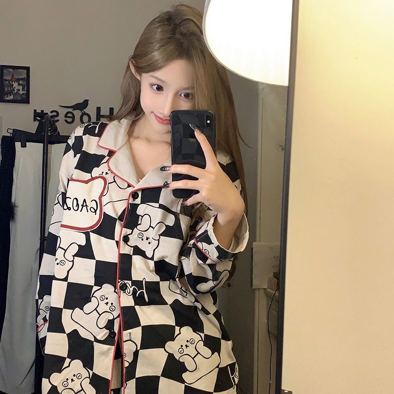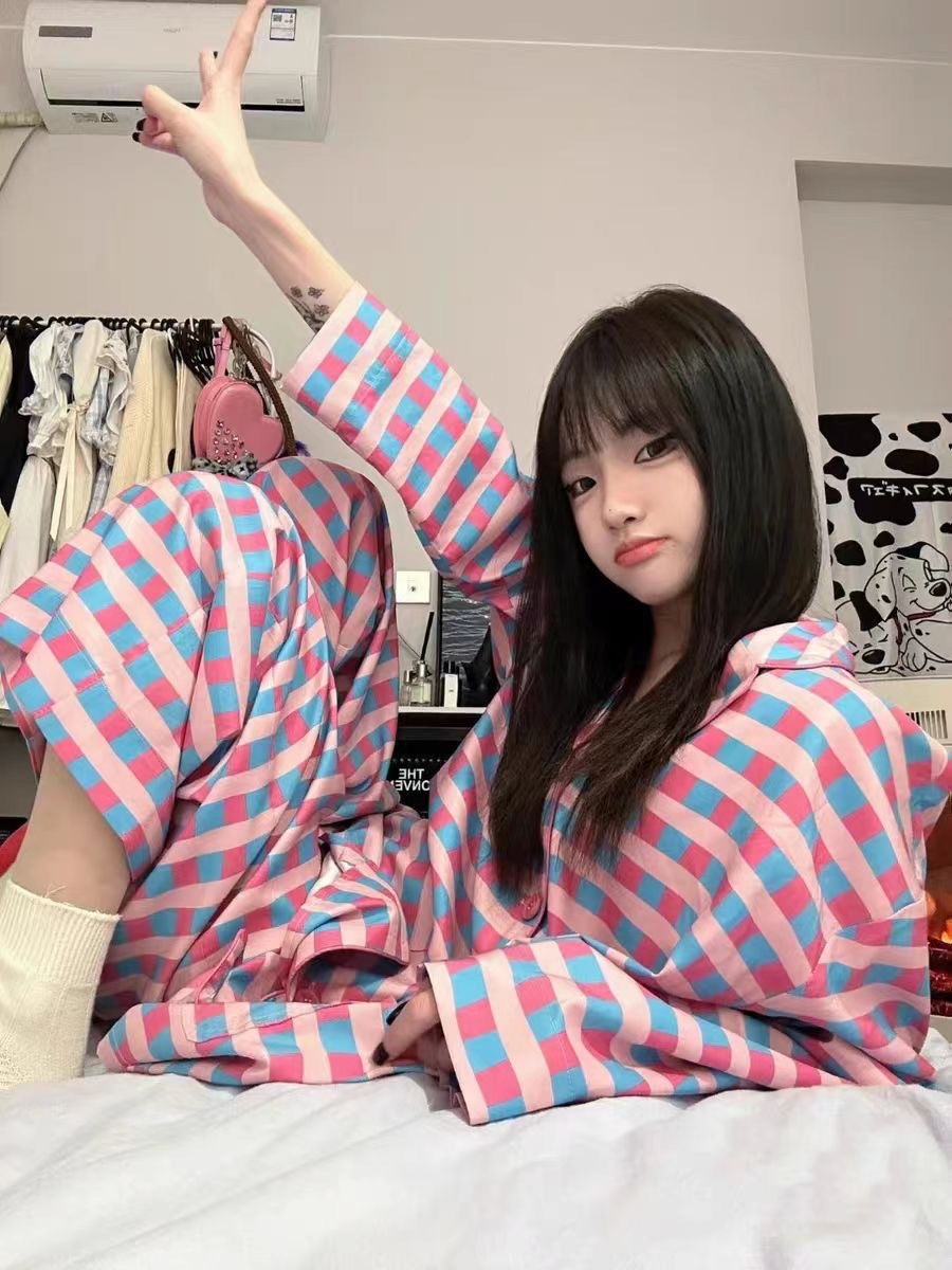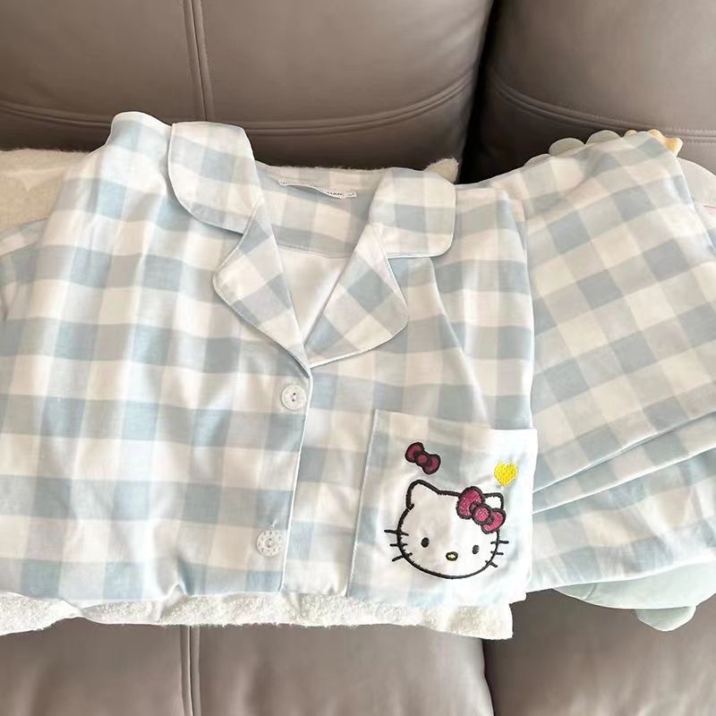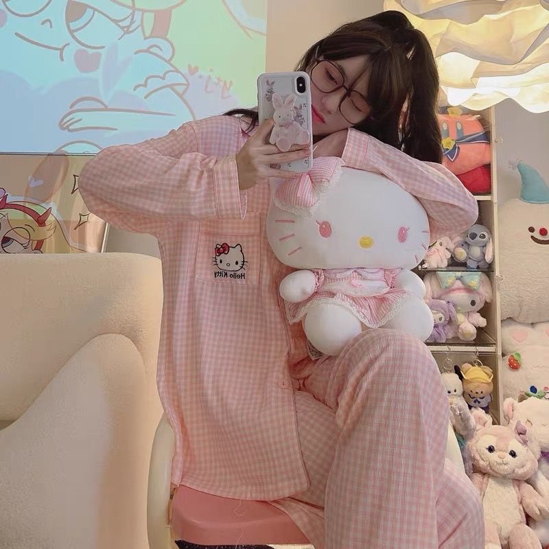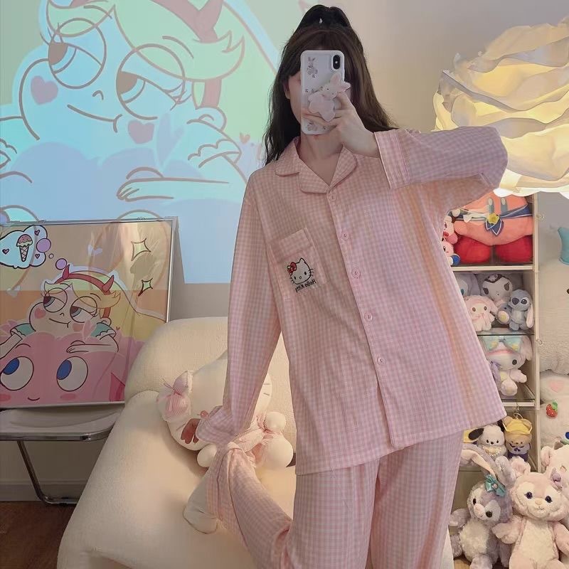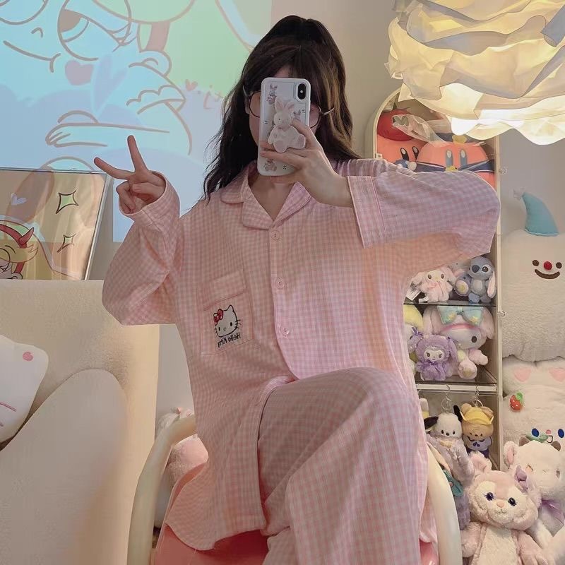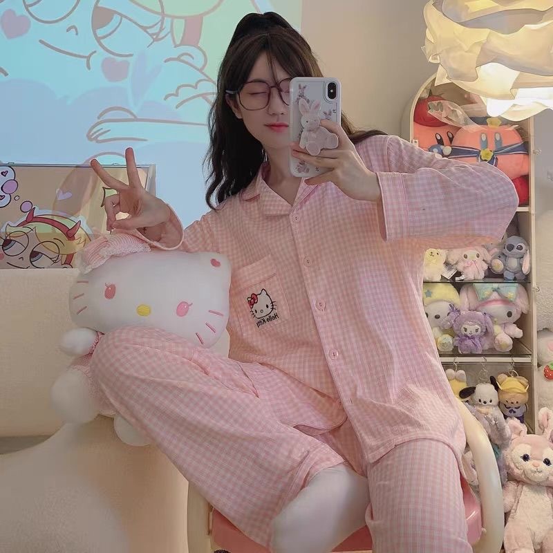 일본식 귀여운 격자 무늬 키티 고양이 잠옷 여성용 봄과 가을 긴팔 바지 학생용 투피스 의상스토어 가기