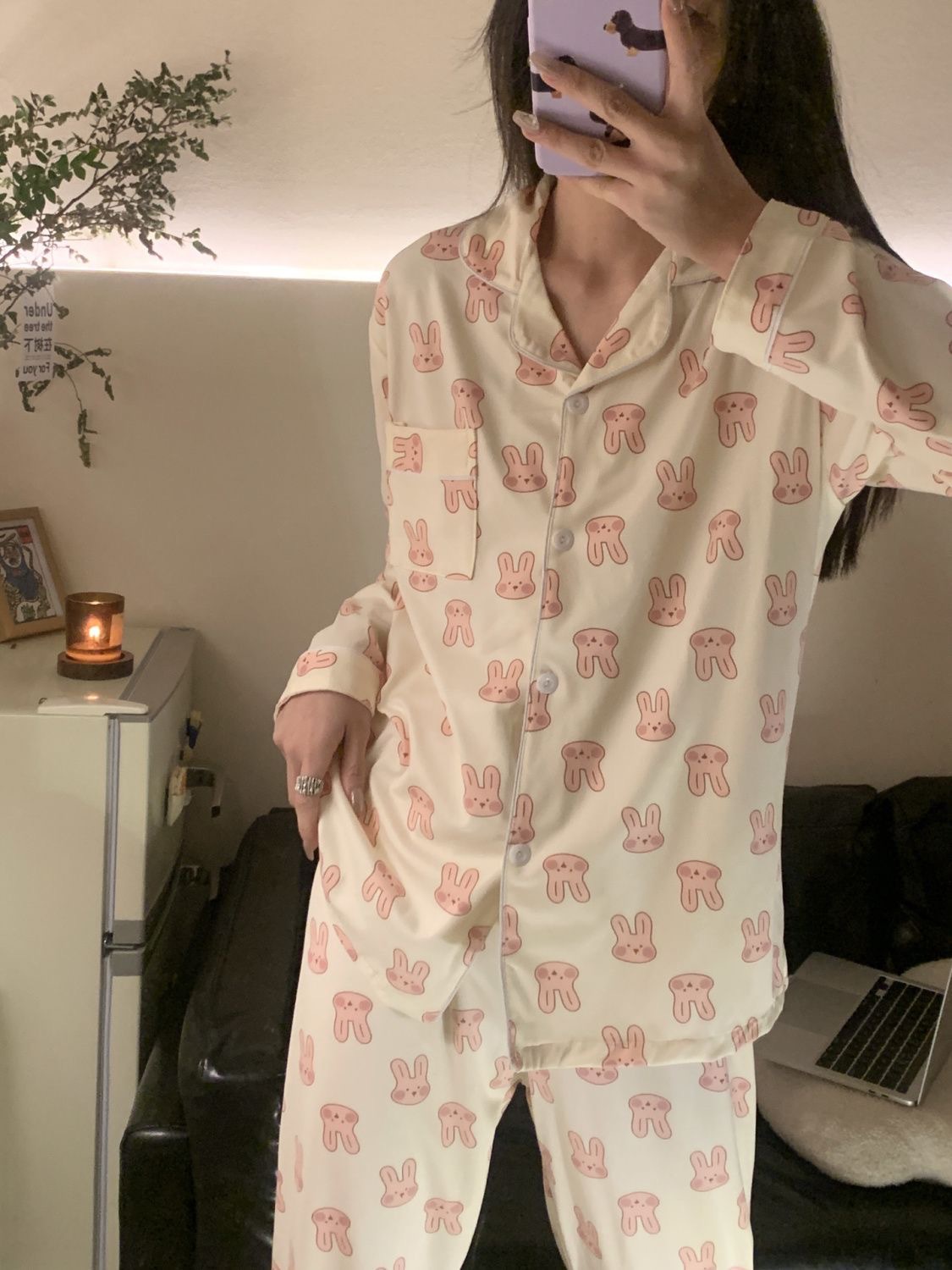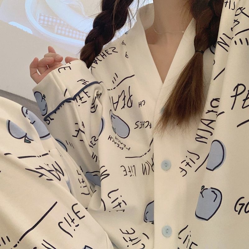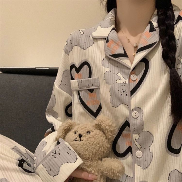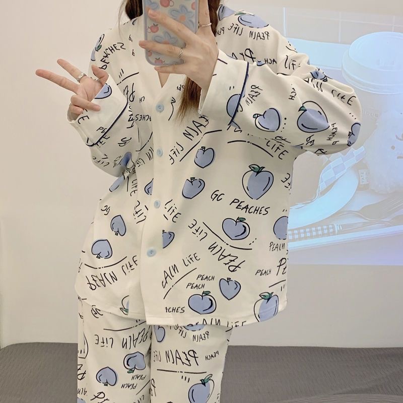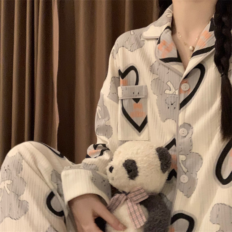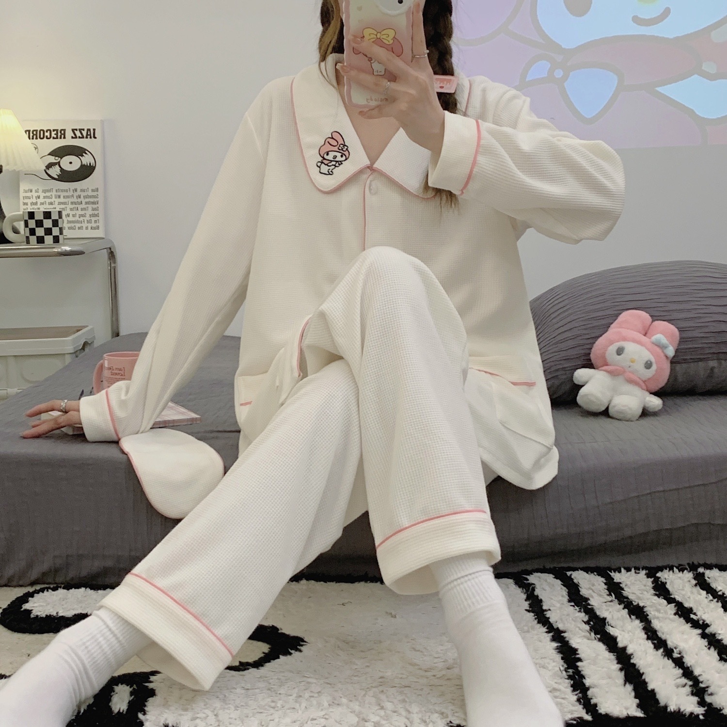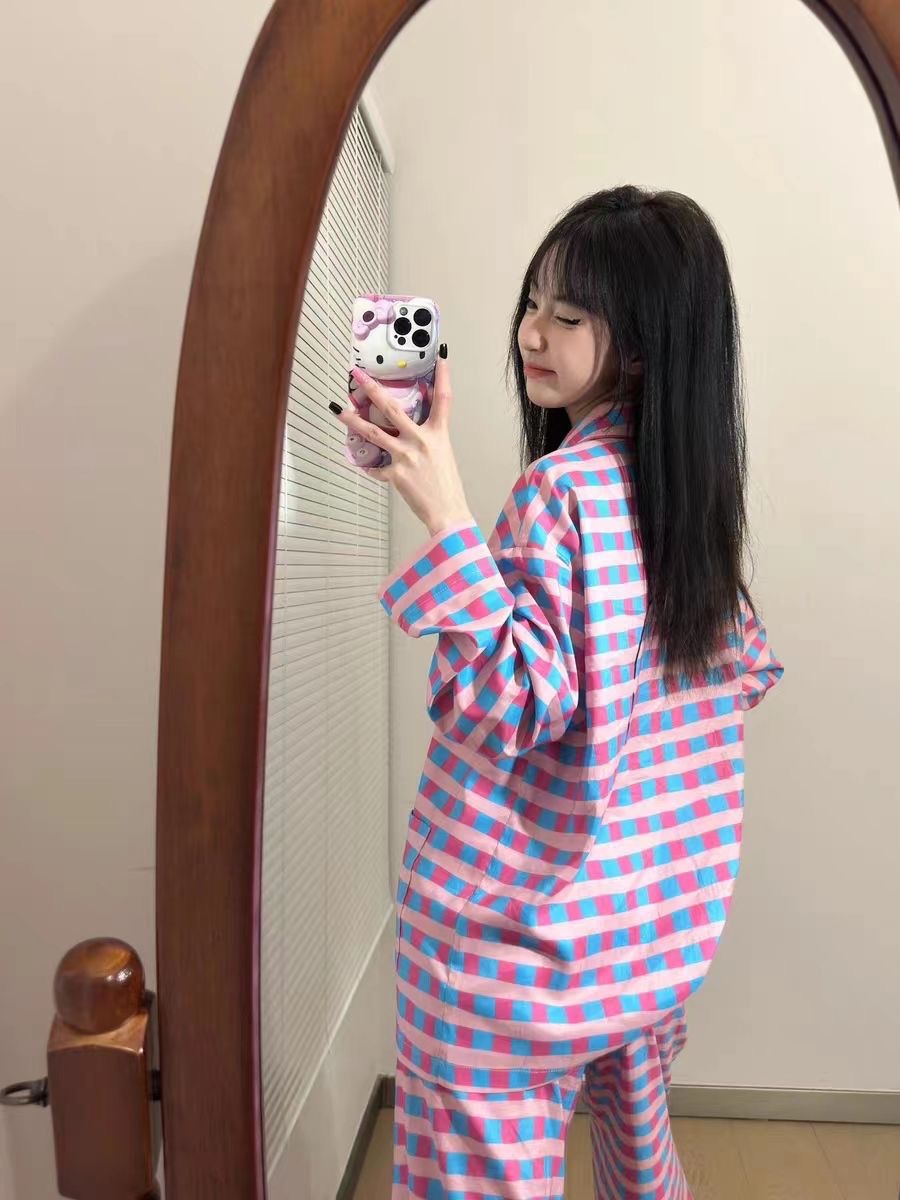 일본식 귀여운 격자 무늬 키티 고양이 잠옷 여성용 봄과 가을 긴팔 바지 학생용 투피스 의상스토어 가기