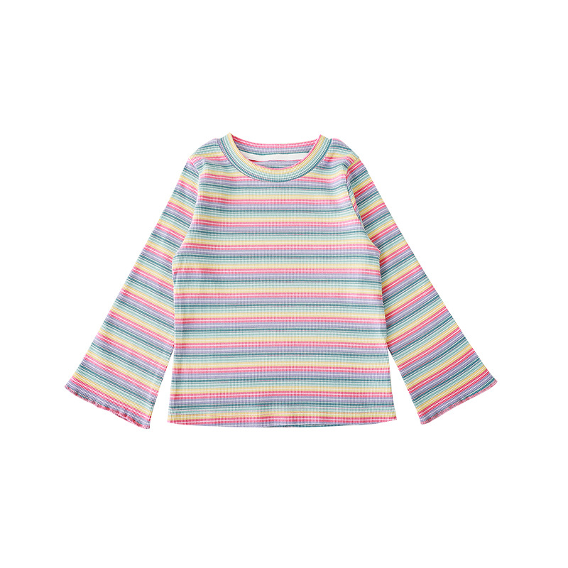 Qiu Duo Meng 여아용 무지개 니트 스트라이프 이너웨어 2025 신상 가을 겨울 아동용 한국 스타일 약간의 플레어 소매 탑