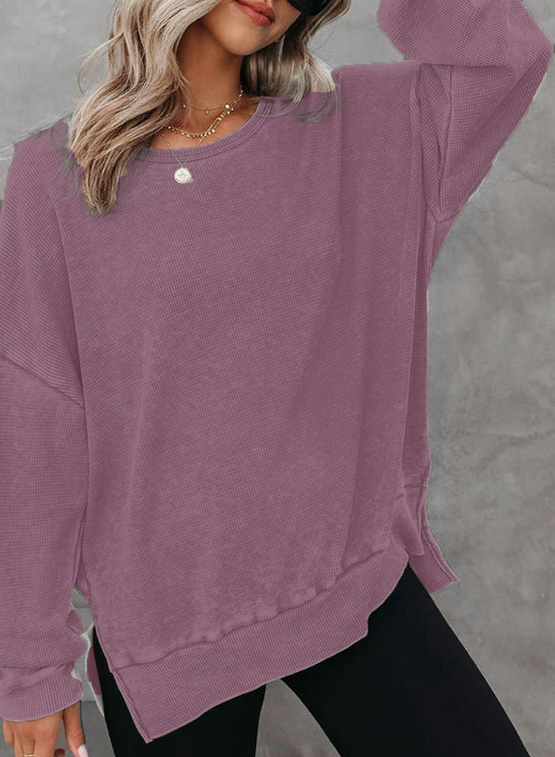 2025 유럽과 미국의 국경 간 여성 의류 Amazon 가을 새로운 라운드 넥 긴팔 사이드 슬릿 와플 스웨트 셔츠 여성용