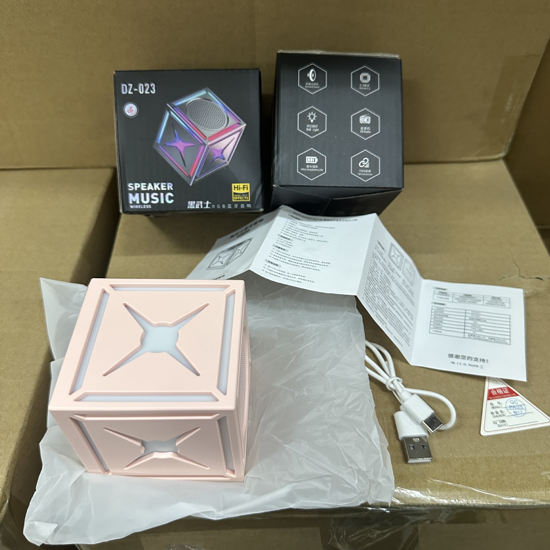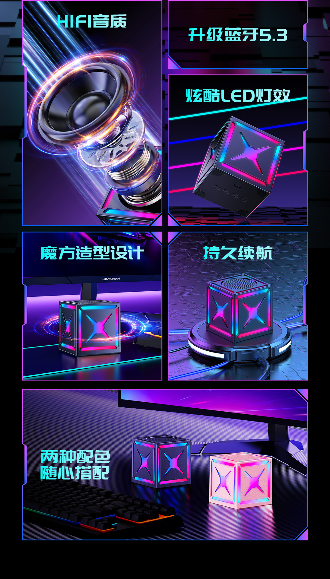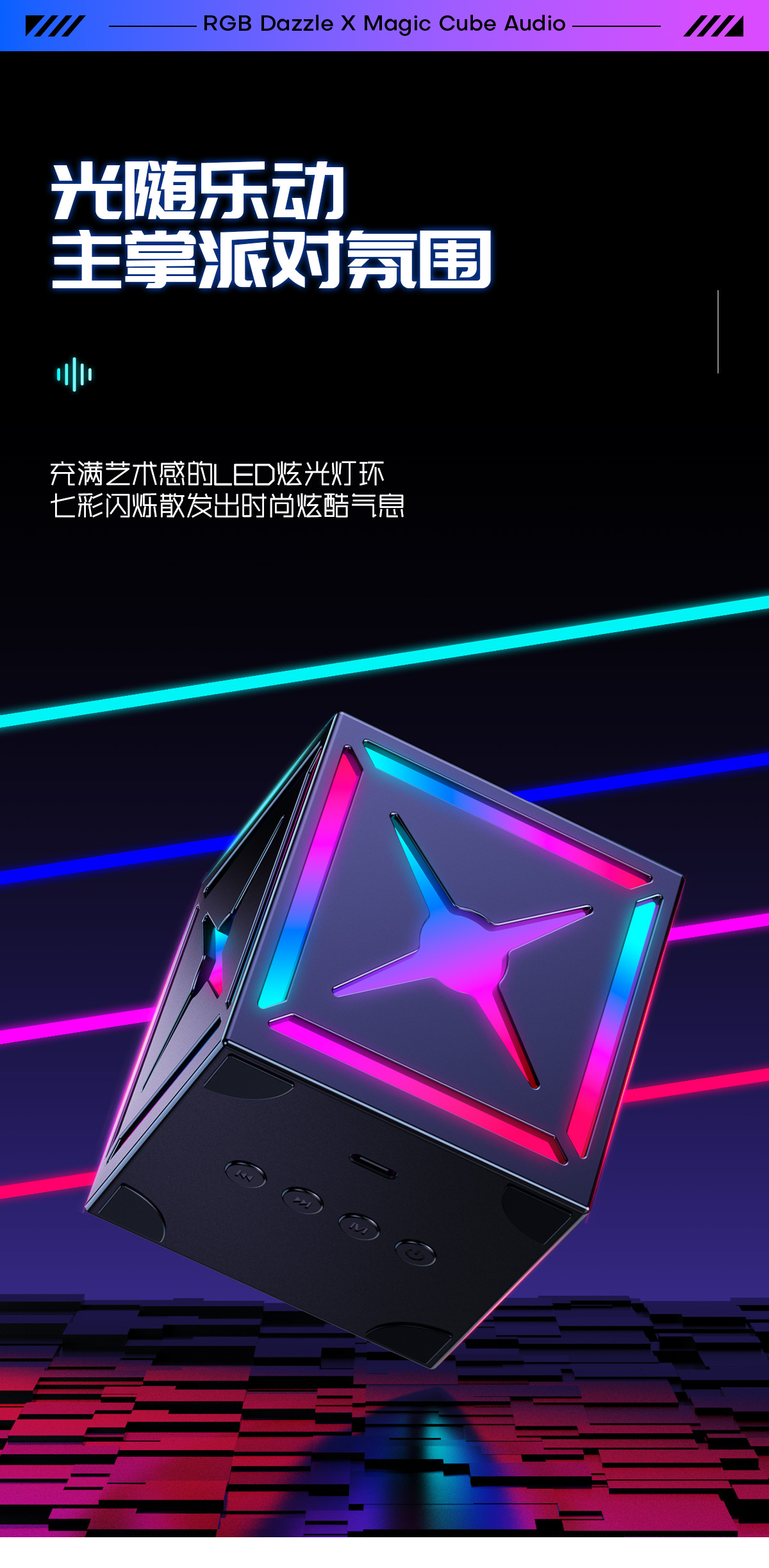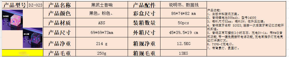 블랙 워리어 고음질 서브우퍼 무선 블루투스 스피커, 7색 조명 서브우퍼, 휴대용 무선 큐브 스피커