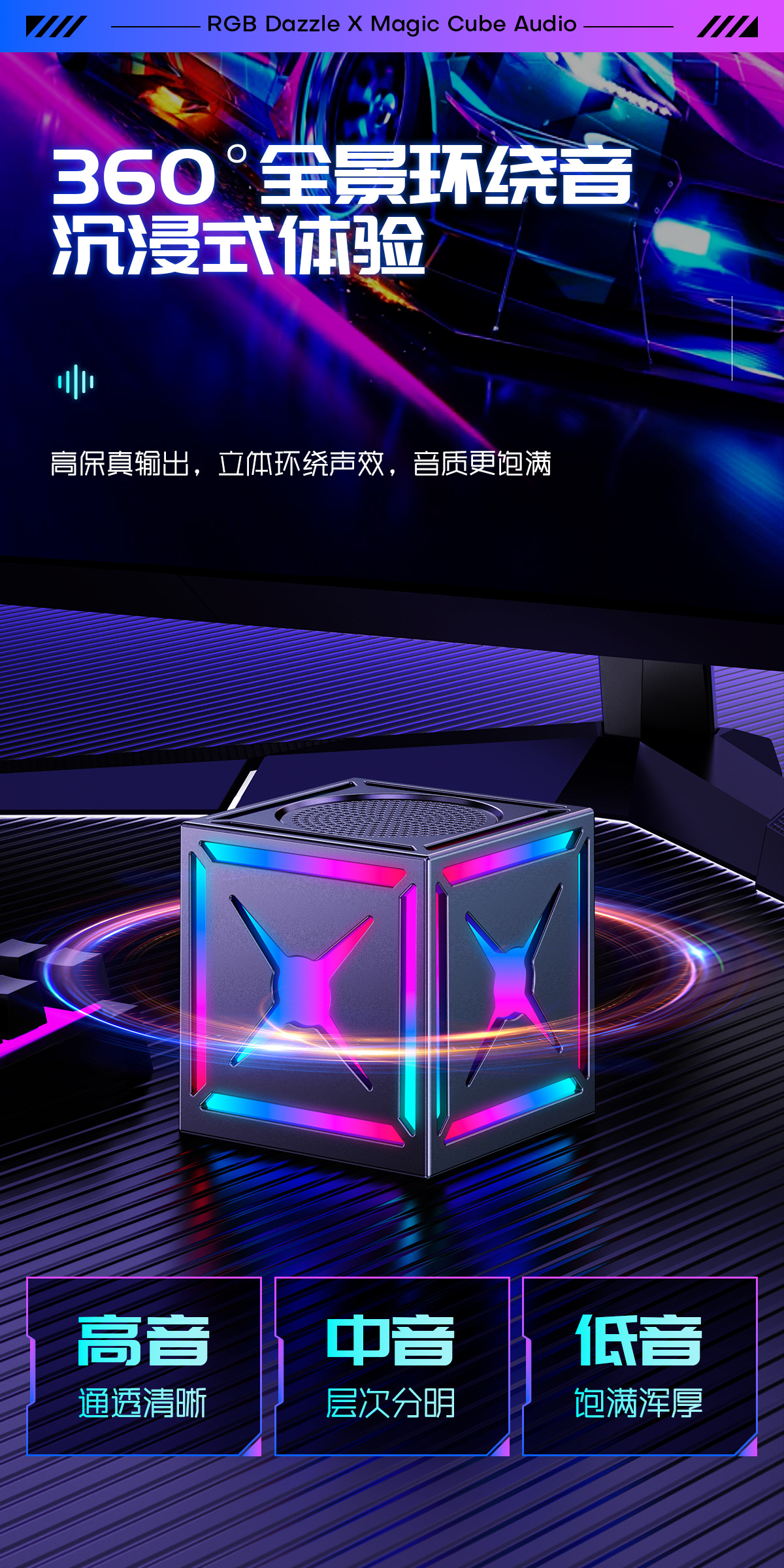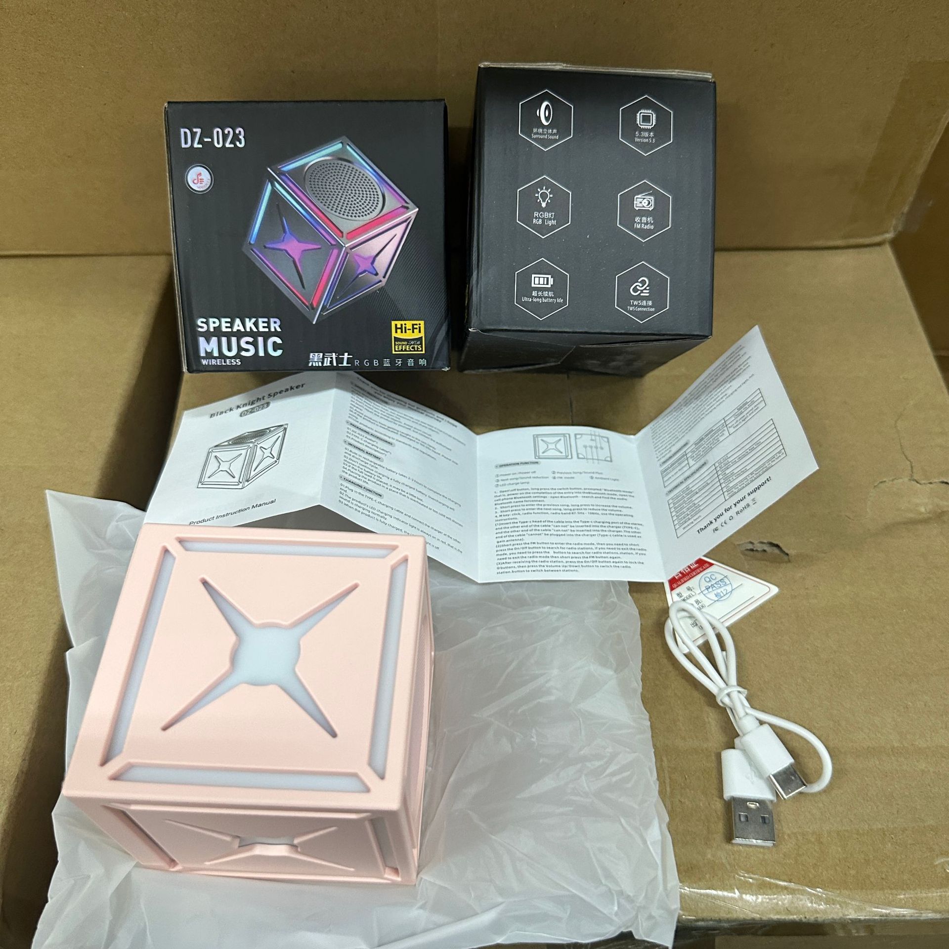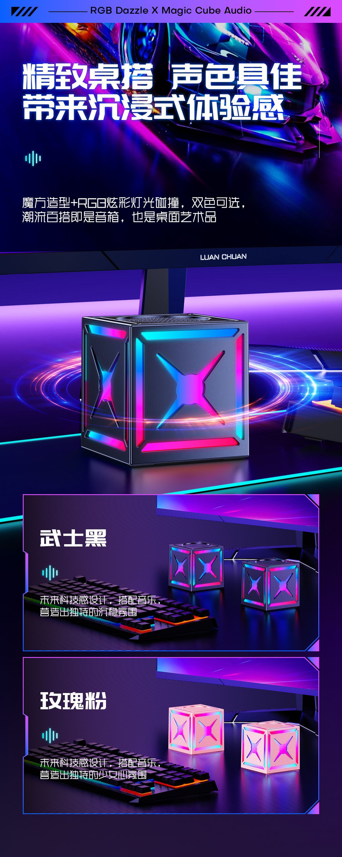 블랙 워리어 고음질 서브우퍼 무선 블루투스 스피커, 7색 조명 서브우퍼, 휴대용 무선 큐브 스피커