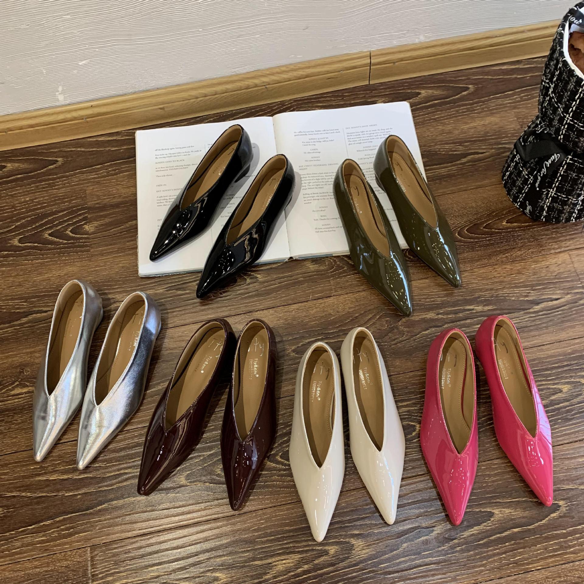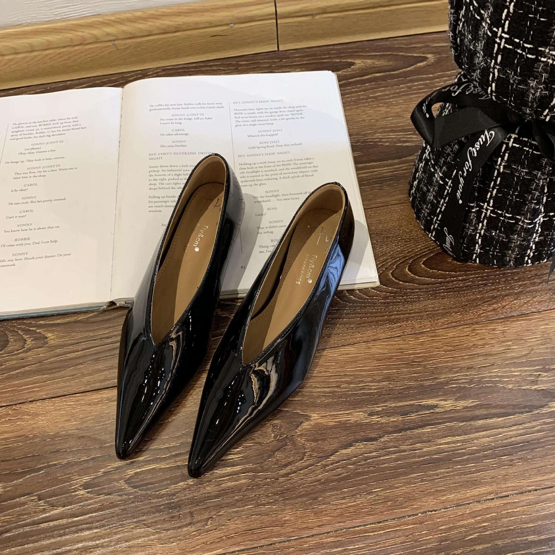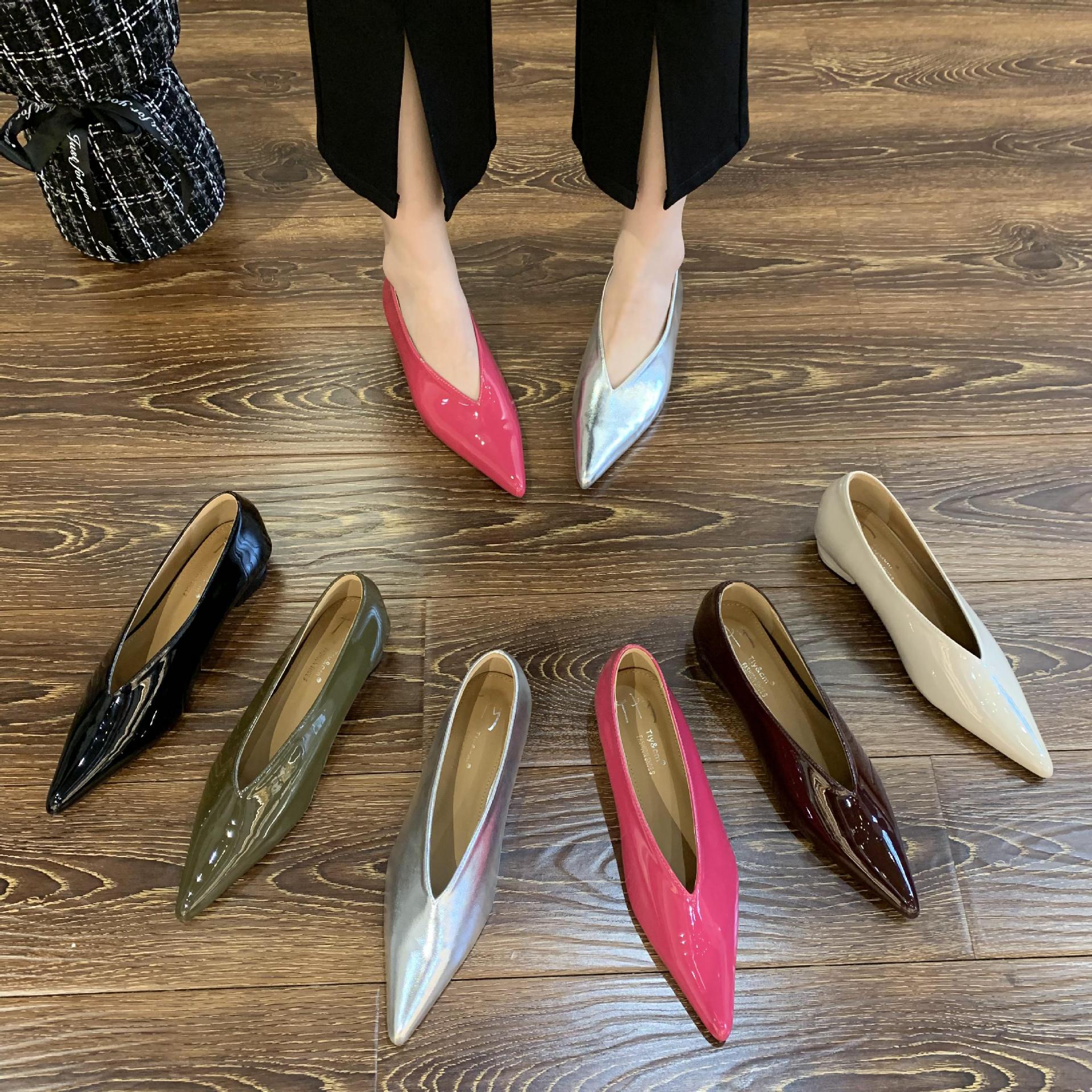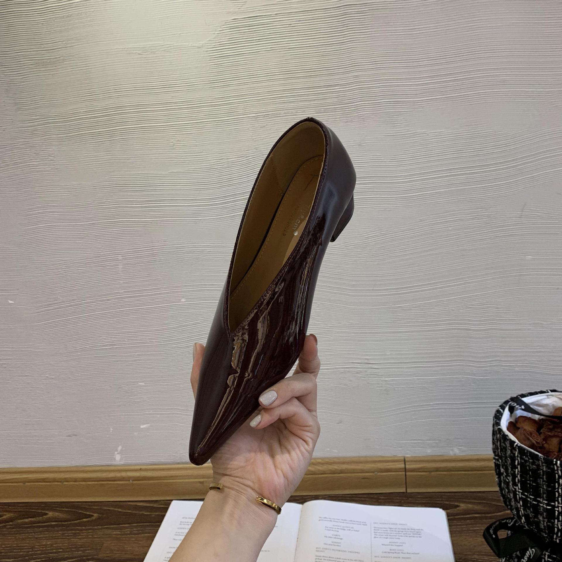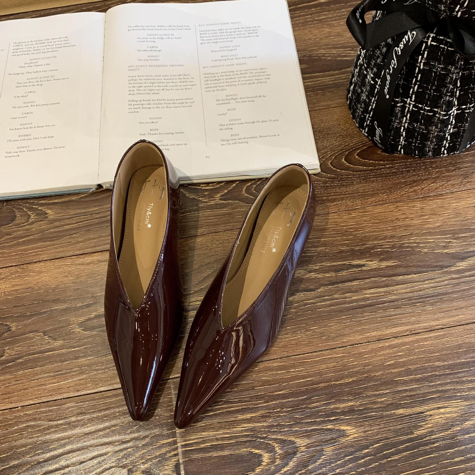 2023 가을과 겨울 새로운 두꺼운 굽 뾰족한 V-입 빈티지 밀크 신발 여성용 편안한 모든 매치 부드러운 에나멜 가죽 미드 힐 싱글 레이어 신발