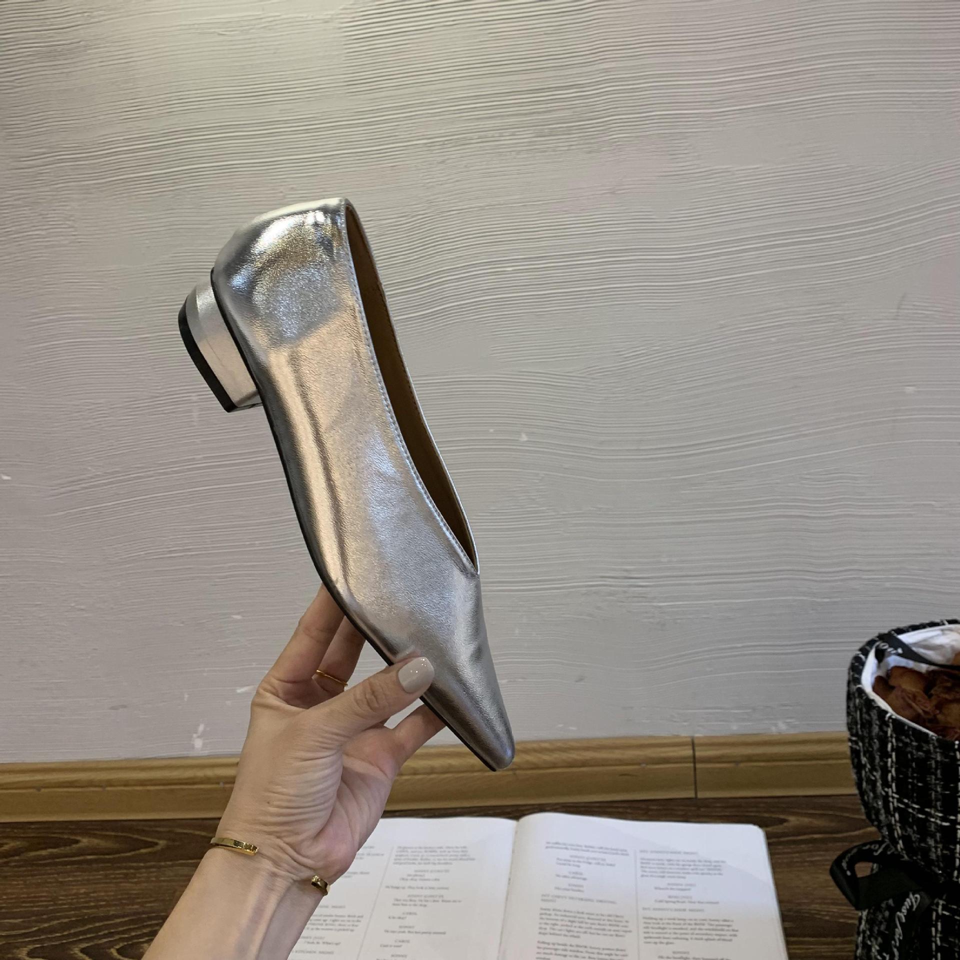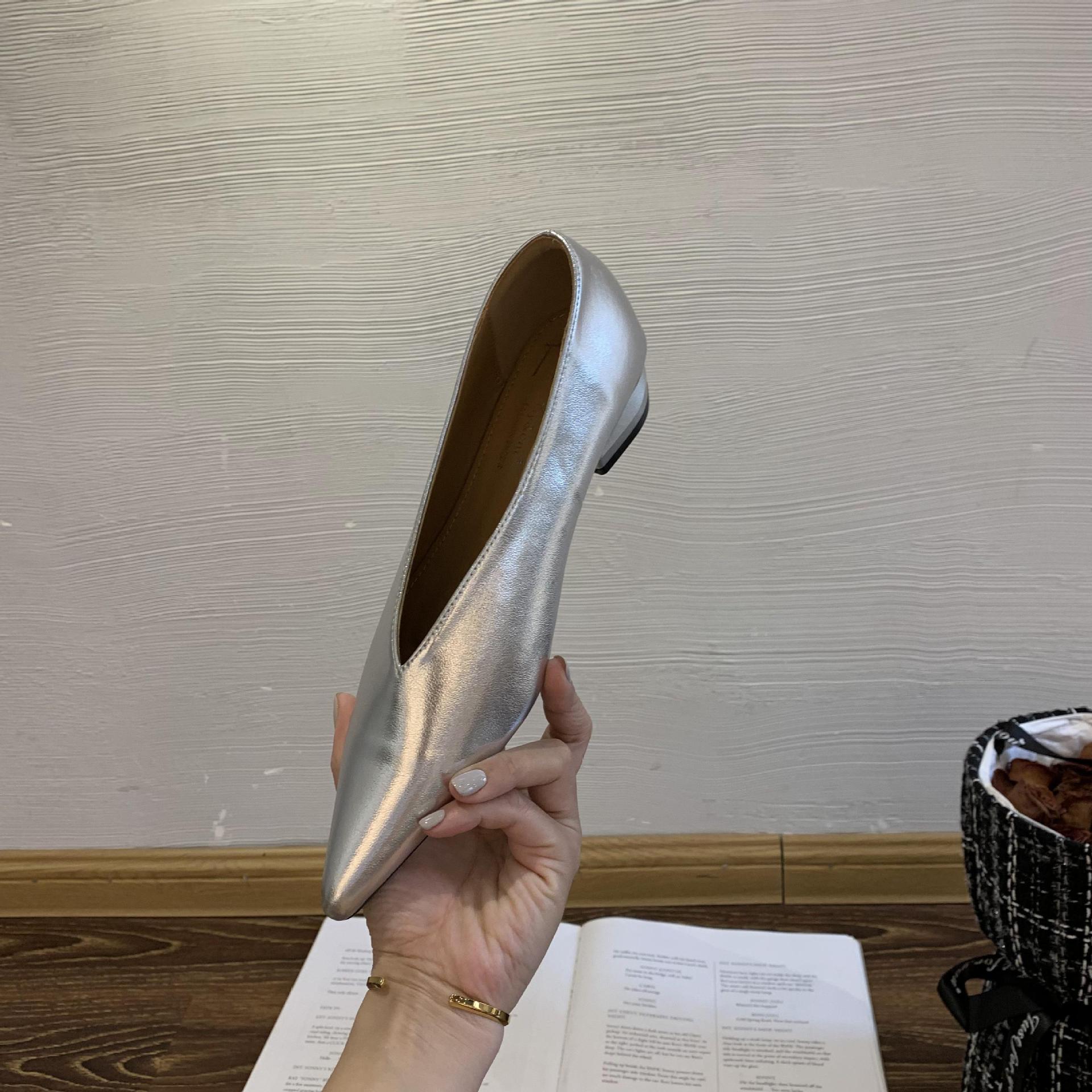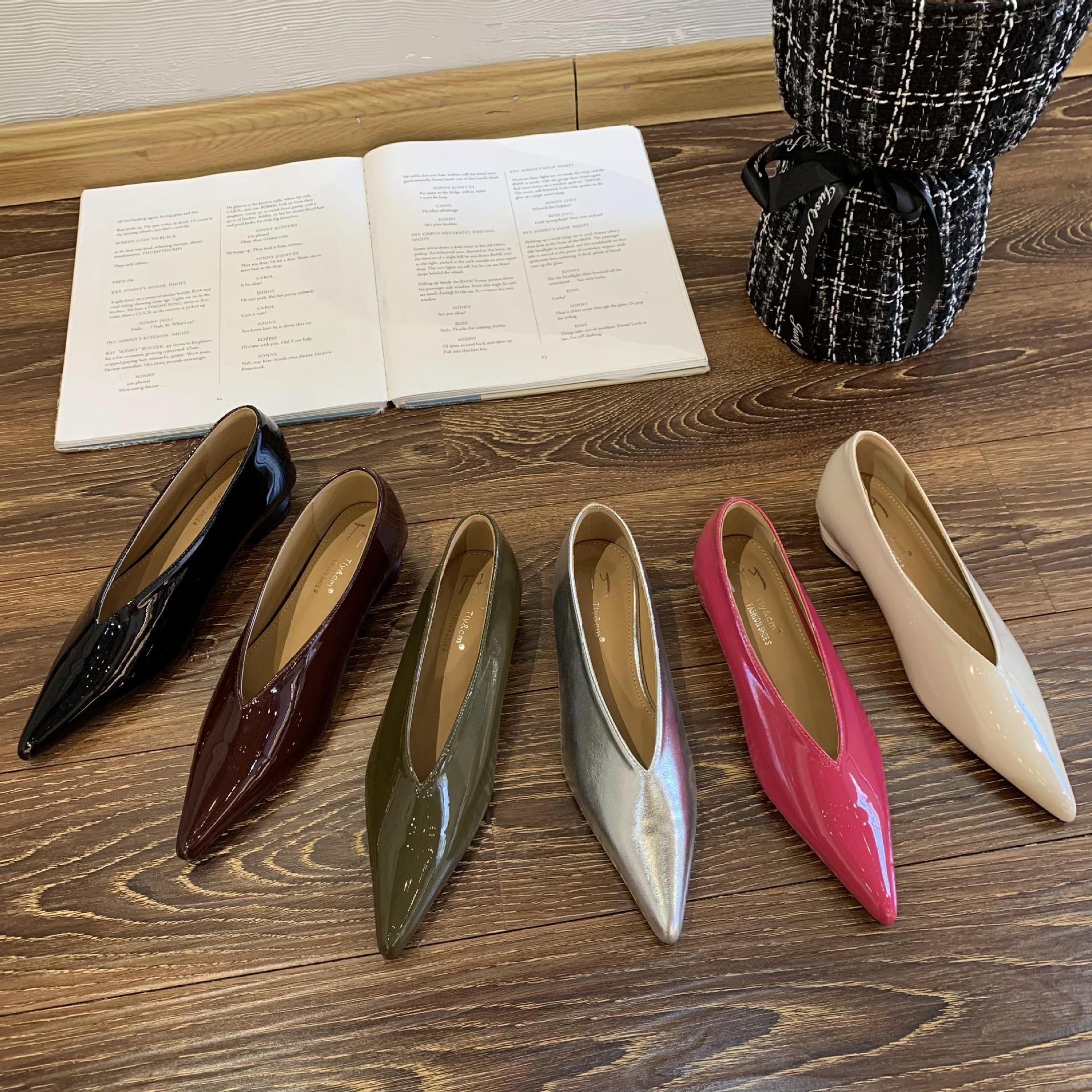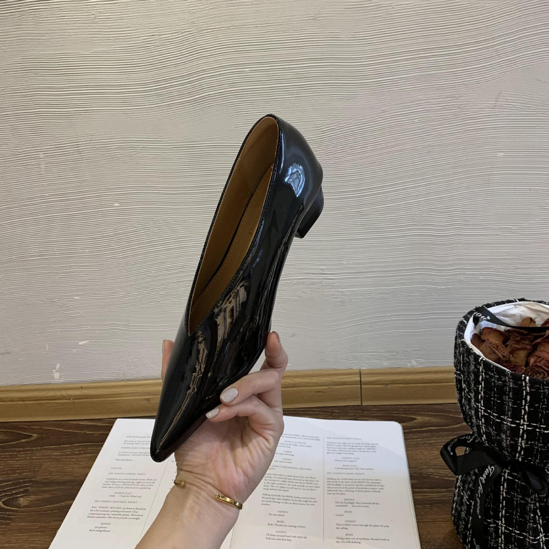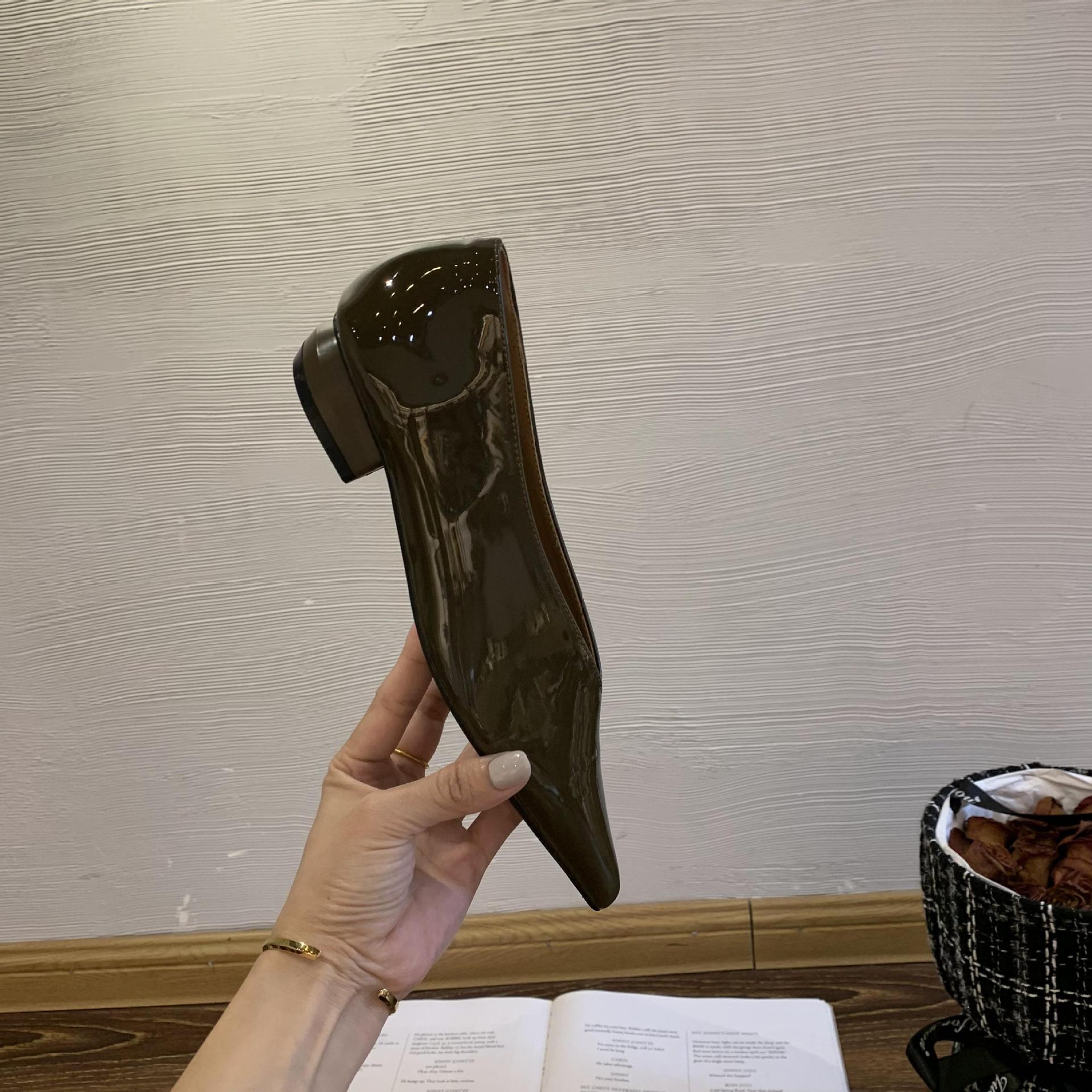 2023 가을과 겨울 새로운 두꺼운 굽 뾰족한 V-입 빈티지 밀크 신발 여성용 편안한 모든 매치 부드러운 에나멜 가죽 미드 힐 싱글 레이어 신발
