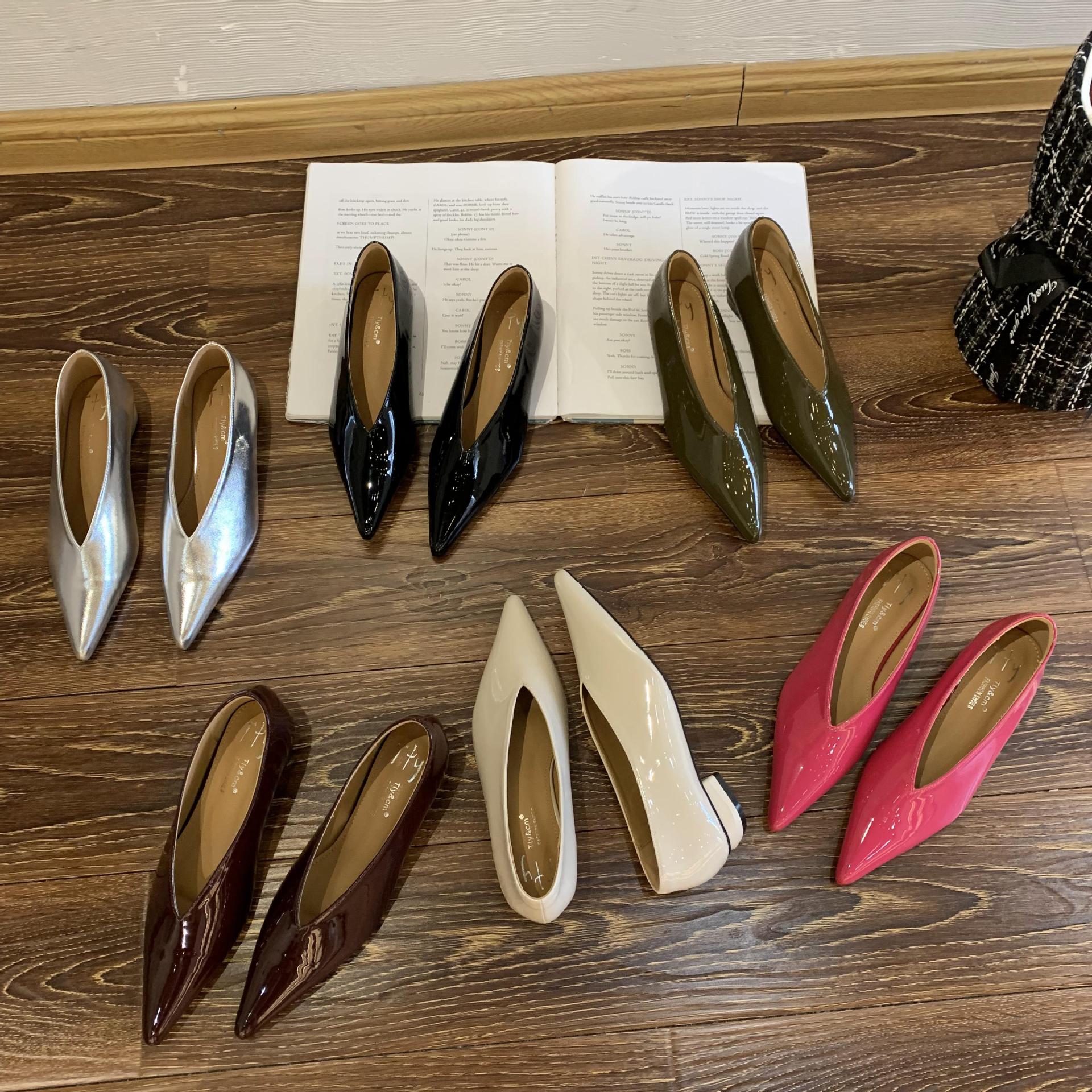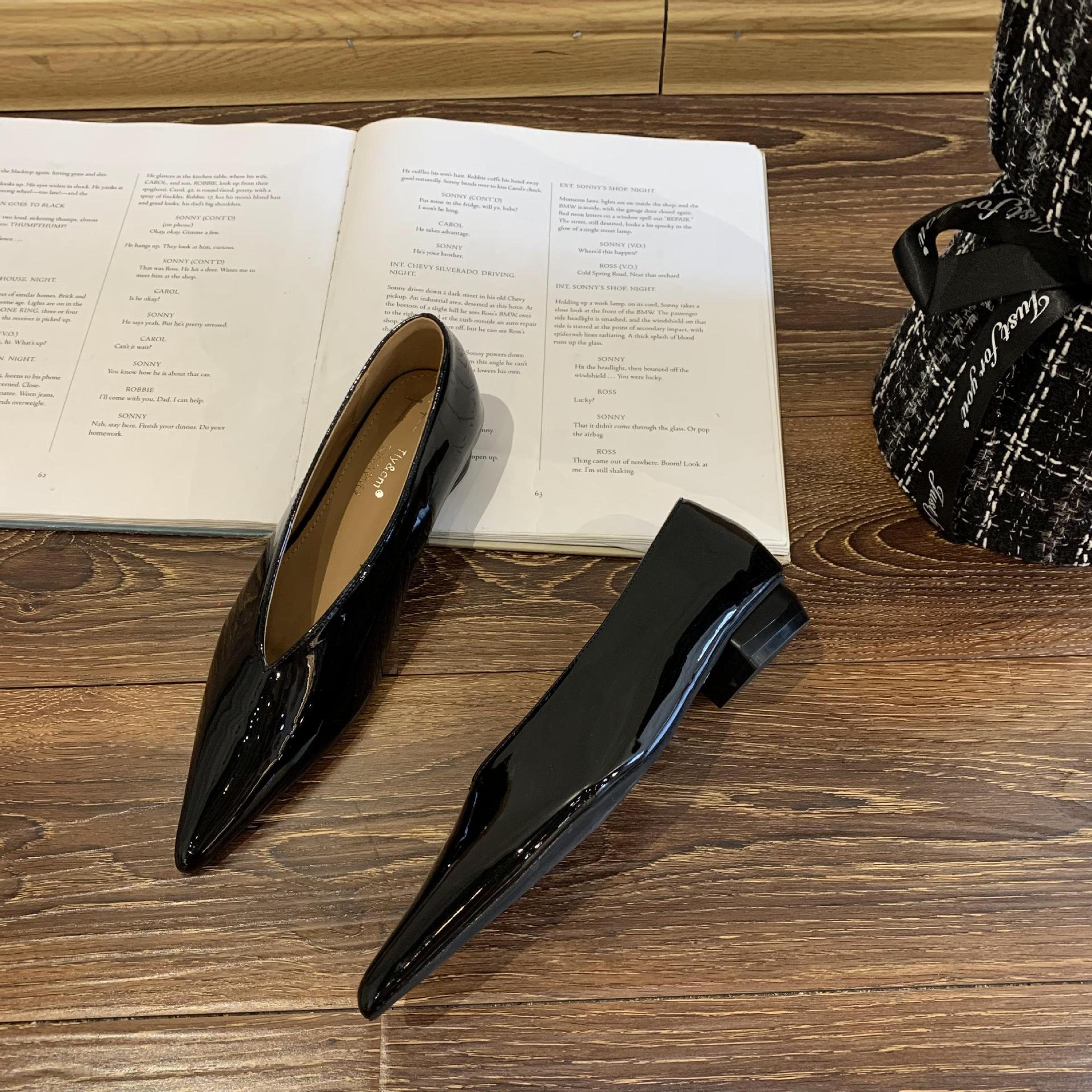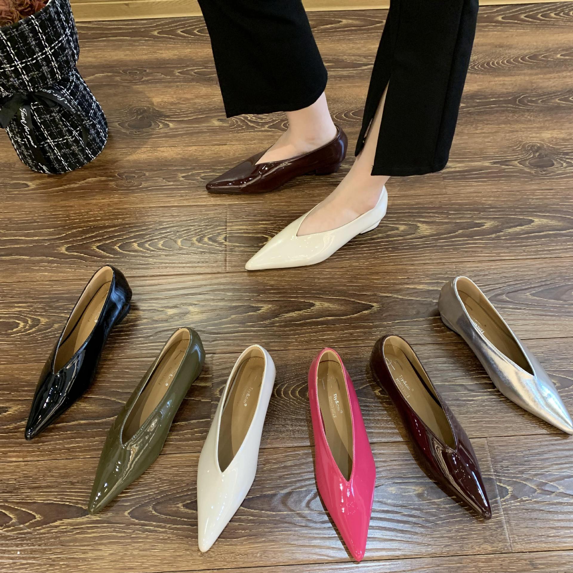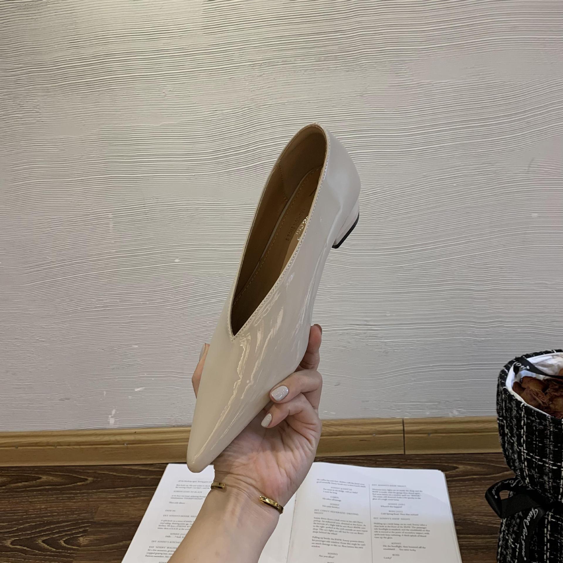 2023 가을과 겨울 새로운 두꺼운 굽 뾰족한 V-입 빈티지 밀크 신발 여성용 편안한 모든 매치 부드러운 에나멜 가죽 미드 힐 싱글 레이어 신발스토어 가기